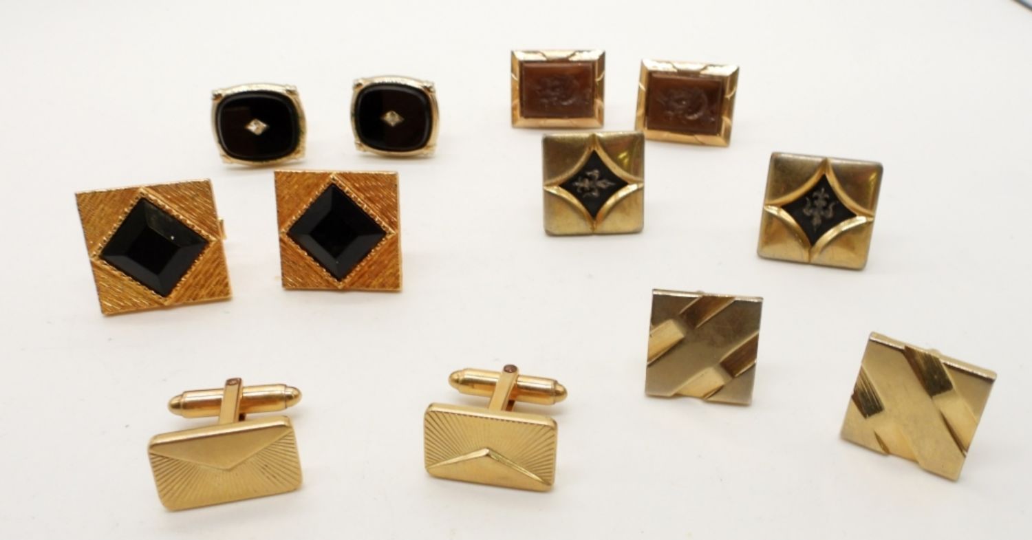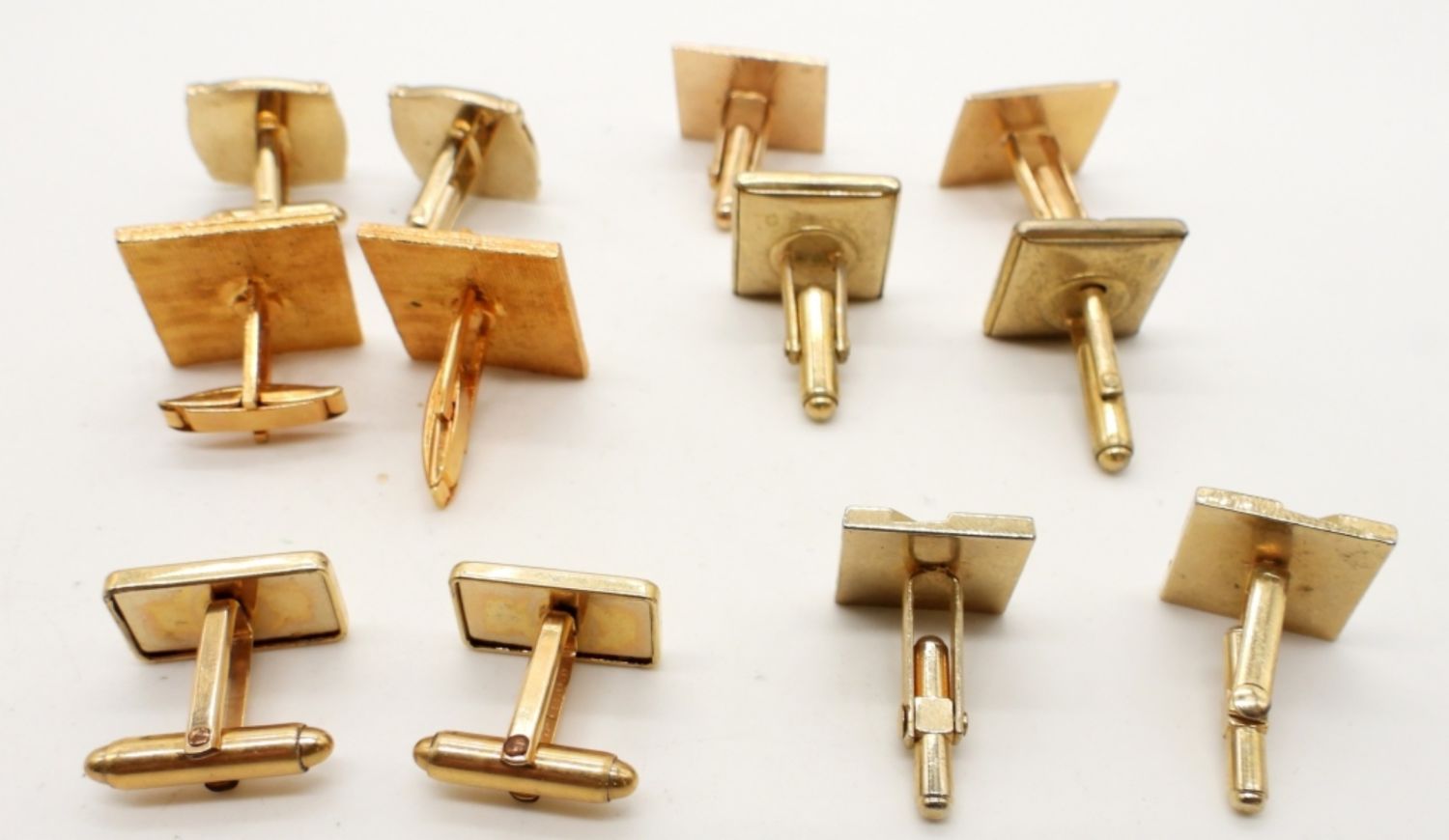 GOLD TONE, TOGGLE BACKINGS, 1 CAMEO, 1 ENVELOPE, 1 ARROW DESIGN, 1- BLACK ONYX, 1 BLACK ONYX WITH WHITE INLAY STONE, 1 GOLD TONE W SYMBOL IN THE MIDDLE