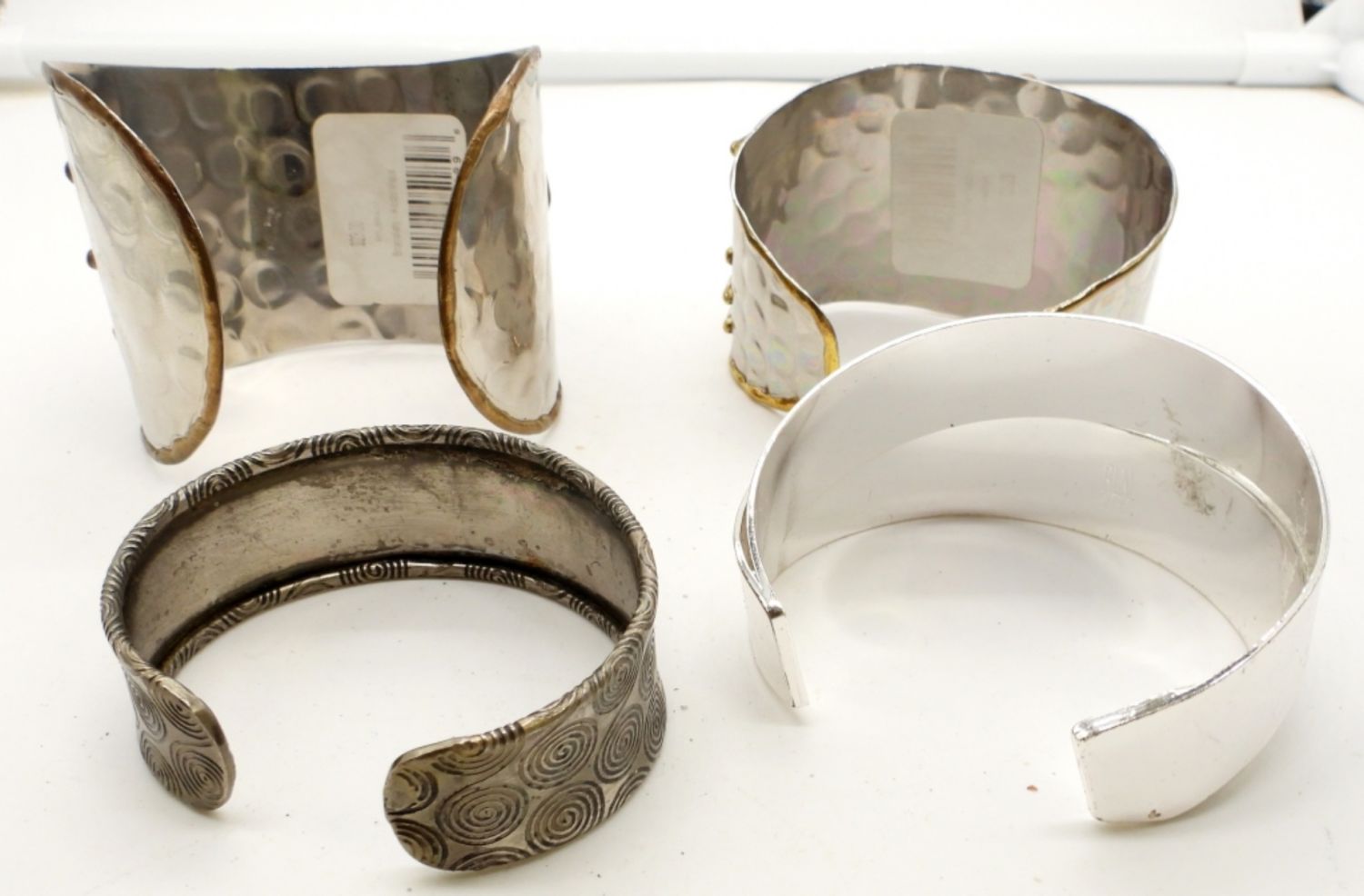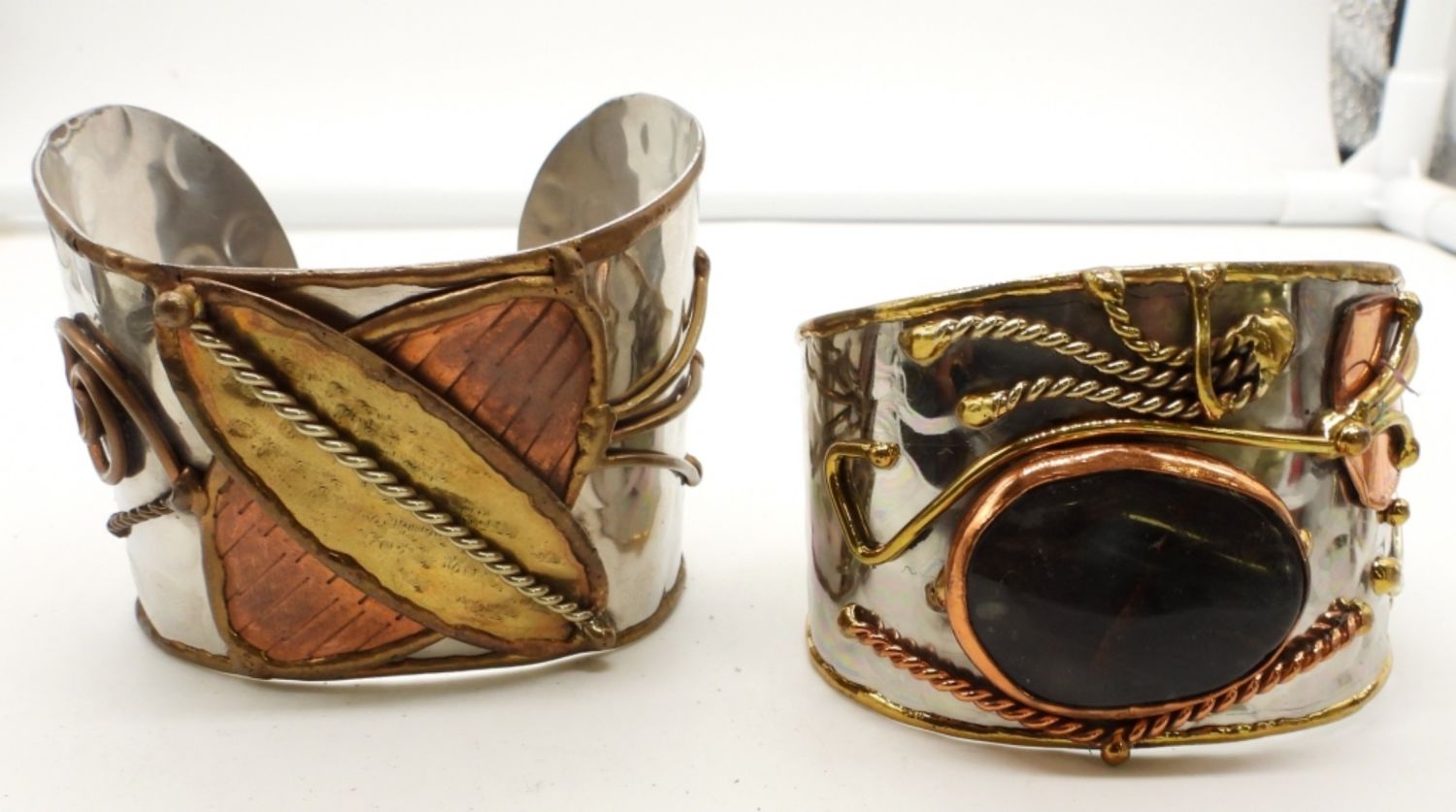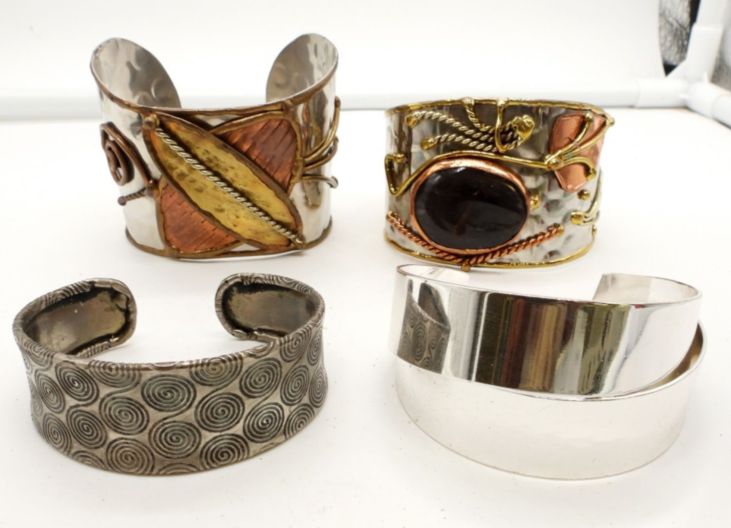 ALL CUFFS ARE 7 – 7 1/2 AROUND WITH GAP, 1 SPIRAL DESIGN SMALL CUFF, 1 ALL SILVER RLM SOHO BRAND MEDIUM CUFF, XL LARGE CUFF WITH A LEAF DESIGN SILVER, COPPER, GOLD TONES, 1 LARGE CUFF WITH COPPER, SILVER, GOLD TONES W A BROWN NATURAL STONE