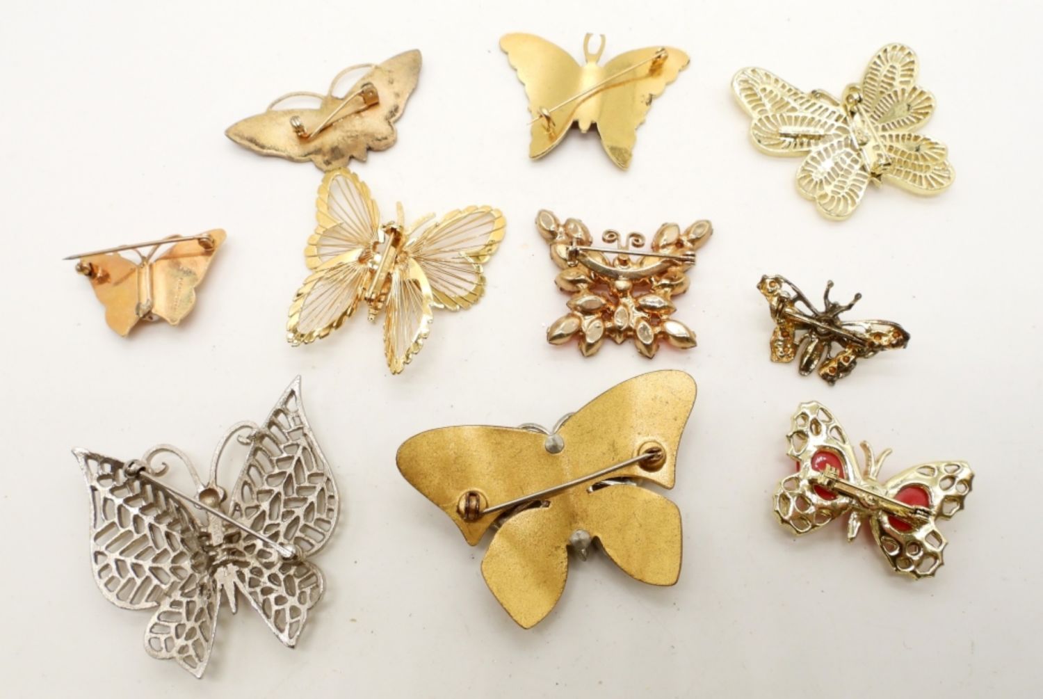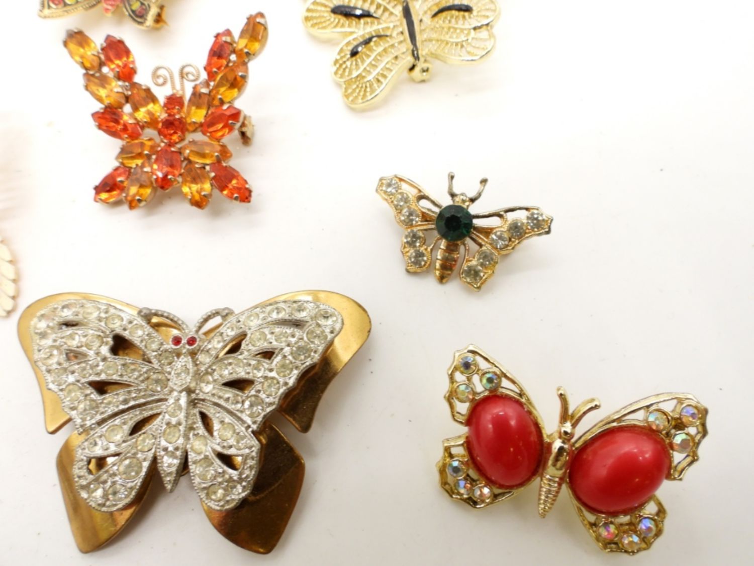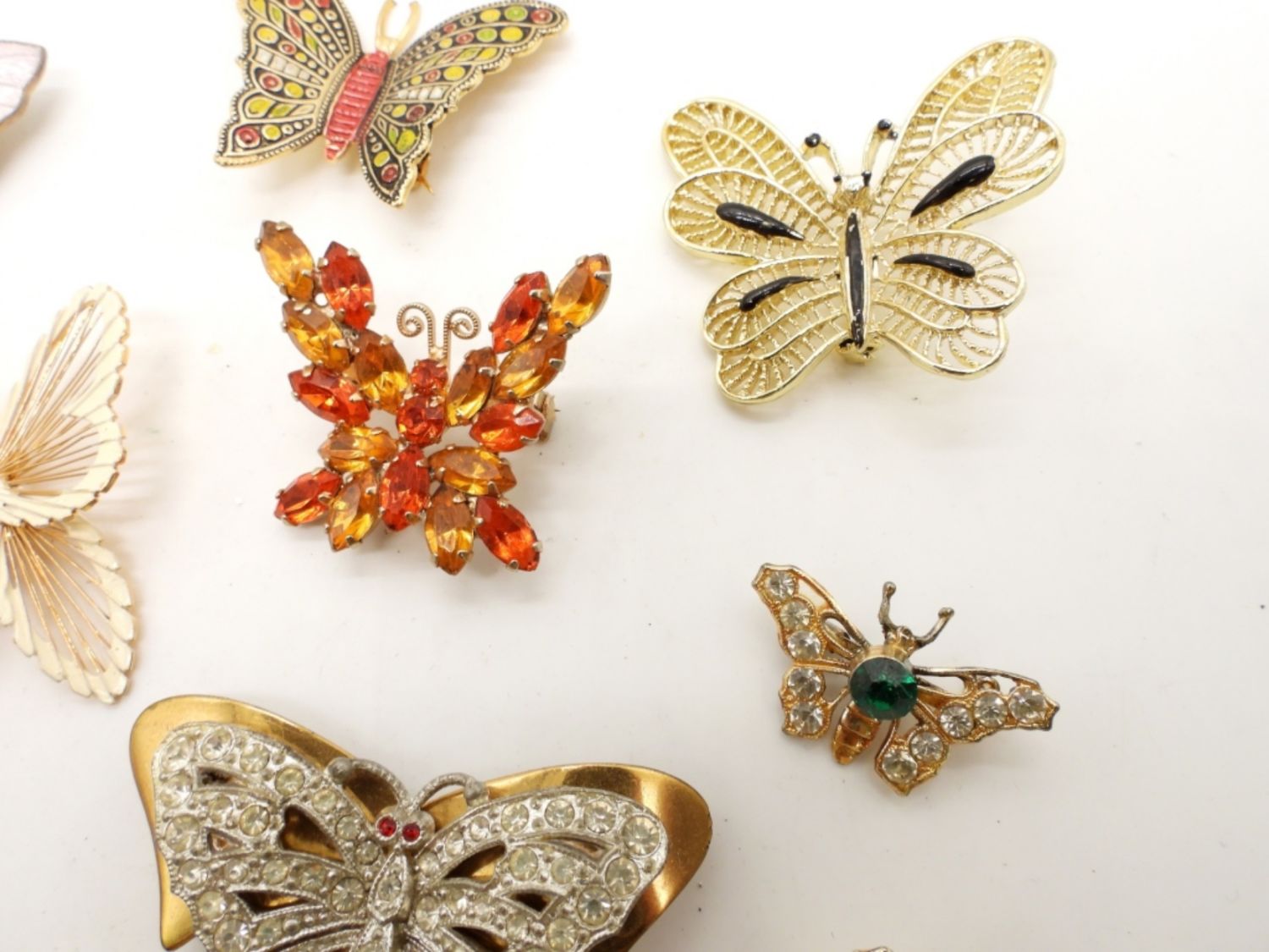 ALL 2IN OR UNDER, 1- MONET GOLD TONE WITH WHITE INLAY AROUND, 1 GERRY’S BRAND ALL GOLD TONE WITH BLACK ONYX INLAY, 1 AVON TWO TONE WITH BLUE STONES FOR EYES, 2- ENAMEL, 1 GOLDTONE WITH FAUX PEARLS IN THE MIDDLE, 1 ORANGE RHINESTONE, 1- GOLD TONE CLEAR STONES AND A GREEN STONE, 1- TOW TOWN WITH CLEAR STONES, 1- WITH RED AND CLEARS STONES GOLD TONE