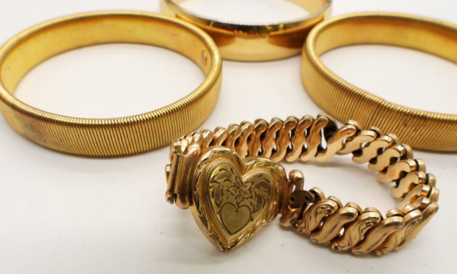 2- WIRE STRETCHY BRACELETS, 1- HEART ACCORDION STYLE STRETCH BAND, AND 1 GOLD TONE BANGLE