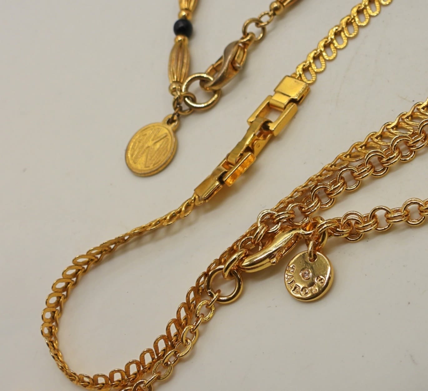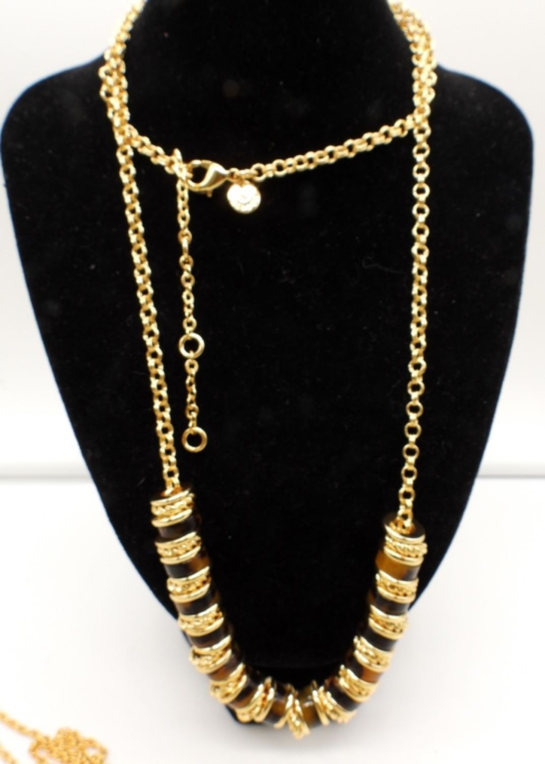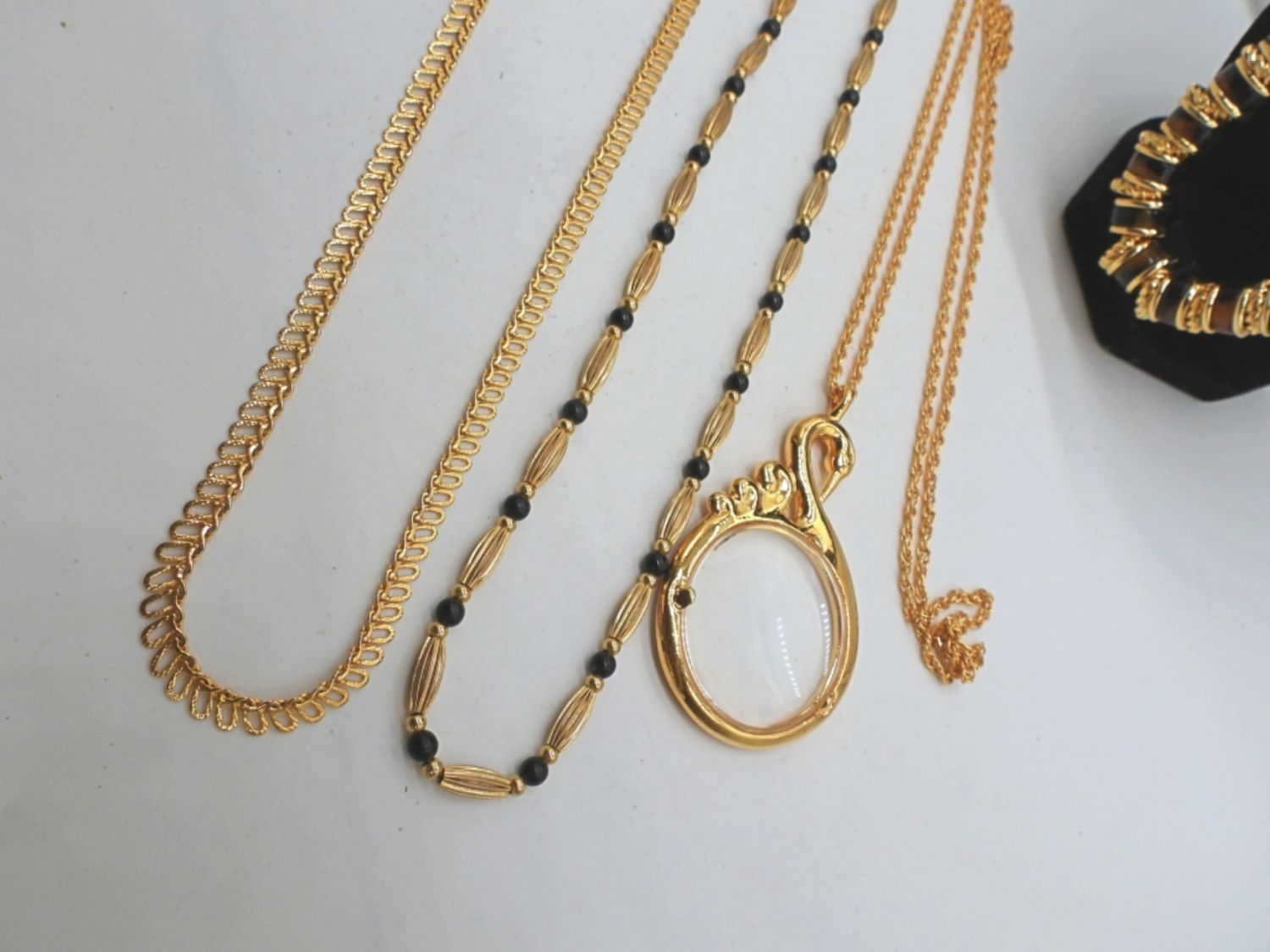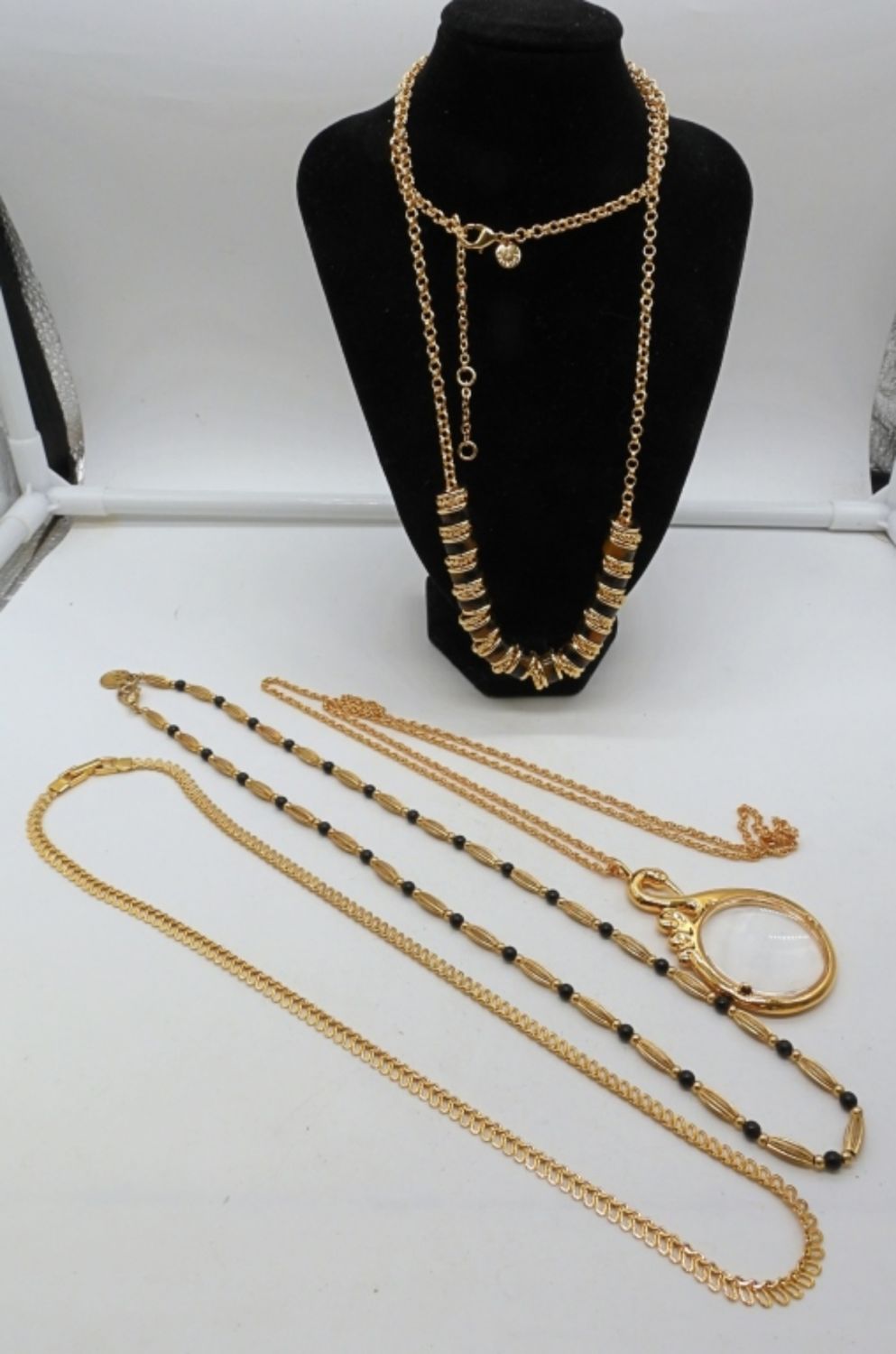 1- 22IN LONG PLAIN GOLD TONE CHAIN, 1- 23IN LONG WITH BLACK ONYX BEADS AND GOLD TONE BEADS, 1- TALBOT 35IN LONG, GOLD TONE CHAIN W/ GOLD TONE DISCS CHARMS, ADJUSTABLE, 1- AVON SWAN MAGNIFYING GLASS NECKLACE, 36IN LONG WITH MAGNIFYING GLASS