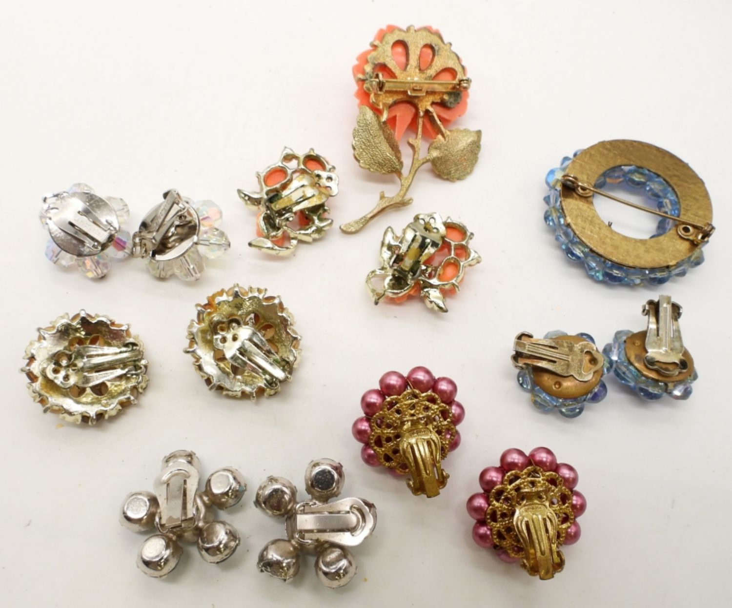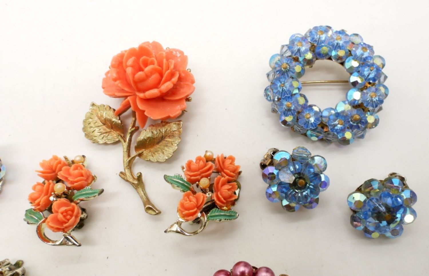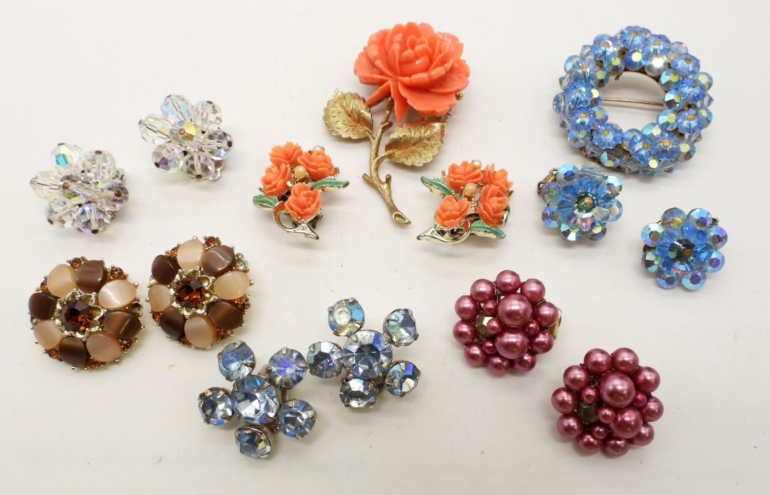 1- ROSE PAIR W MATCHING ROSE BROOCH 2 1/2IN LONG, 1- BABY BLUE RHINESTONES W/ MATCHING CIRCLE BROOCH 2IN LONG, 1 PURPLE BEAD PAIR, 1- CLEAR RHINESTONE PAIR, 1 BLUE RHINESTONE PAIR, 1 BROWN AND TAN PAIR