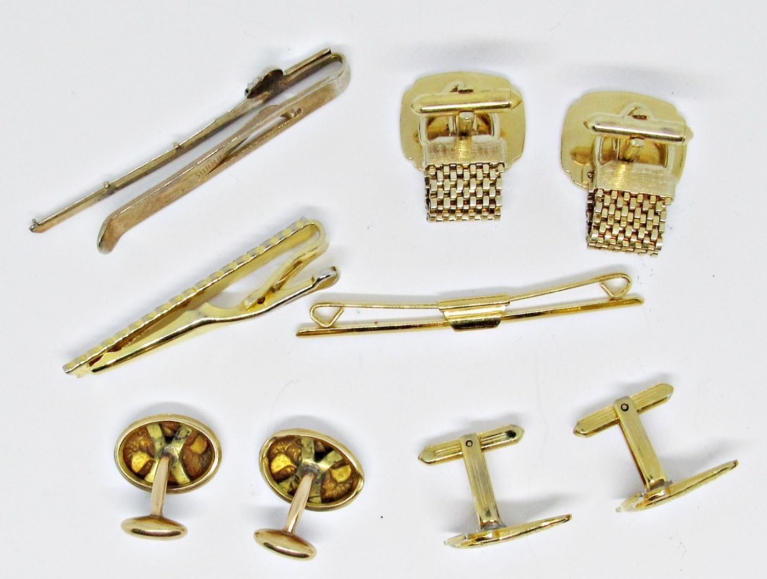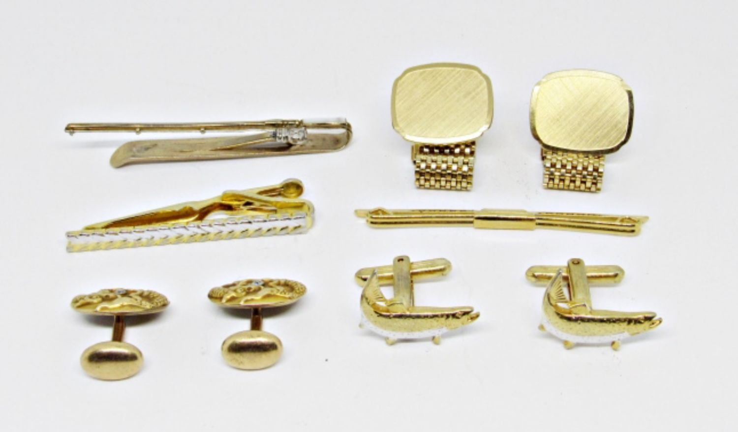 CUFFLINKS- 1 ALL GOLDTONE, 2 – FISH CUFFLINKS, TIE CLIPS-1 TWO TONE,1 FISHING POLE, AND 1 GOLD TONE