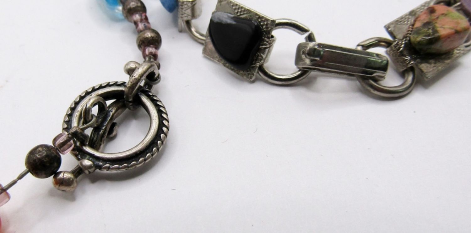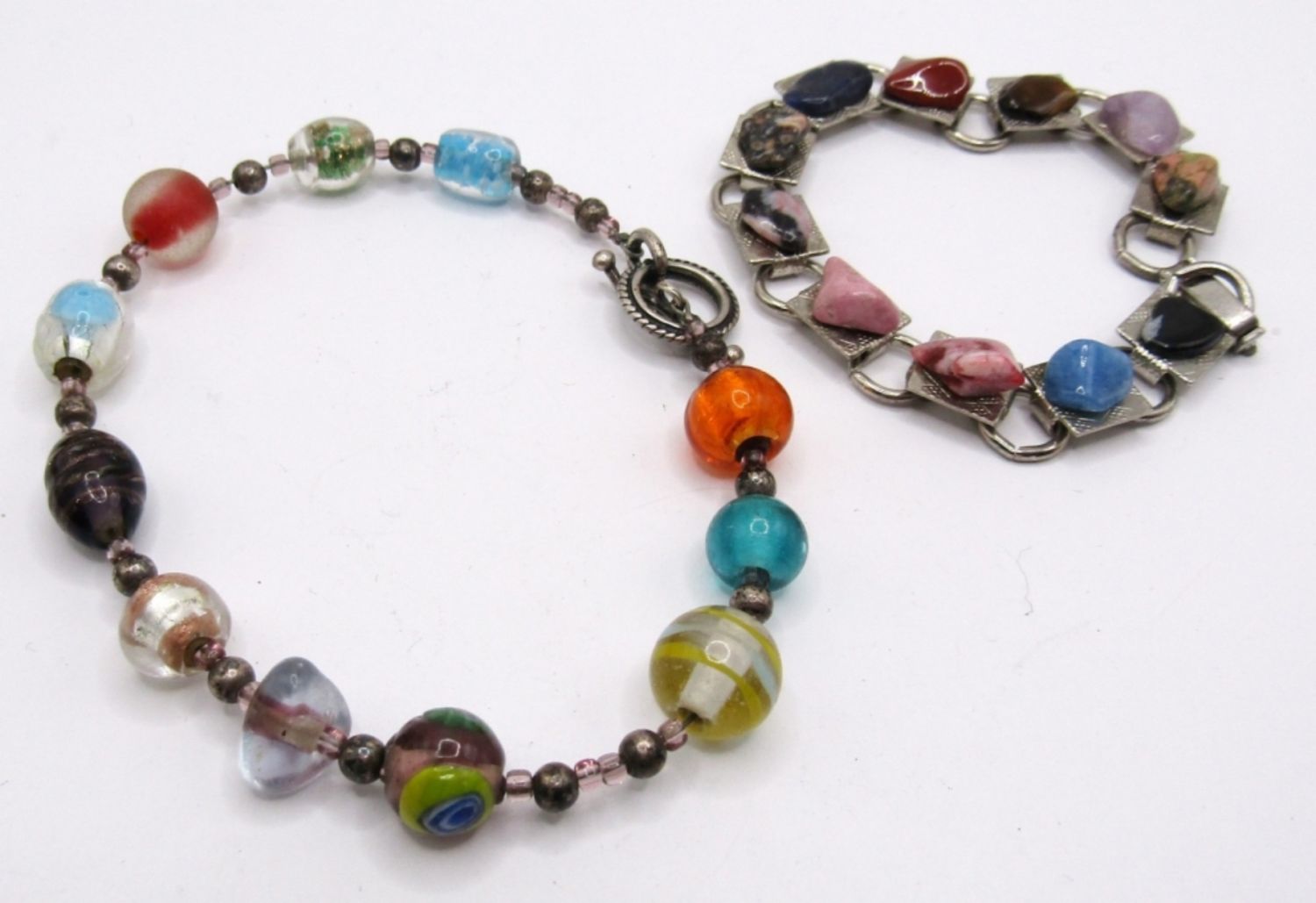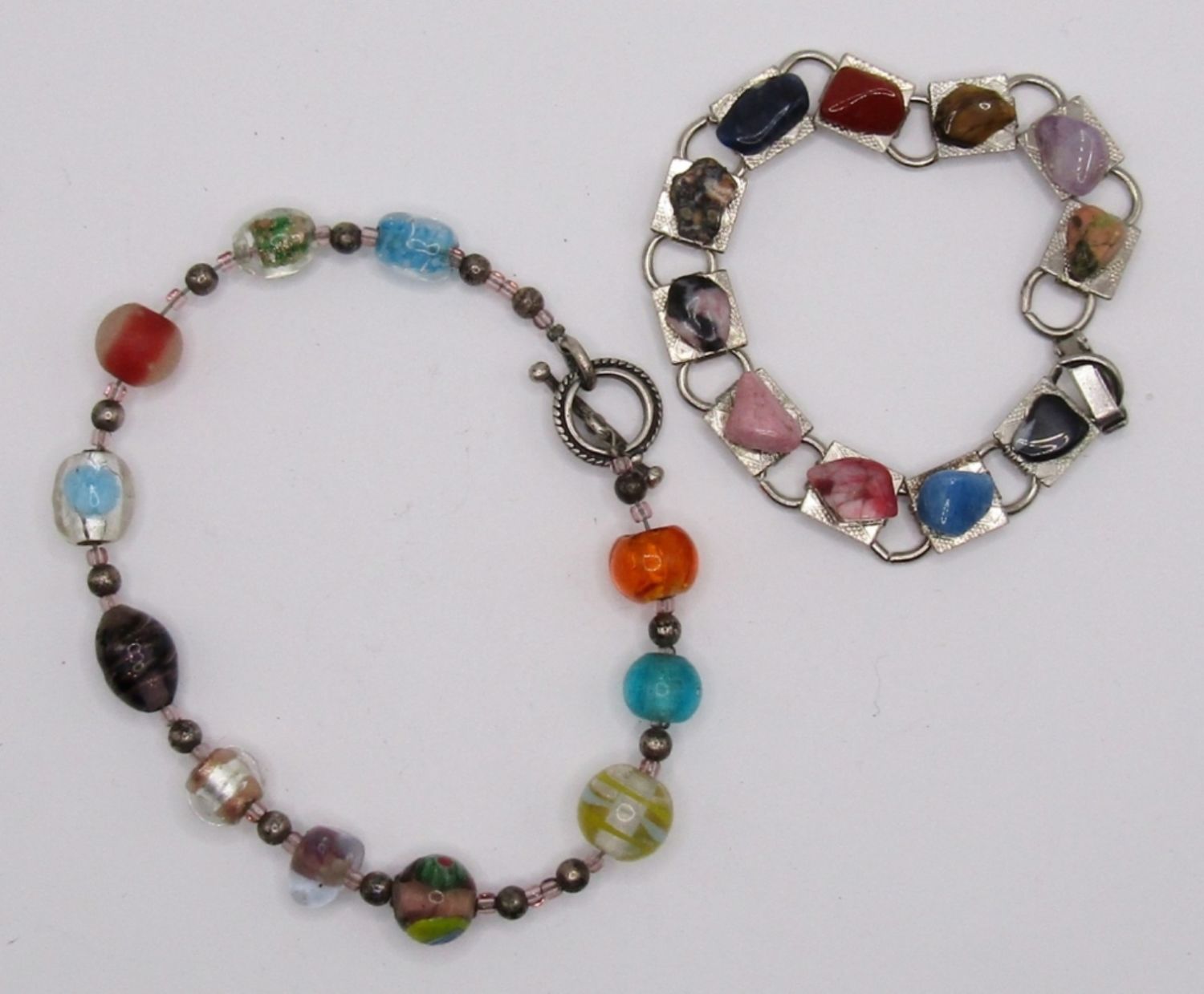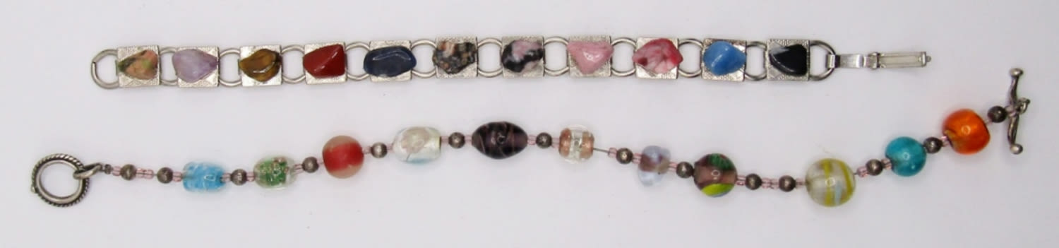 1- 11 DIFFERENT GLASS BEADS WITH TOGGLE CLASP; 1- 11 DIFFERENT STONES PLACED ON SILVER TONE BASE
