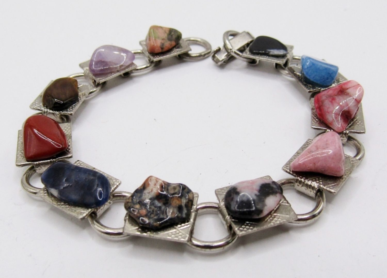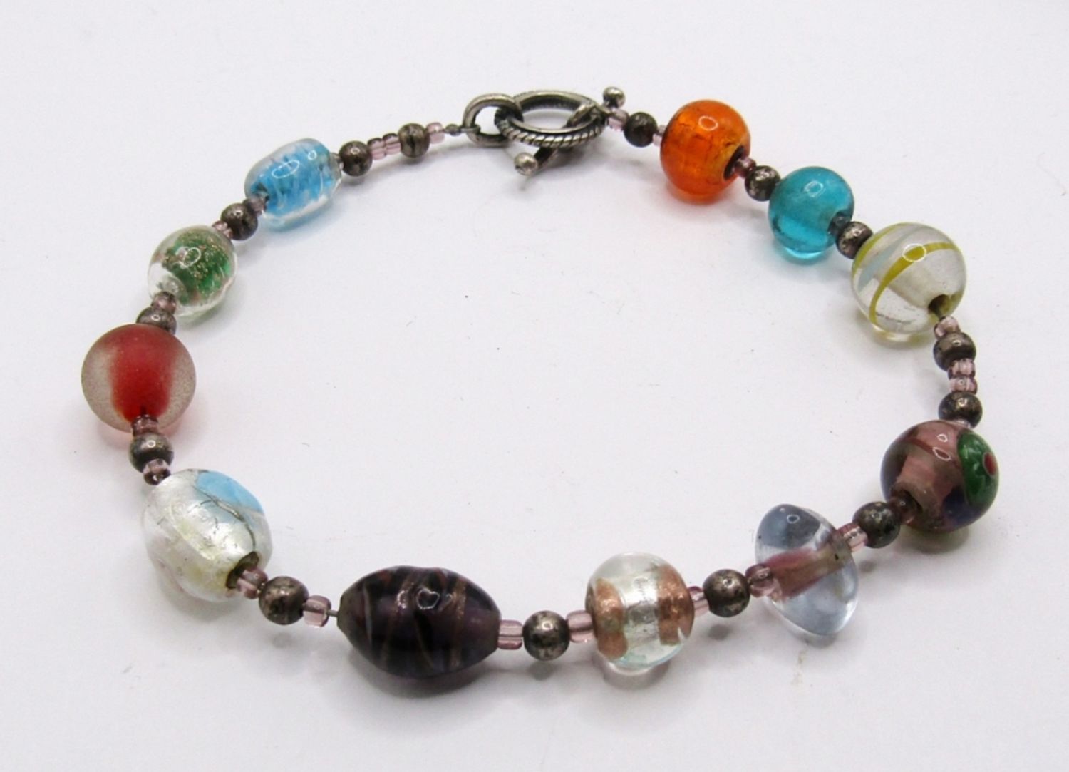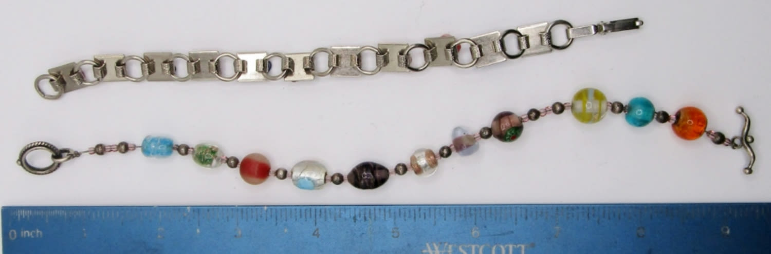 1- 11 DIFFERENT GLASS BEADS WITH TOGGLE CLASP; 1- 11 DIFFERENT STONES PLACED ON SILVER TONE BASE