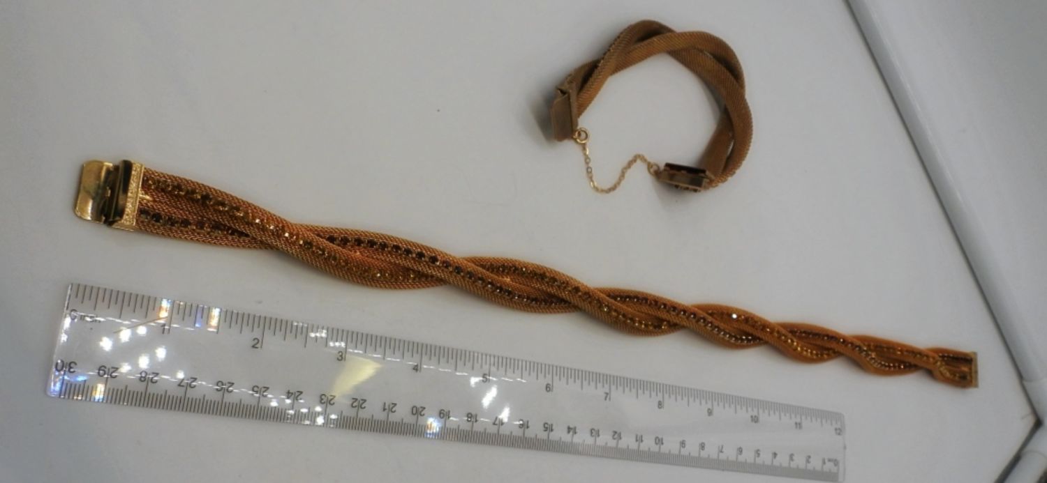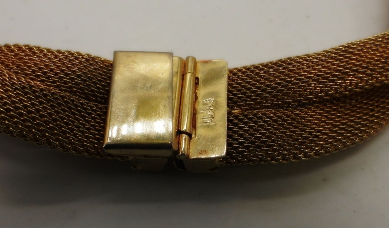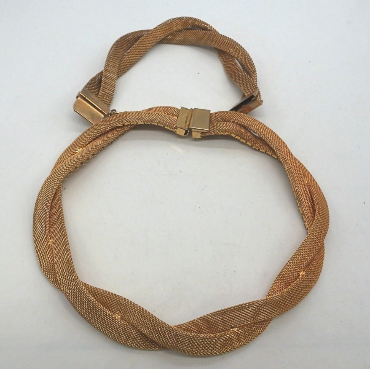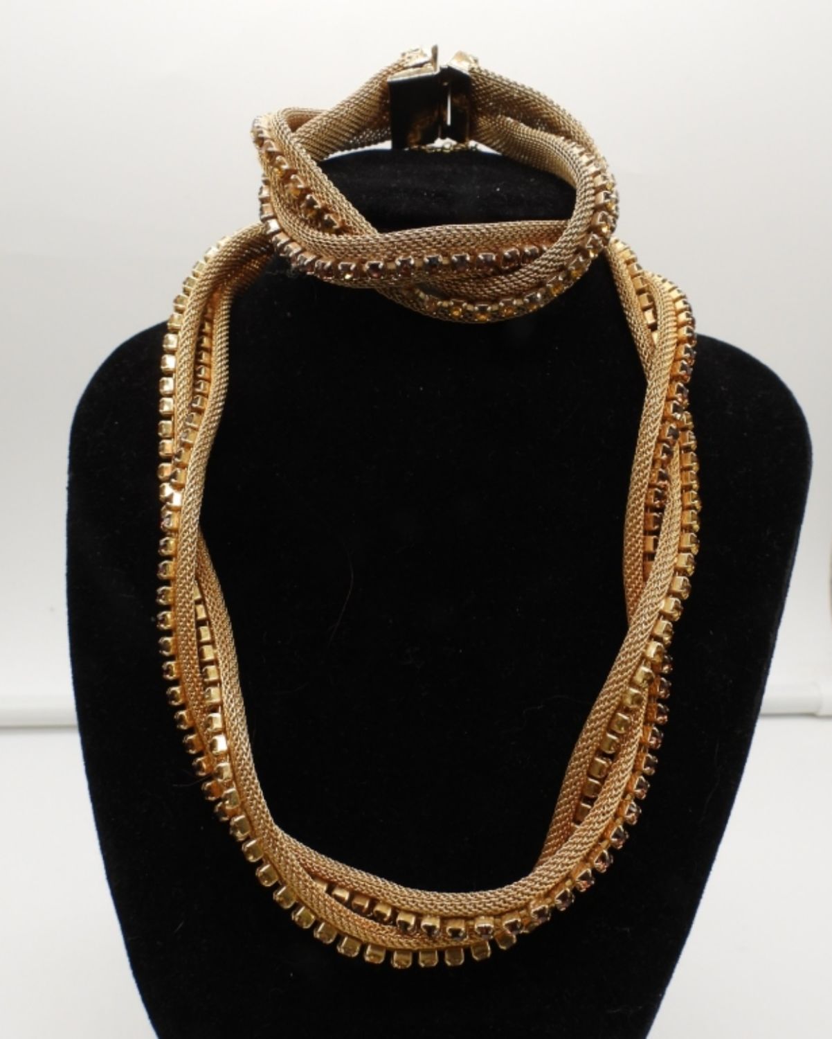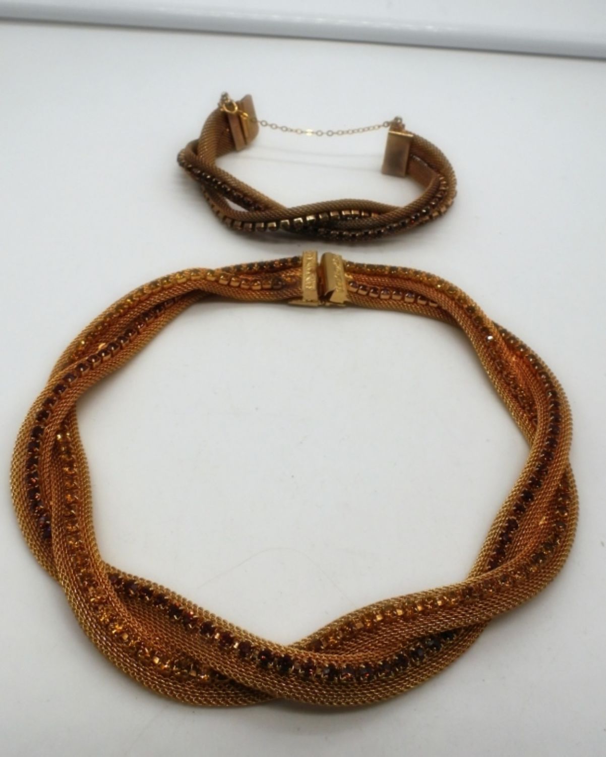 17IN LONG CHOKER, 8IN LONG FOR BRACELET GOLD TONE MESH CHAIN W/YELLOW & BROWN CLEAR STONES, BOX CLASP ON BOTH, STOP STAMPED BEHIND CLASP HOBE