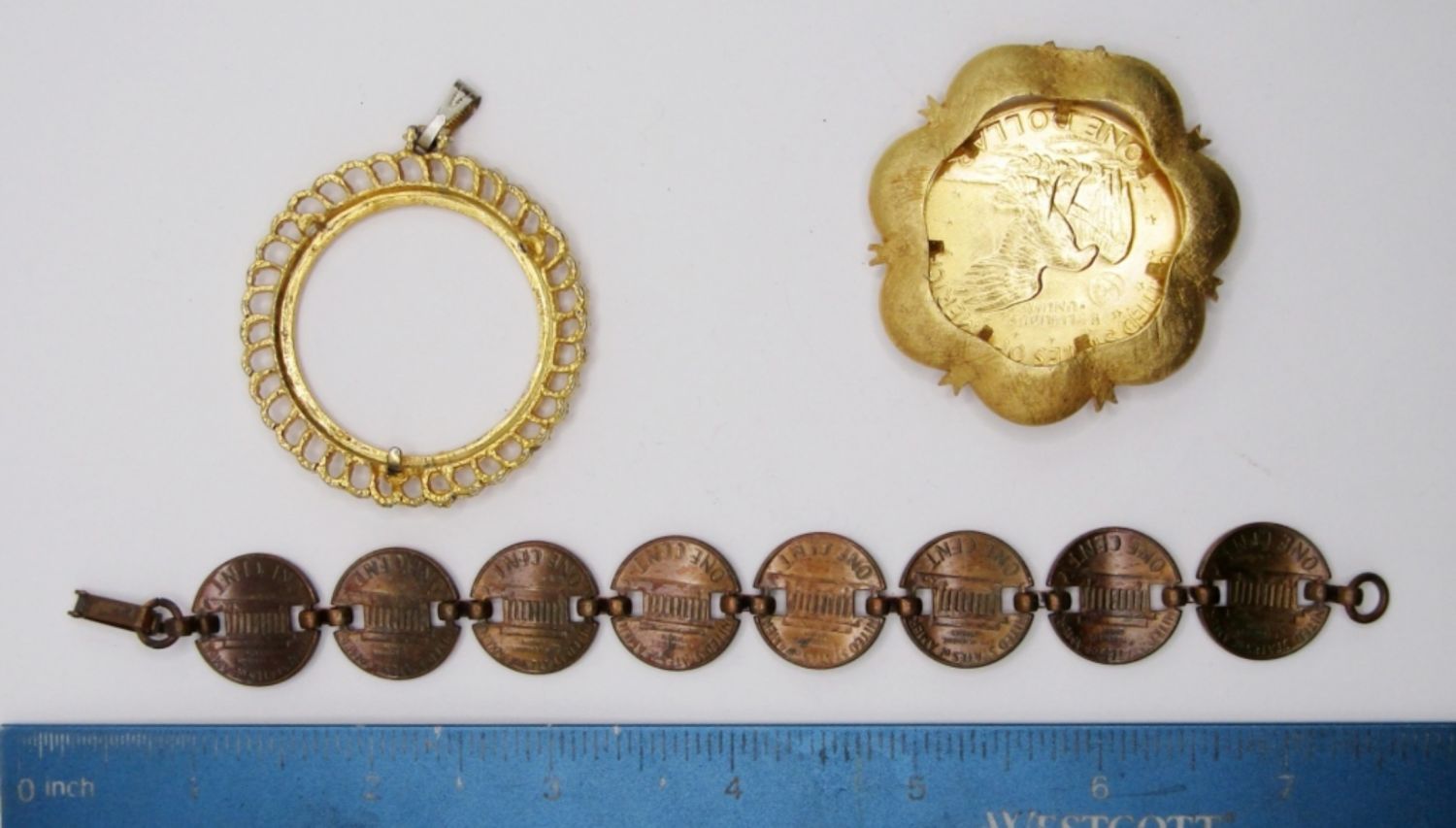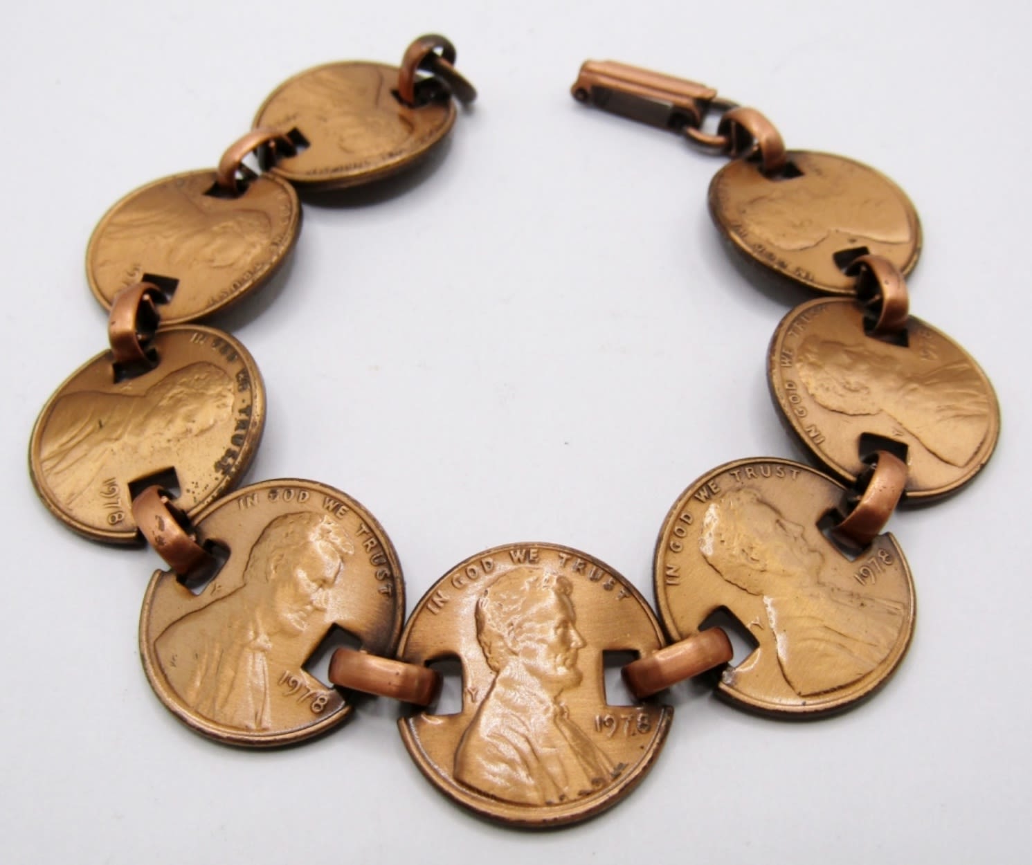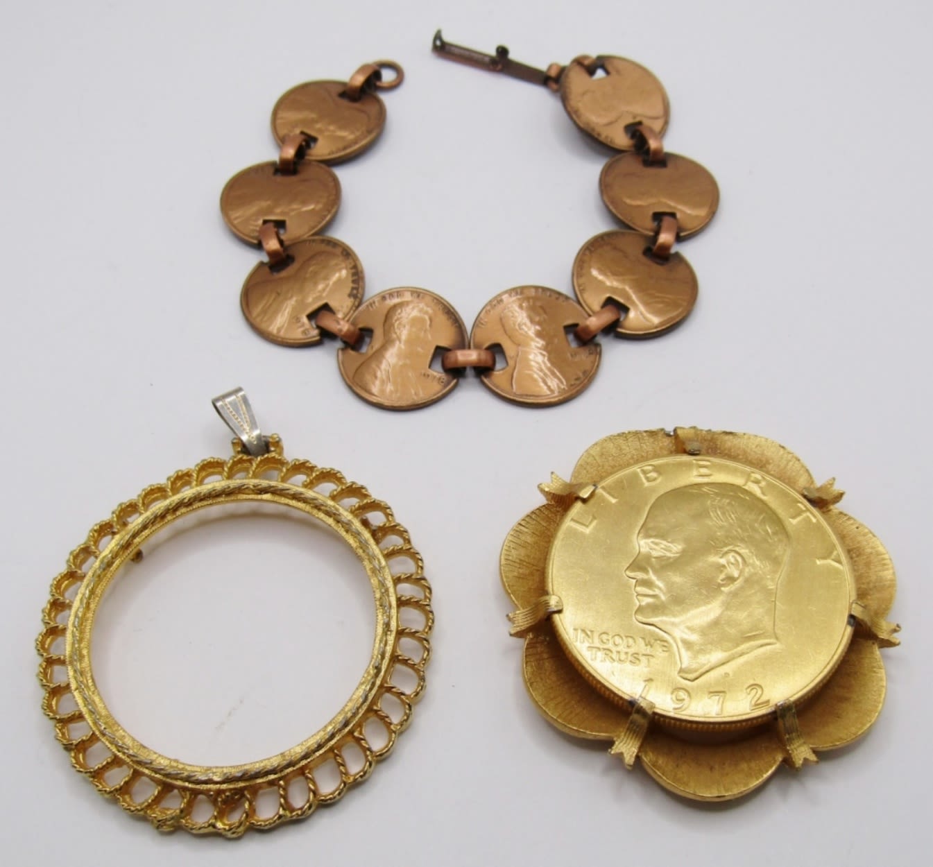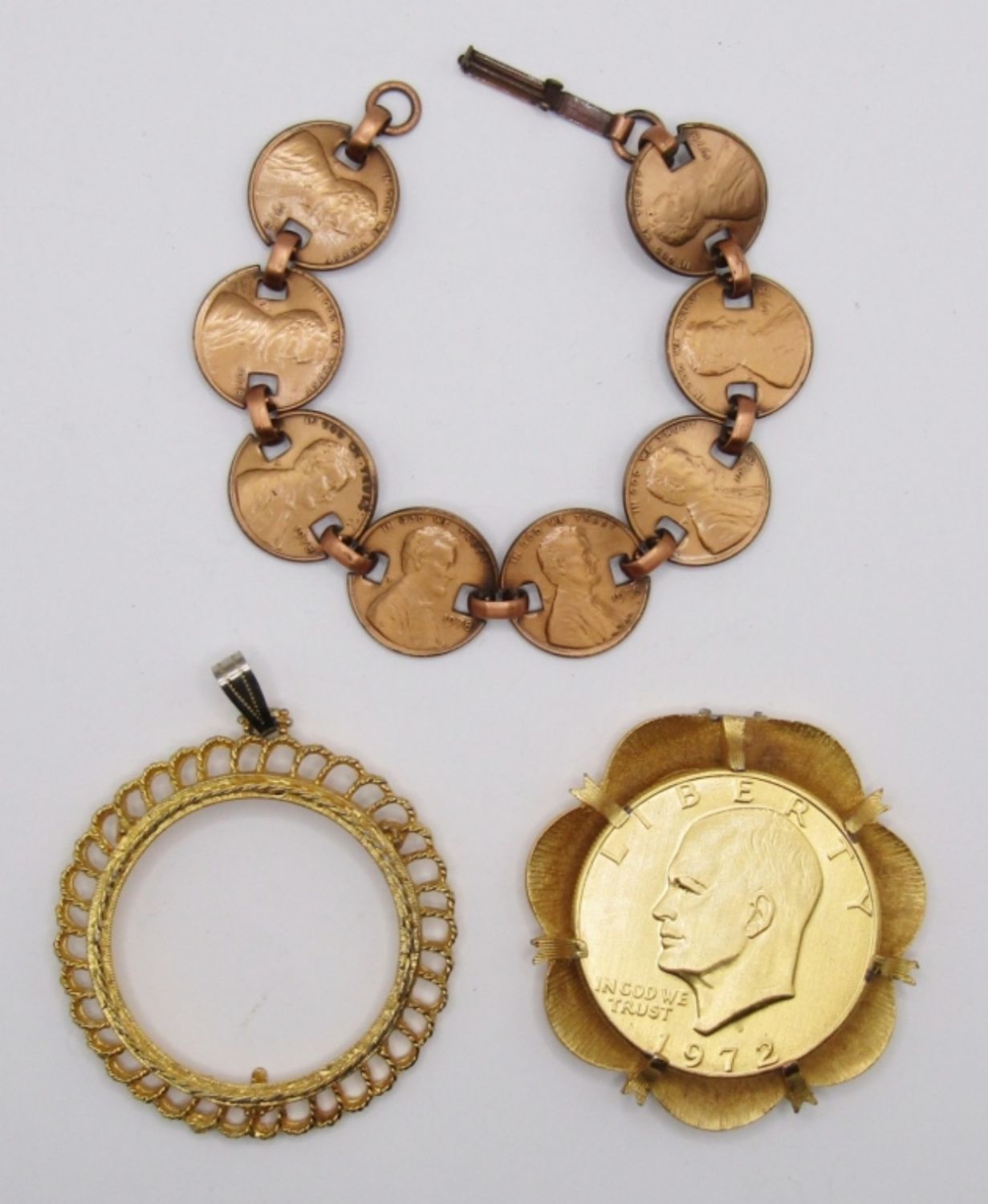 9 PENNIES MADE INTO A BRACELET; EISENHOWER PENDANT WITH EXTRA BEZEL FOR REPAIR