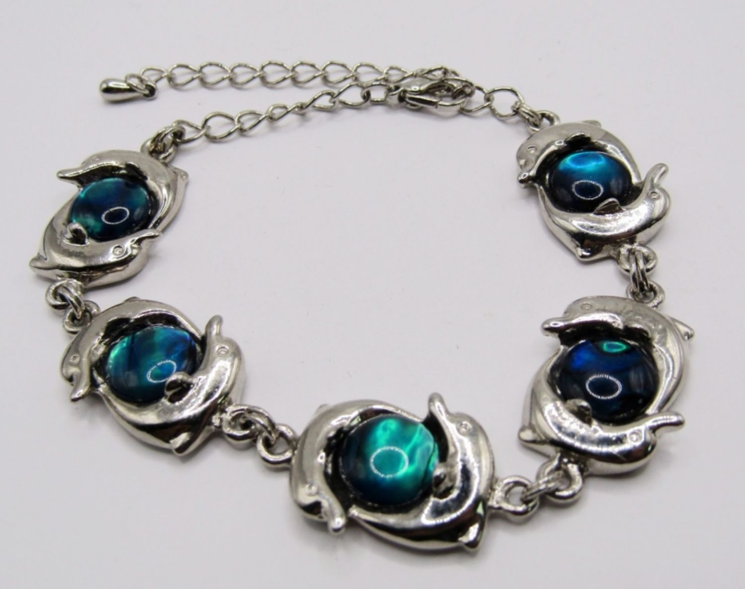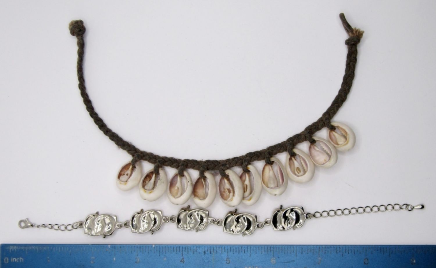 1-FABRIC WITH SHELLS ANKLET; 1- DOLPHIN BRACELET WITH BLUE/GREEN STONES