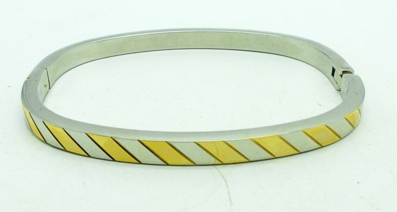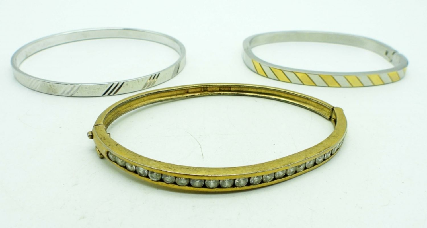 1-SILVER TONE BANGLE; 1-BRASS TONE W/RHINESTONES; 1-SILVER AND GOLD TONE
