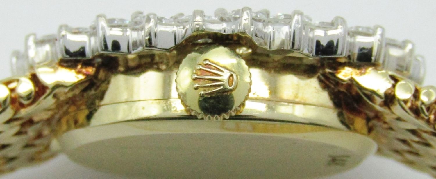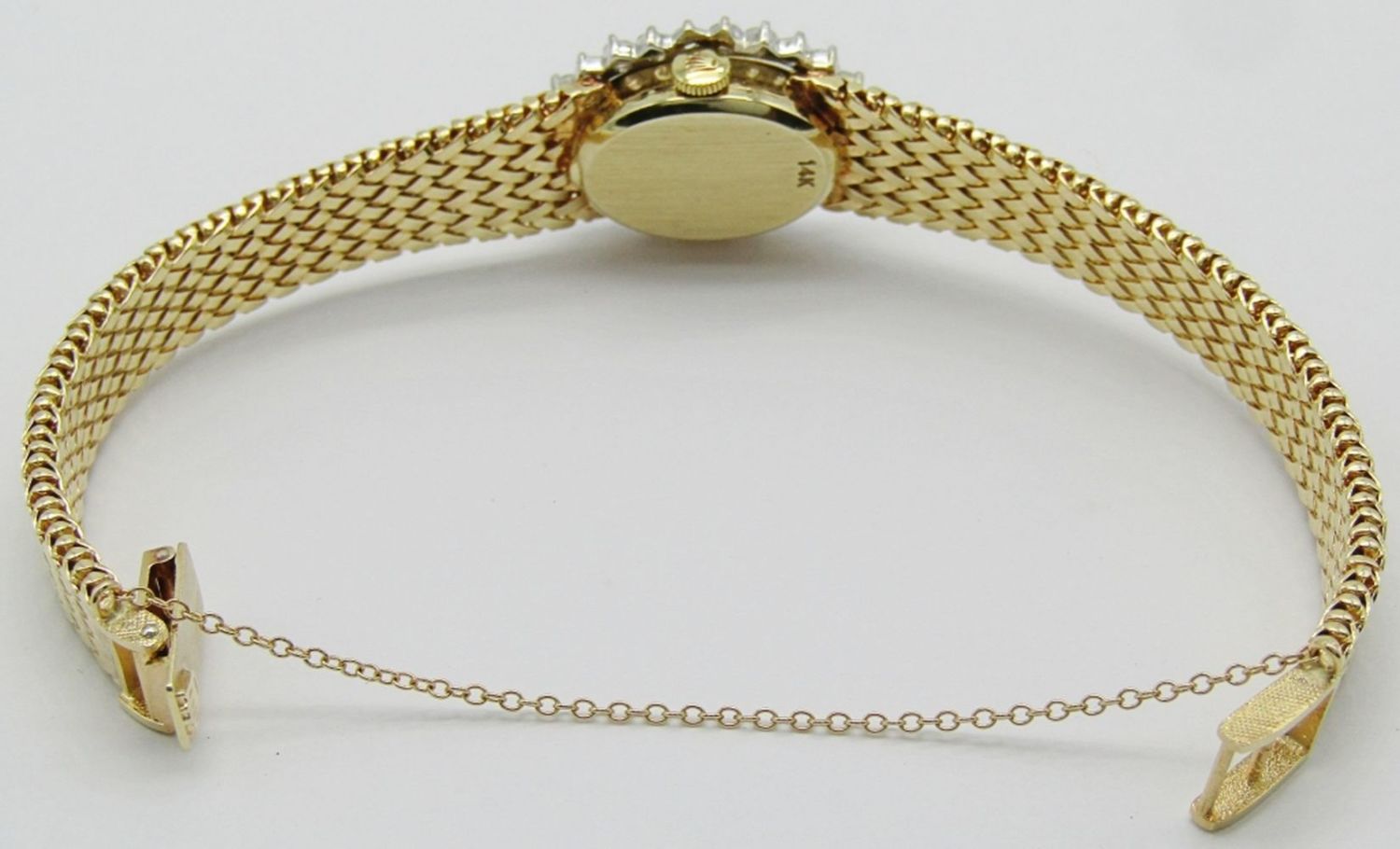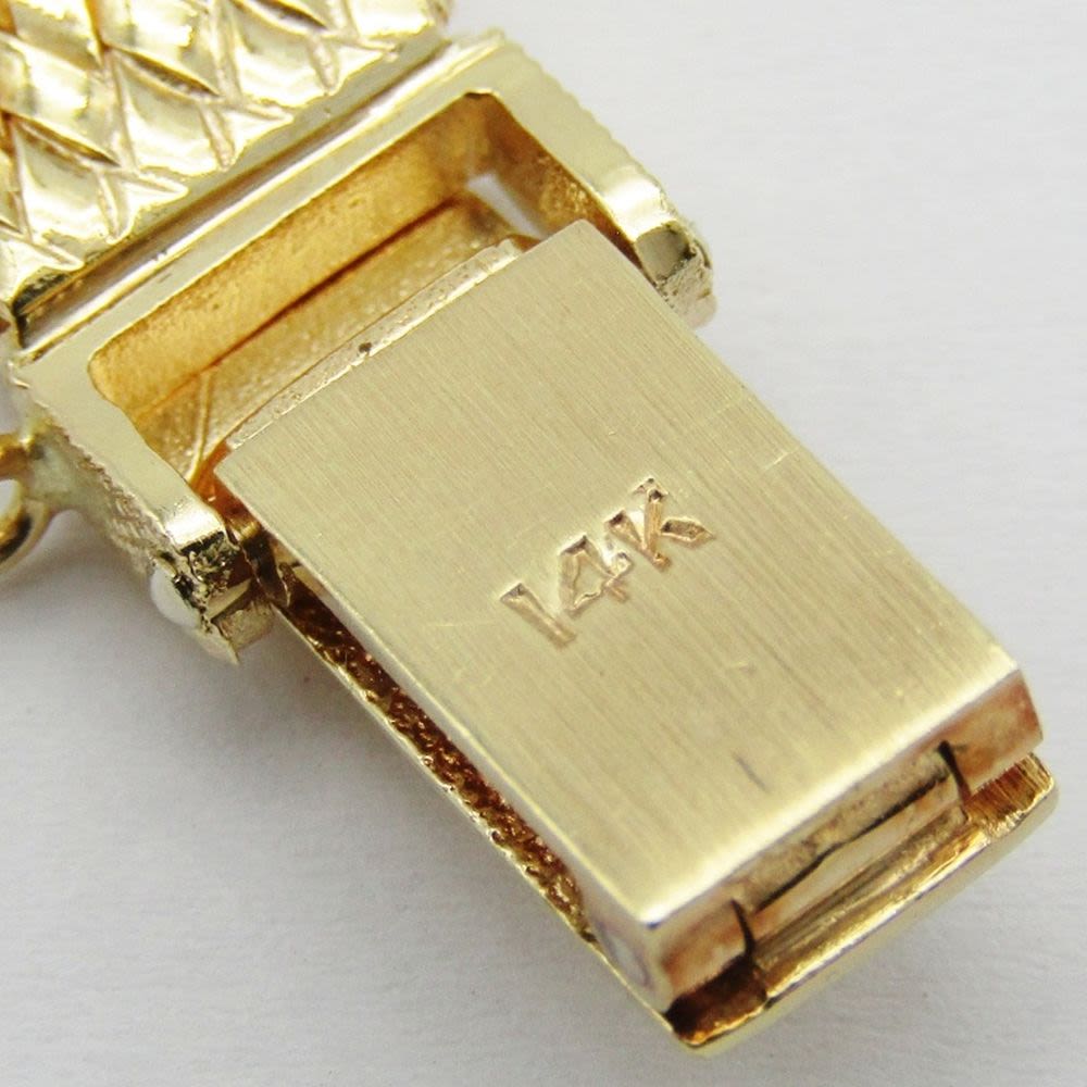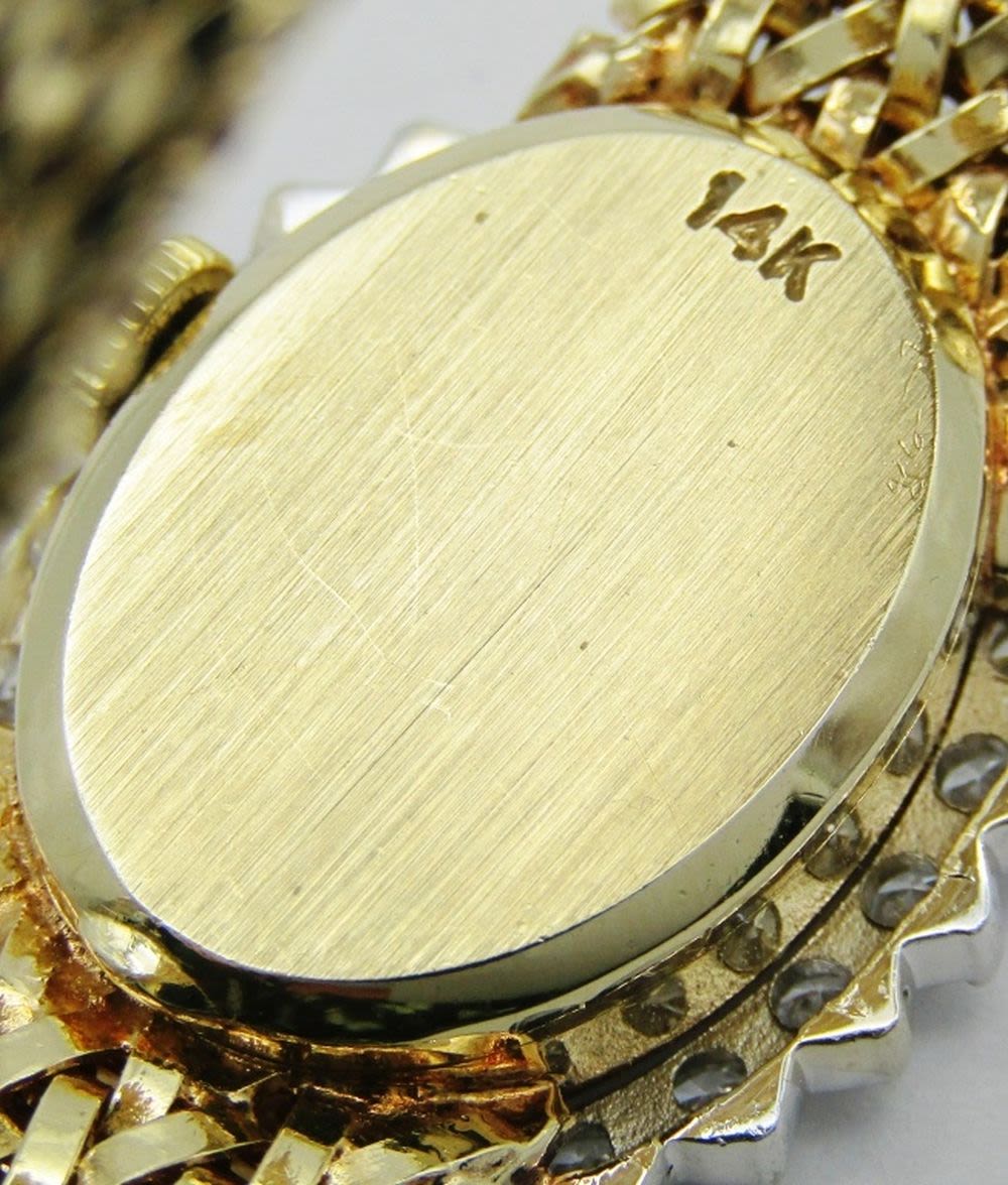 14kt Yellow Gold Case and Bracelet. Case set with 24 White Full Cut Diamonds. Original Champagne Dial is Perfect. Triple Signed. 17 Jewel Cal 1400 Movement. Bracelet Length – 7″. Total Weight 34.1 grams.