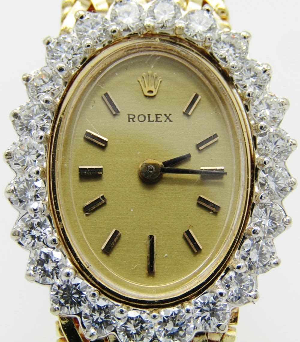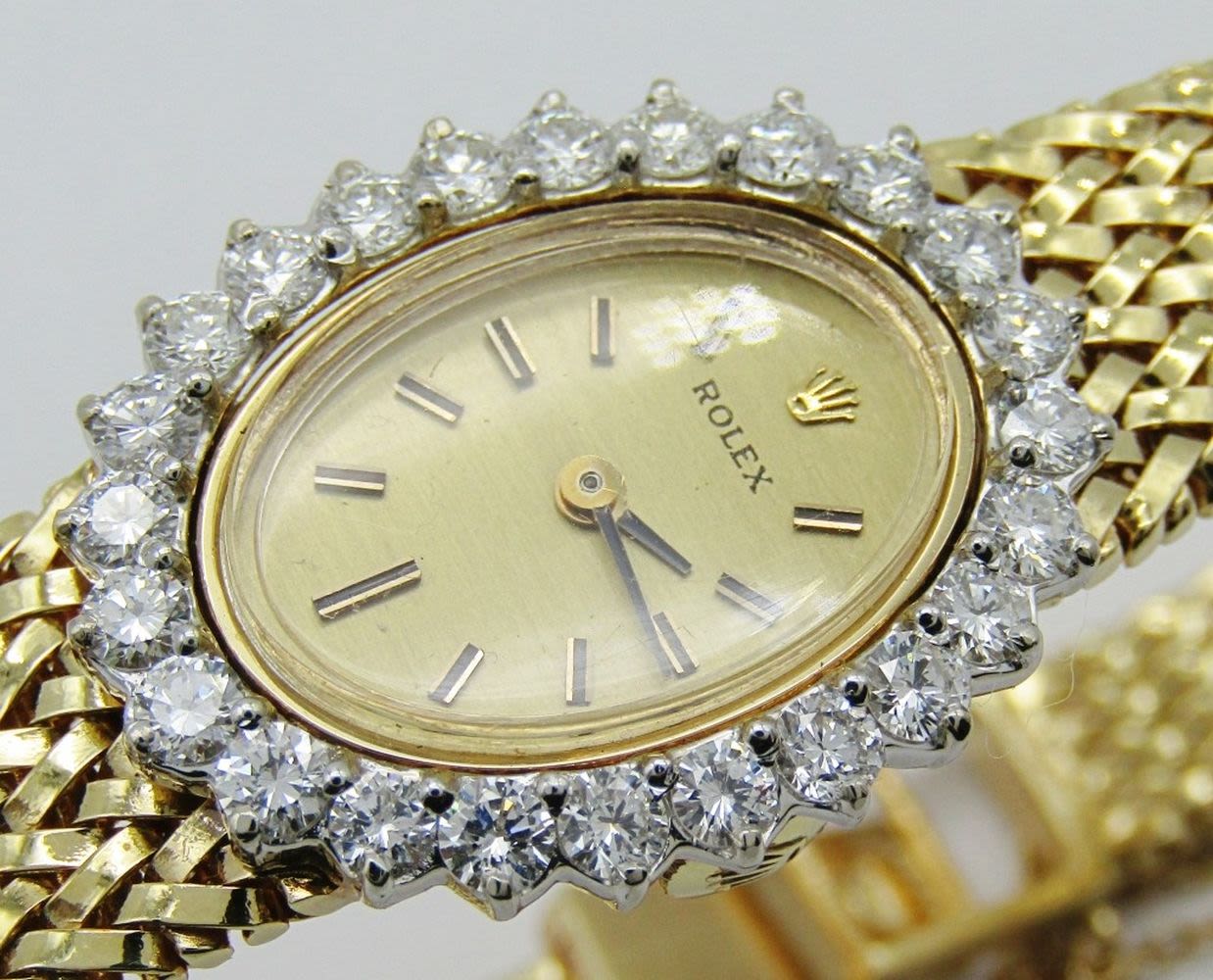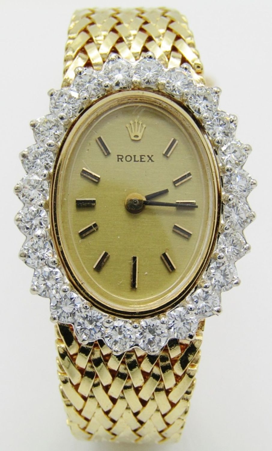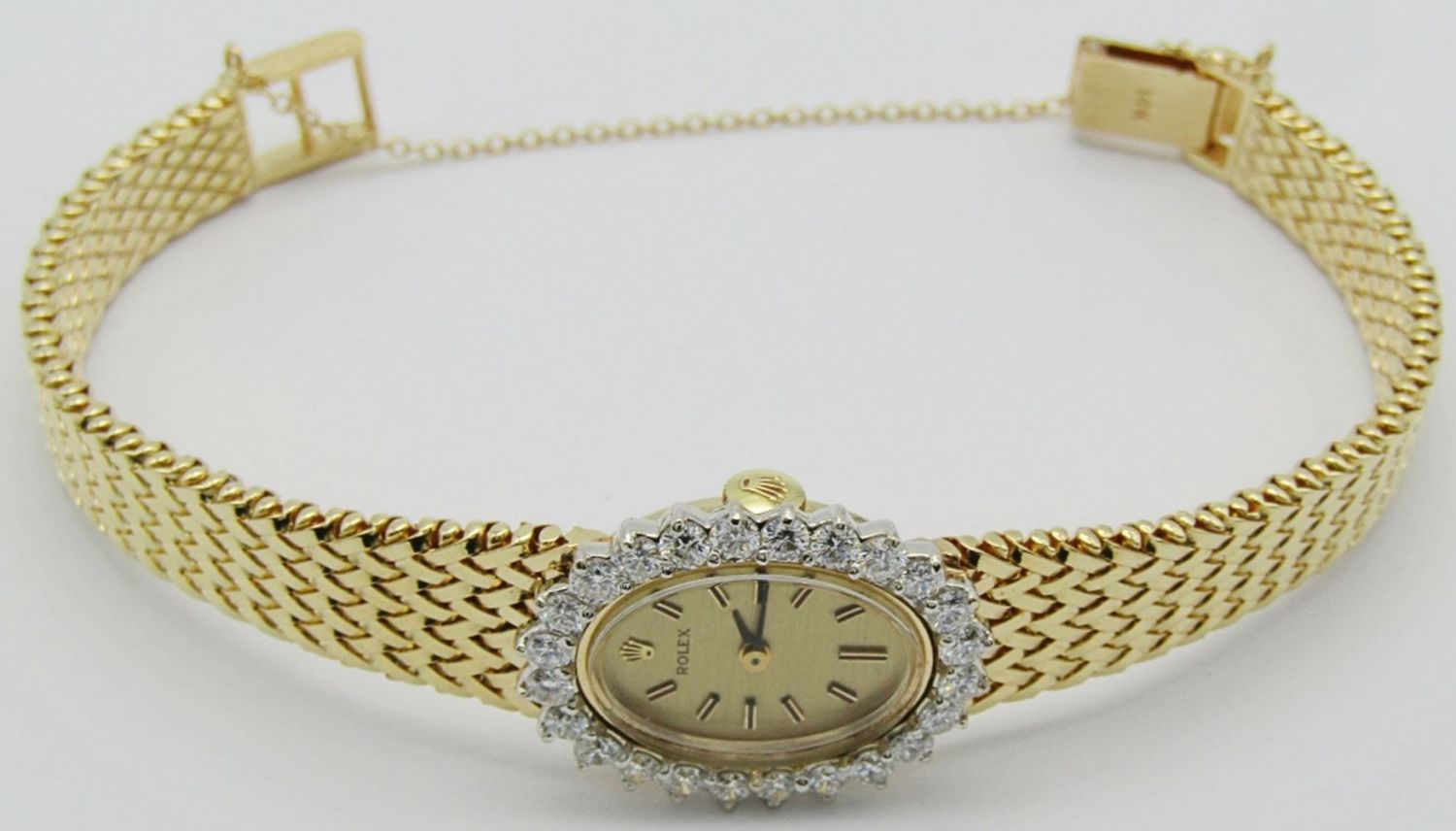 14kt Yellow Gold Case and Bracelet. Case set with 24 White Full Cut Diamonds. Original Champagne Dial is Perfect. Triple Signed. 17 Jewel Cal 1400 Movement. Bracelet Length – 7″. Total Weight 34.1 grams.