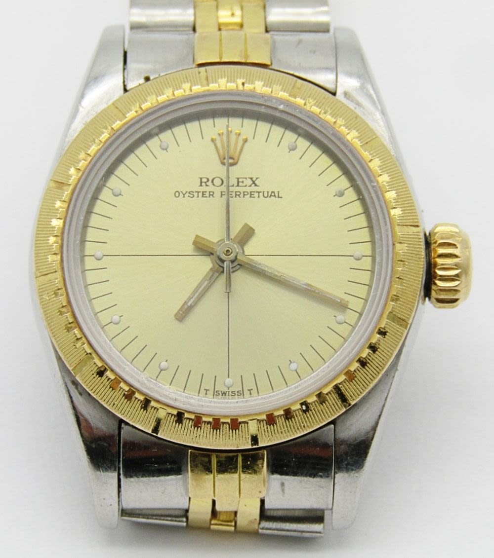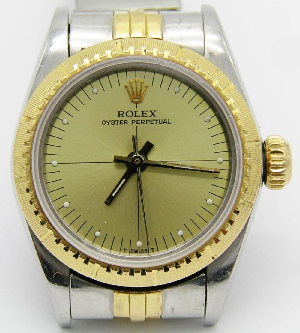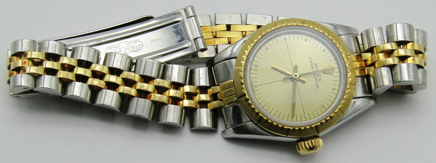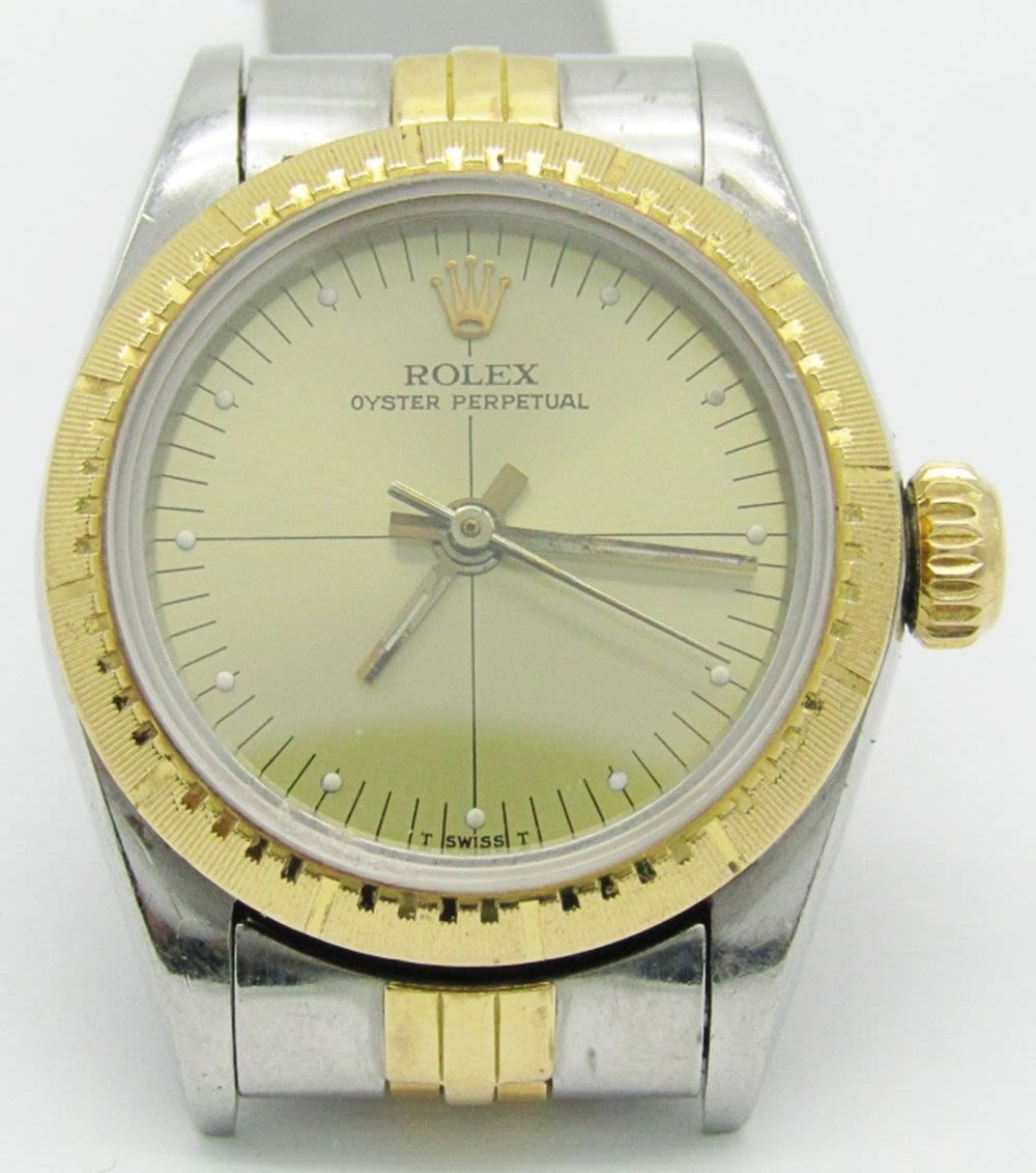 18kt Zephyr Bezel. Original Champagne Zephyr Dial. Ref 67243, Large Jubilee Bracelet. 24mm. Circ 1988.