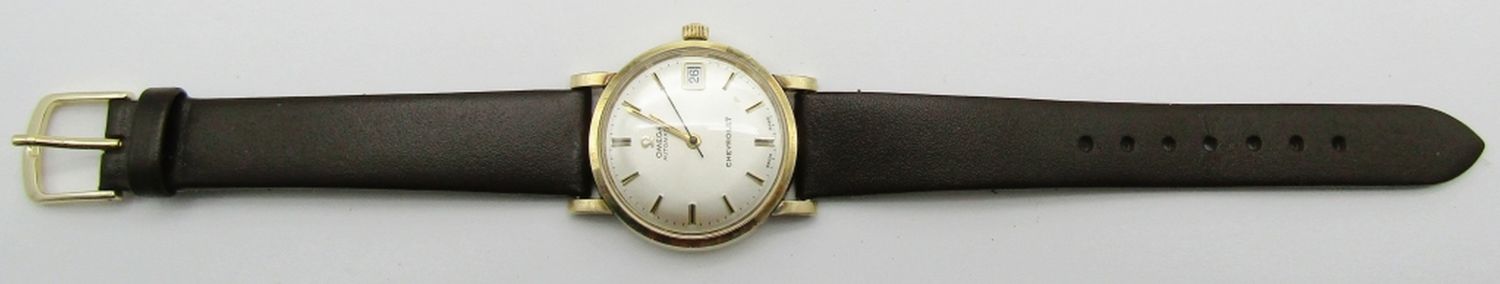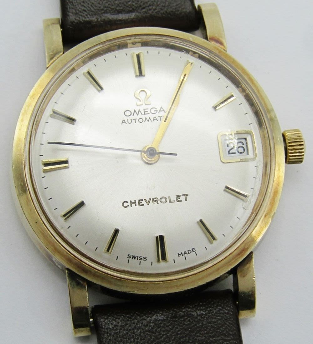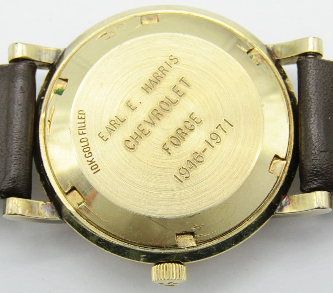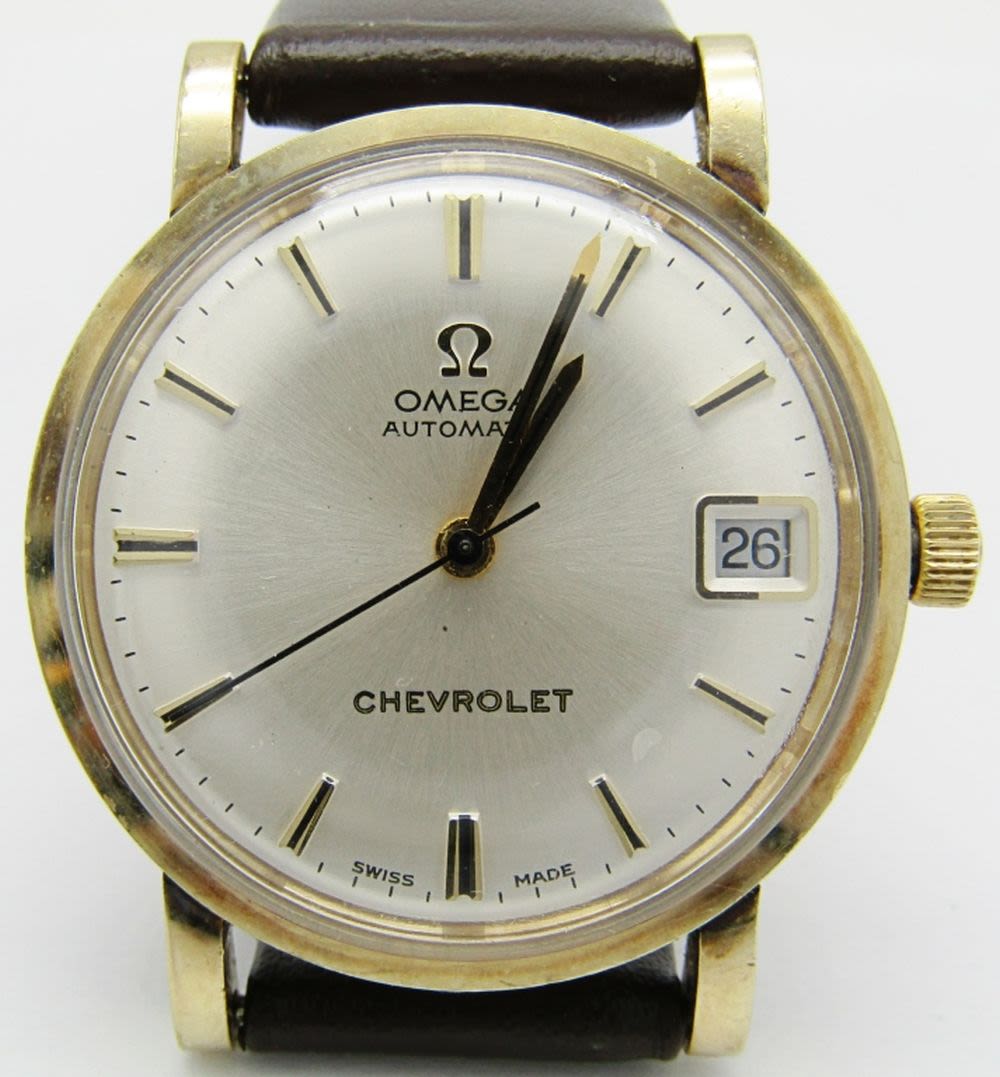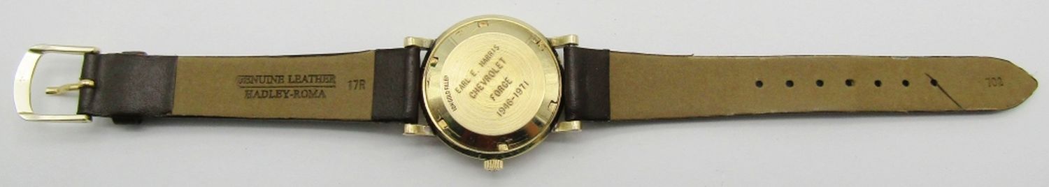 Perfect Original Silvered Dial Signed “Chevrolet”, Gold Filled Screw Back Case with Signed Crown. 33mm Diameter, 17 Jewel Cal 563 Movement. Case Reference KM6323. New Strap. Presentation From Chevrolet Forge 1971.