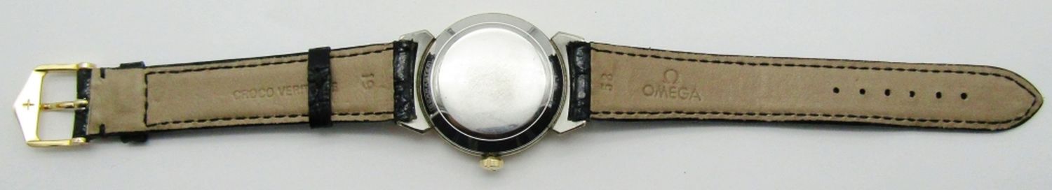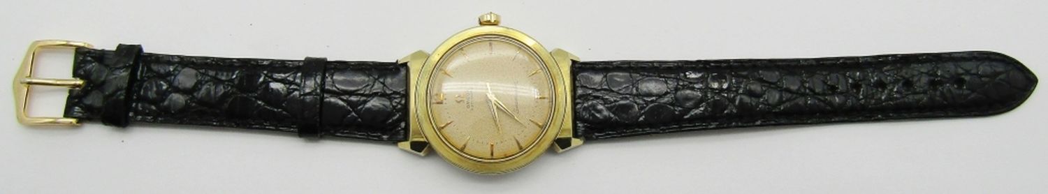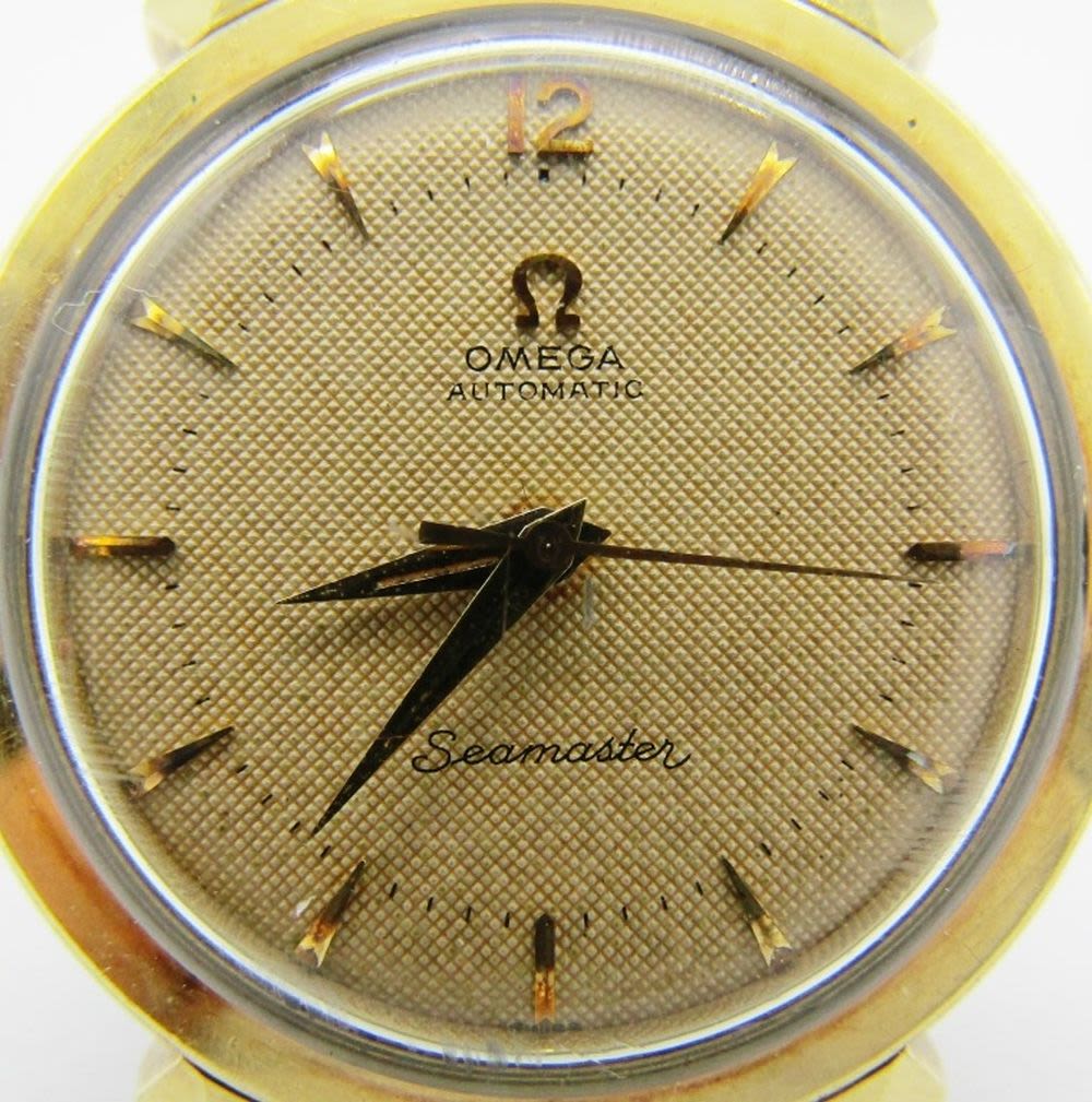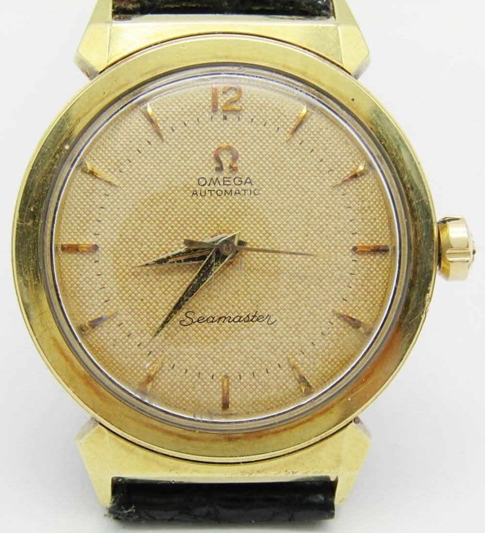 Original Omega Waffle Dial – Toned Gold Capped Snapback Case with Stainless Steel Back. 34mm Diameter. 17 Jewel Caliber 563 Movement. Case Reference KM6292. Signed Omega Black Strap.