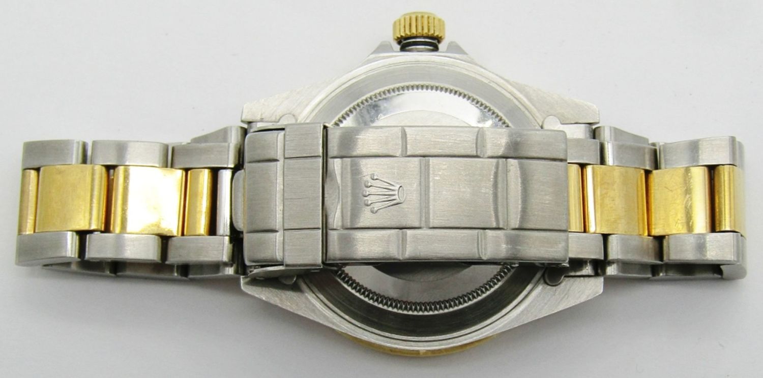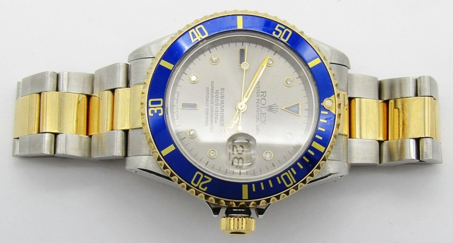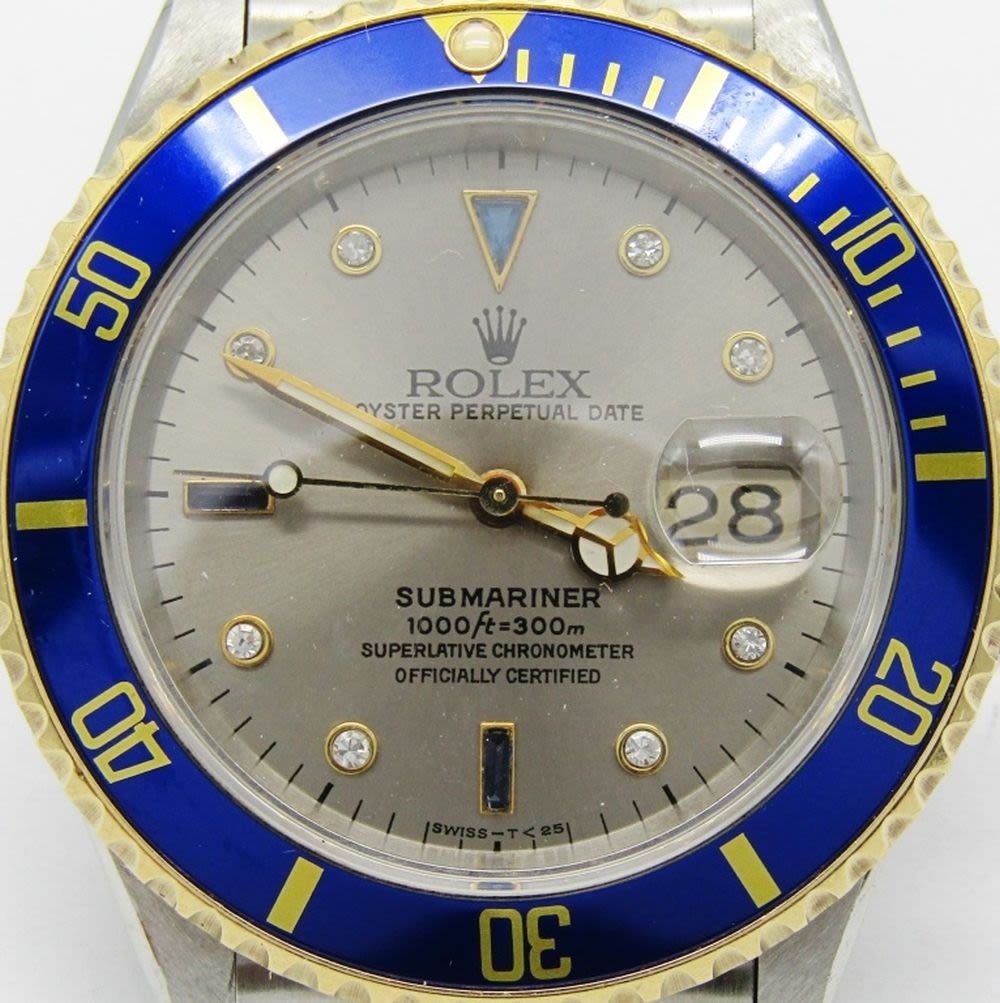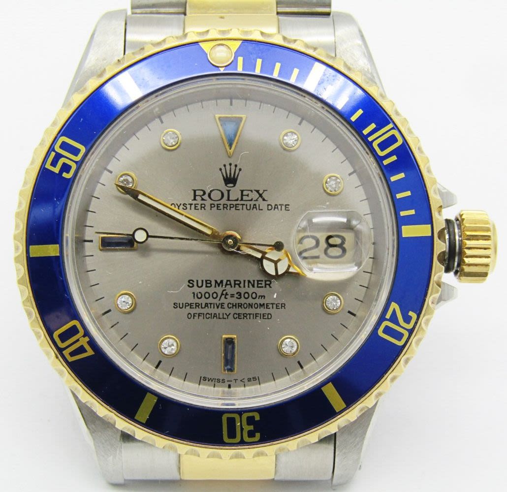 18kt Yellow Gold & Stainless Steel. 40mm Diameter. Perfect Silver Diamond & Sapphire Serti Dial. Circ. 1990 Eseries.