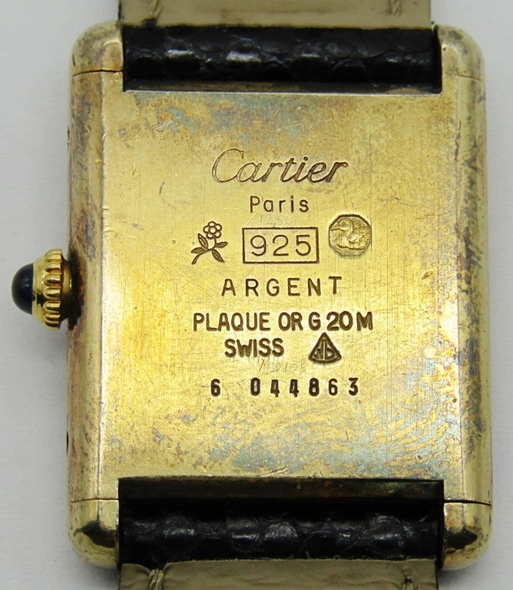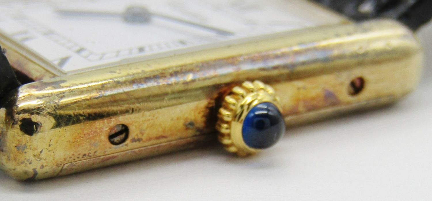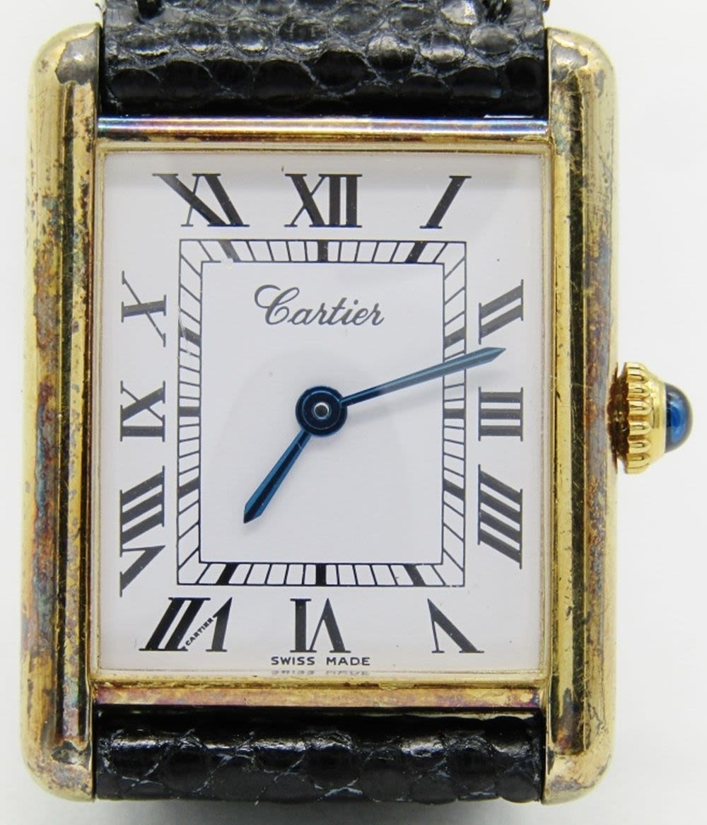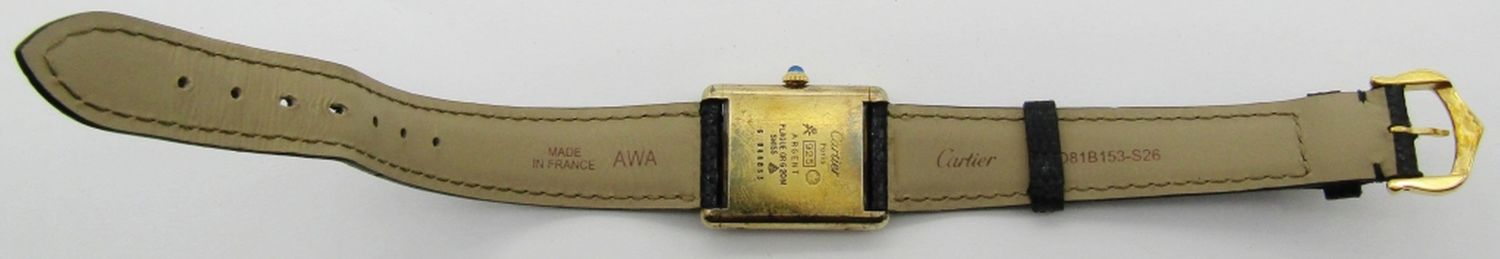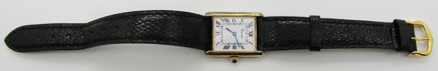 23x30mm Vermeil Case. Signed 17 Jewel Mechanical Movement. Signed Strap with Cartier Style Buckle.