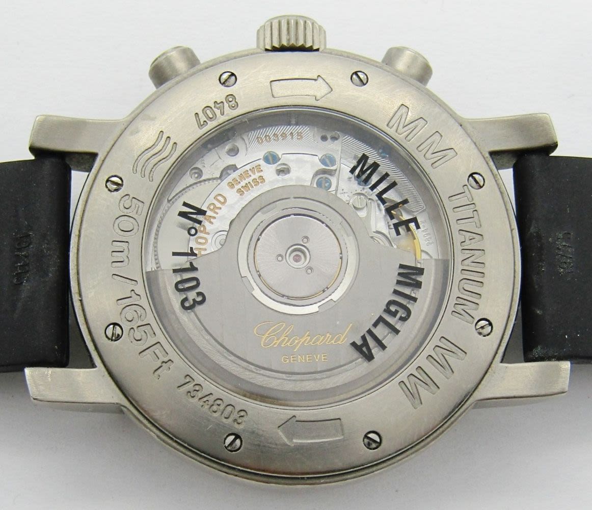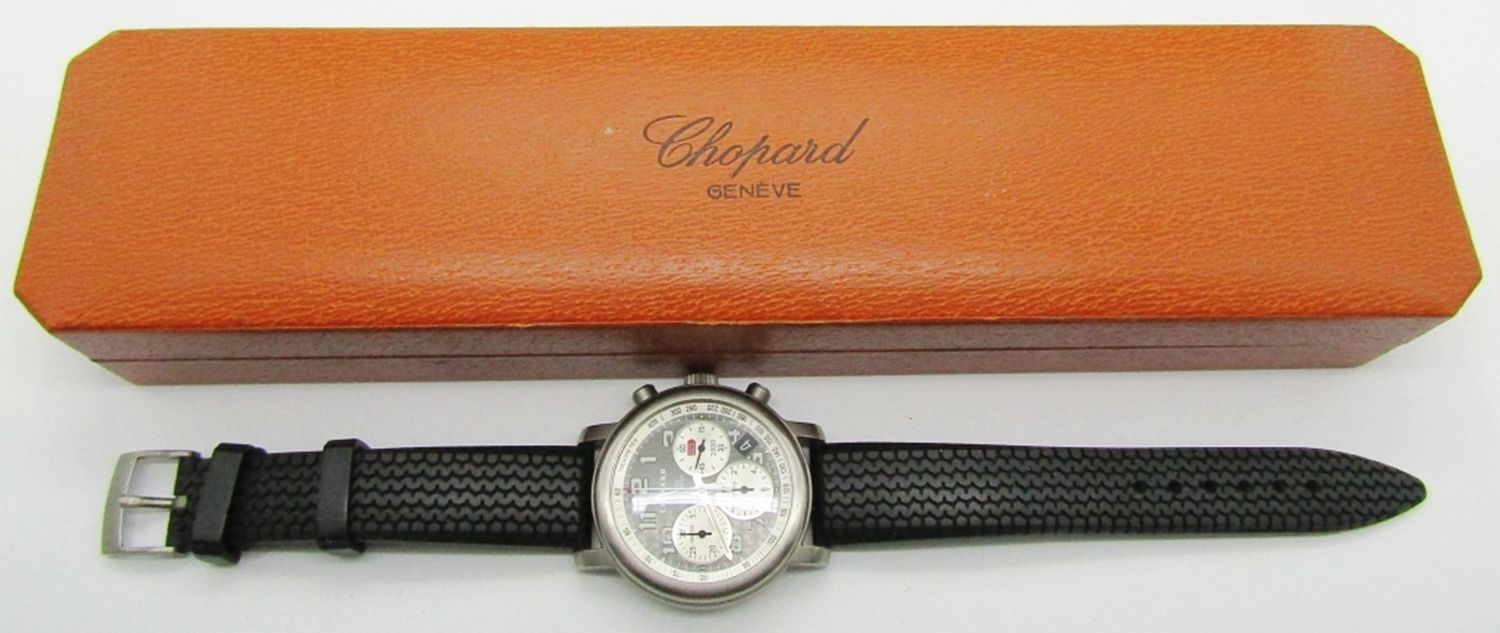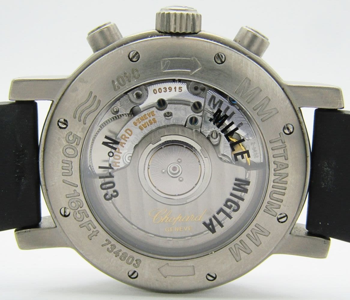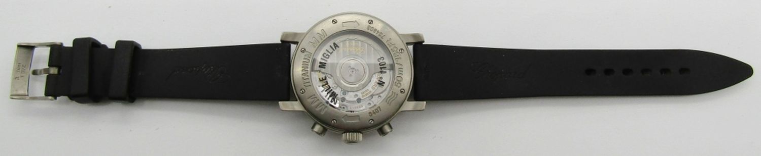 Reference 8407, Perfect Original Dial & Hands. 38mm Titanium Case with Display Back. 37 Jewel ETA-Based Automatic Chronograph Calendar Movement with Recent Complete Service. Perfect Chopard Marked Rubber Strap and Titanium Buckle. Complete with Box and COA. Original Invoice.