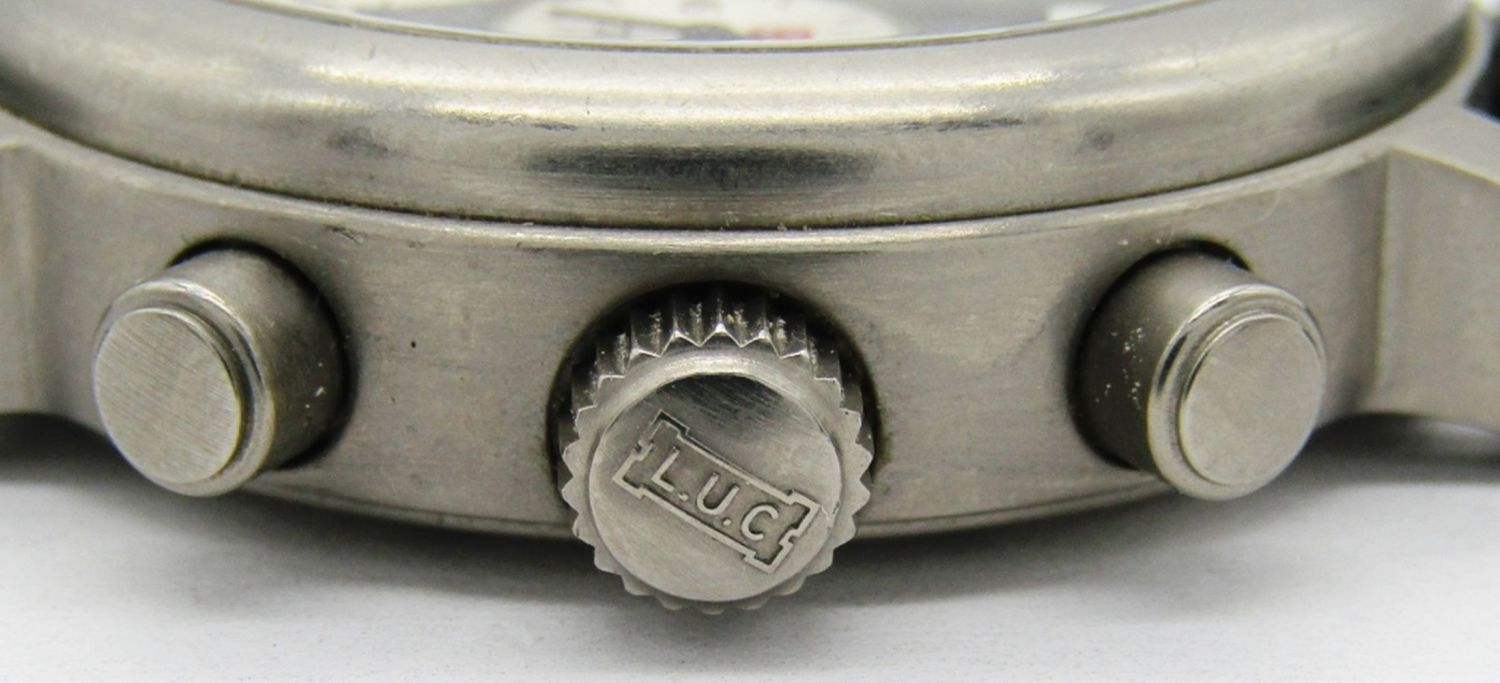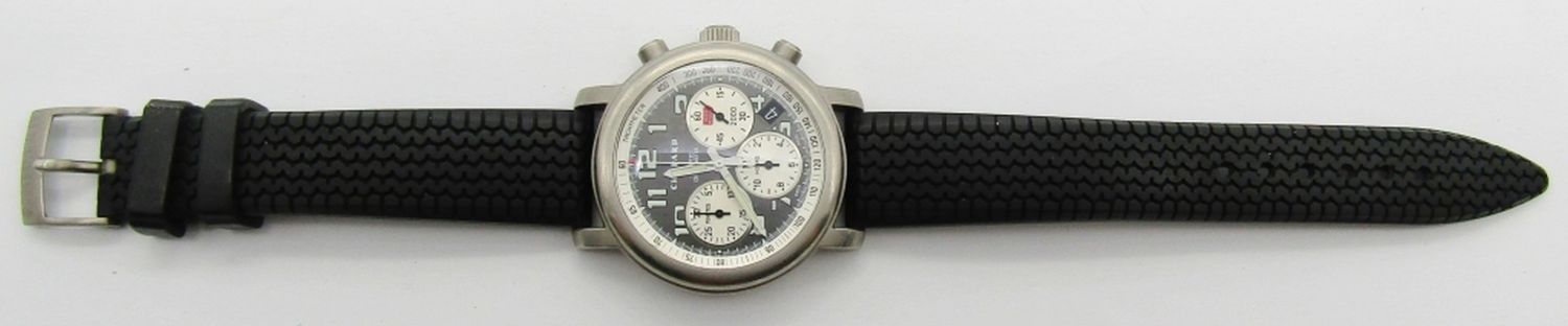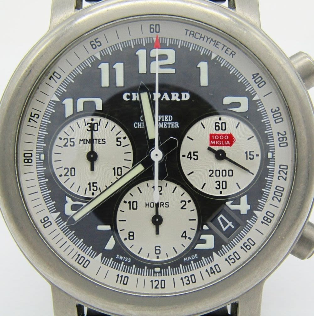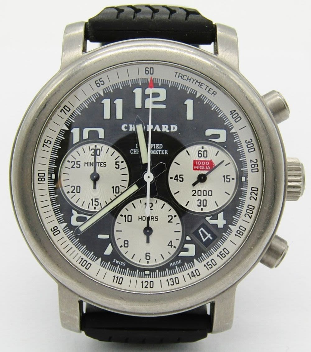 Reference 8407, Perfect Original Dial & Hands. 38mm Titanium Case with Display Back. 37 Jewel ETA-Based Automatic Chronograph Calendar Movement with Recent Complete Service. Perfect Chopard Marked Rubber Strap and Titanium Buckle. Complete with Box and COA. Original Invoice.