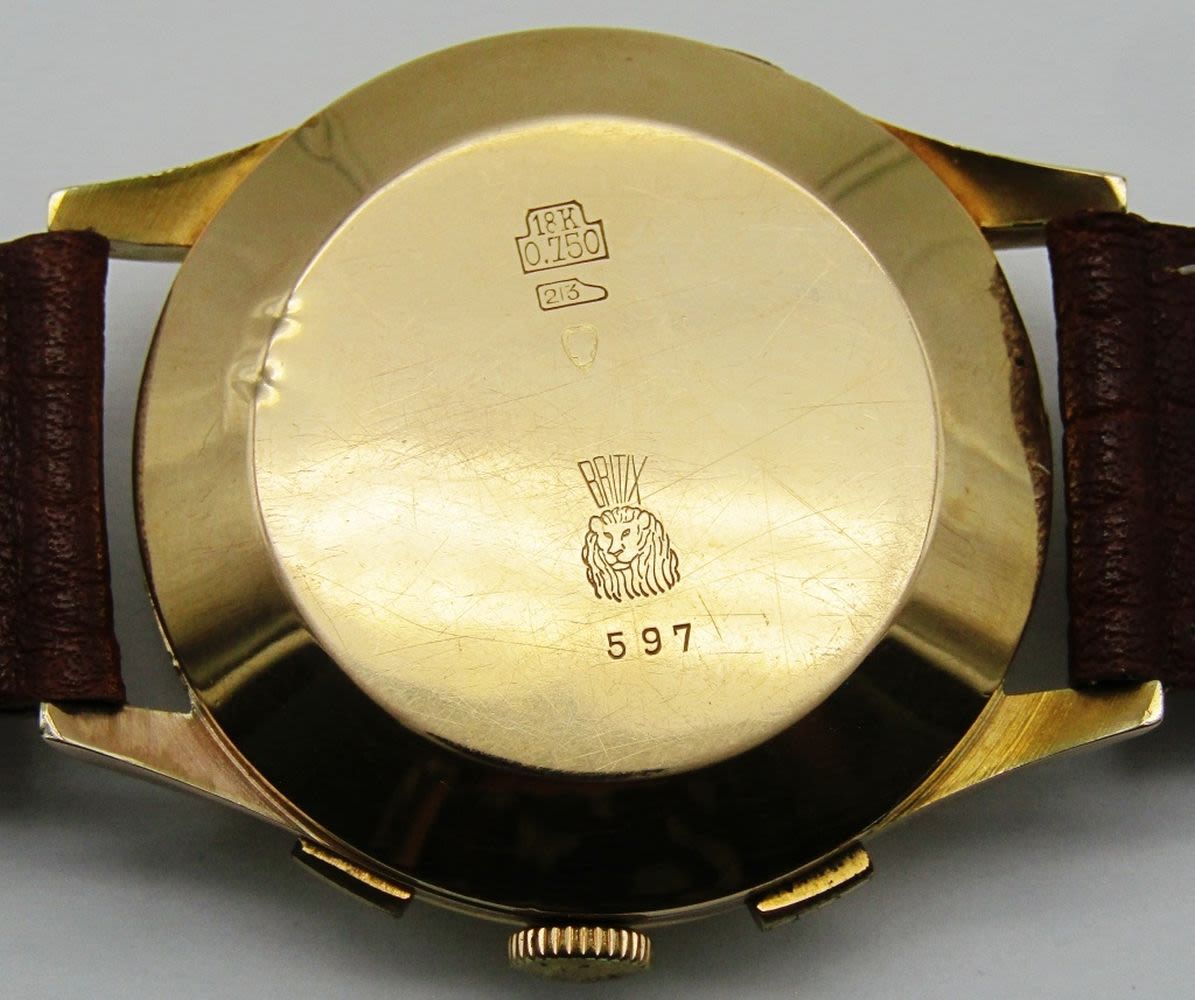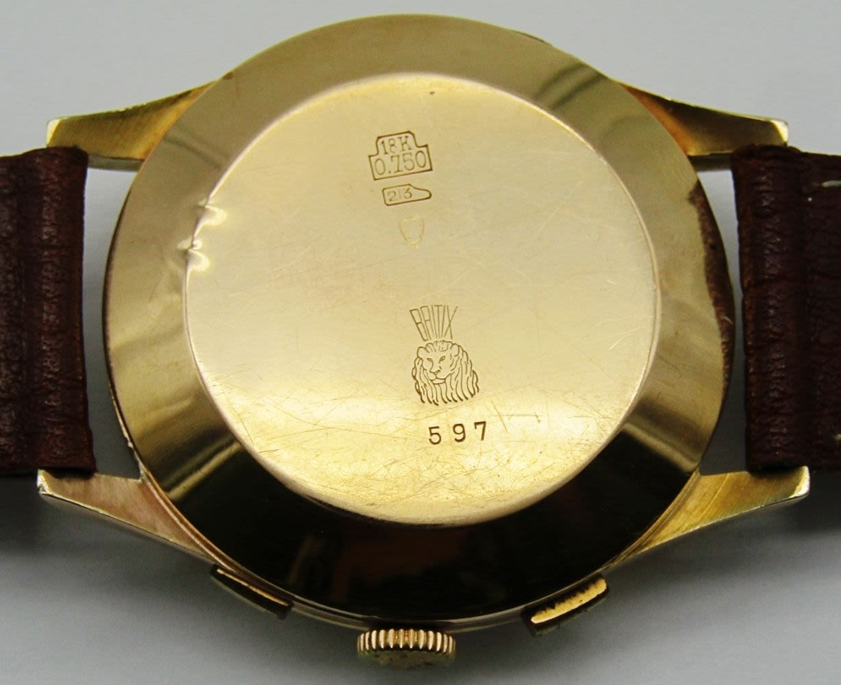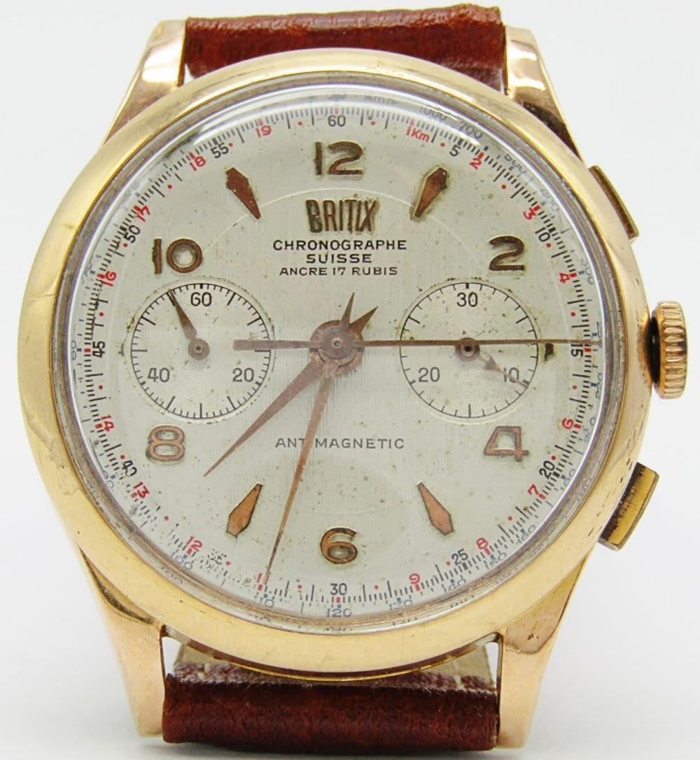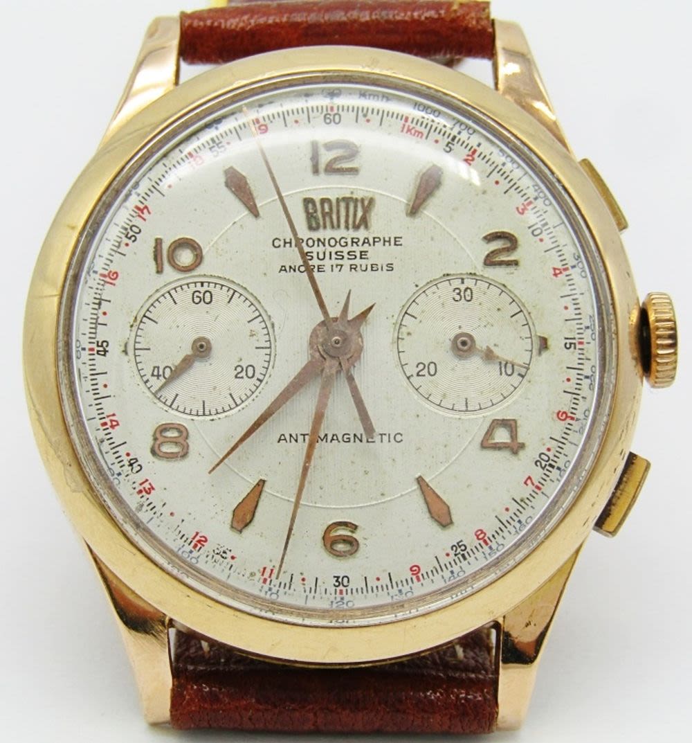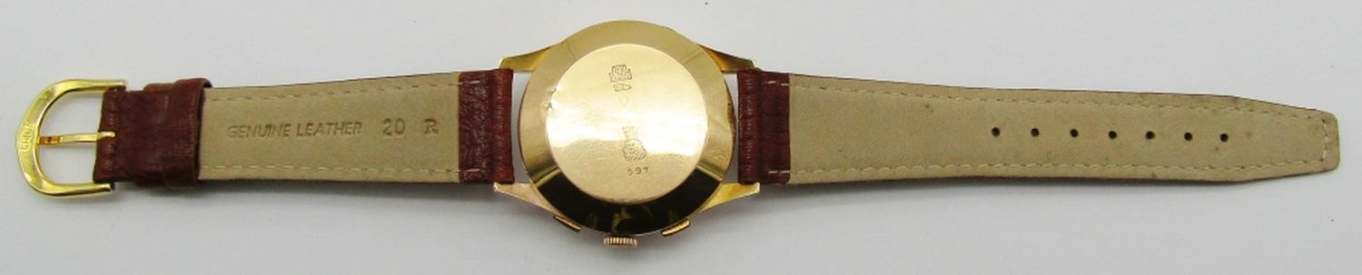 Nice Original Dial With Slight Patina. 38mm. 17 Jewel Landeron Movement. Snap Back Gold Case with Metal Dust Cover. New Strap.