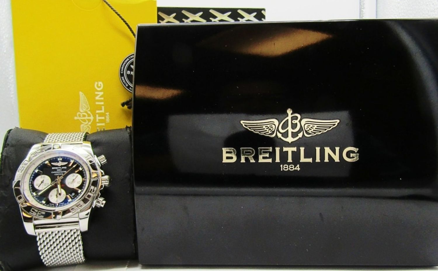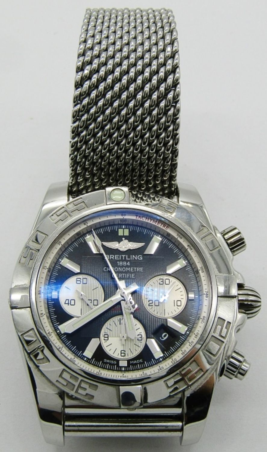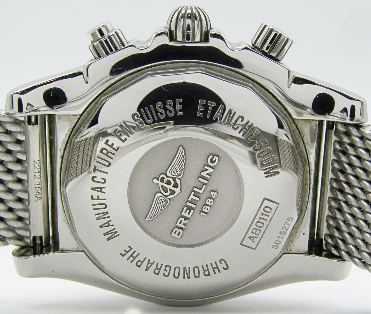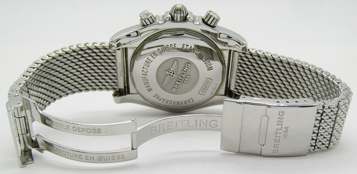 Ref AB 0110. 44mm Diameter. Perfect Black Dial & Hands. With Heavy Breitling Mesh Milan Deployment Bracelet. Complete With All Boxes, Booklets, Hang Tags, Warranty, Ect.