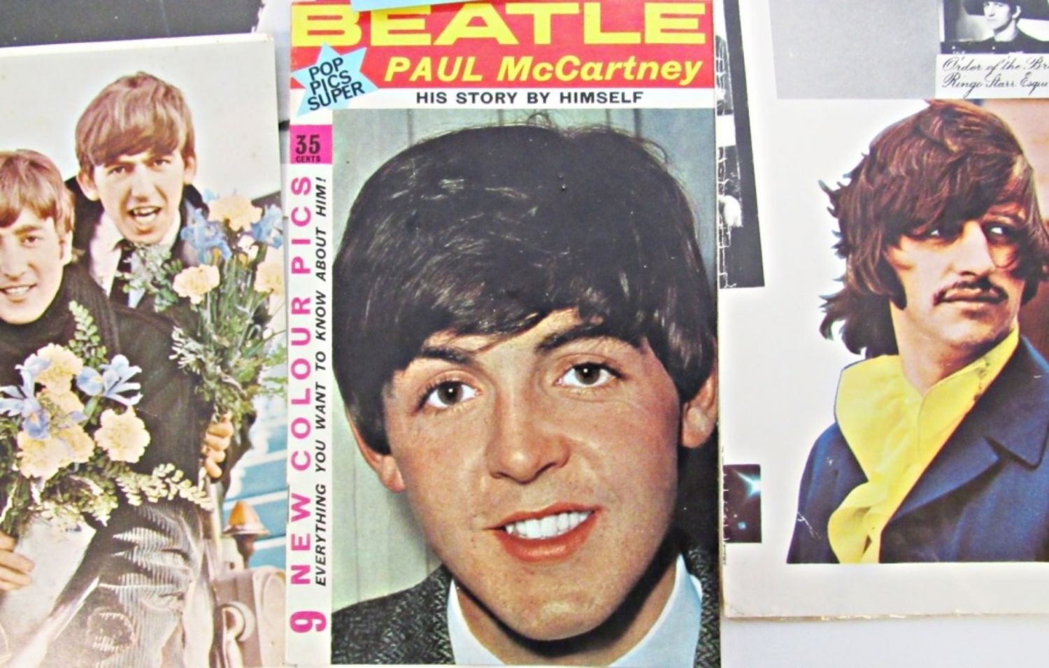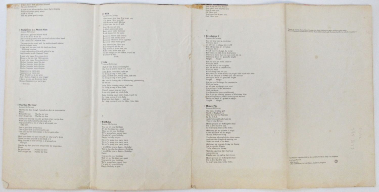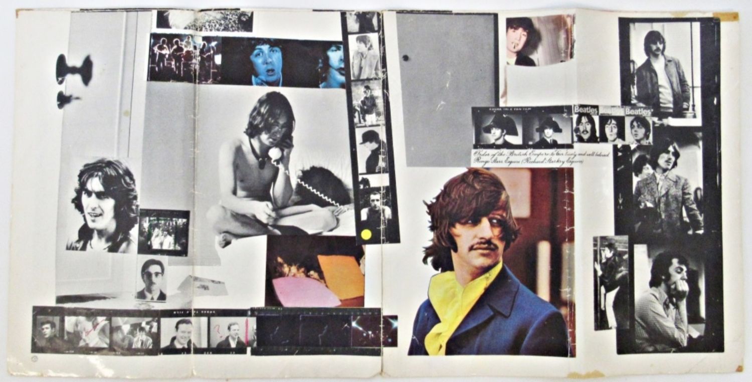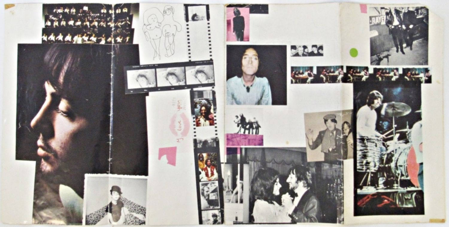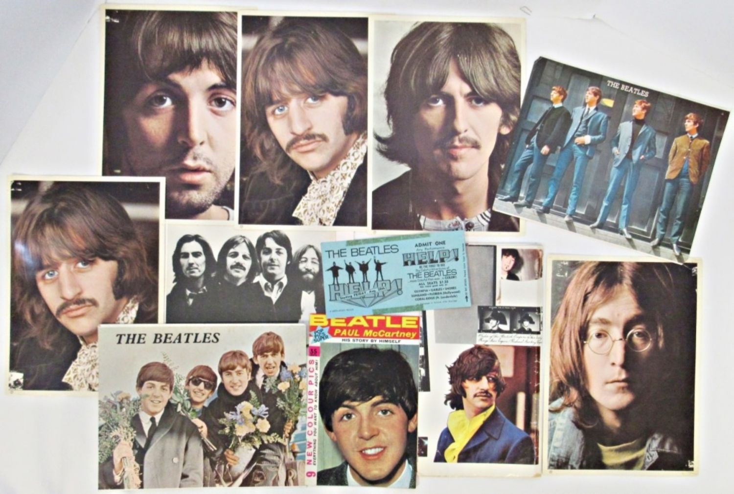 The Beatles White Album 1968 Color Photo Collage Poster Lyrics Insert 34″ x 22″ in sections; ADMINT ONE HELP PERFORMANCE; BEATLE PAUL McCARTNEY HIS STOR BY HIMSELF BOOKLET; (8) 8×10 approx POSTERS – COOL COLLECTORS LOT