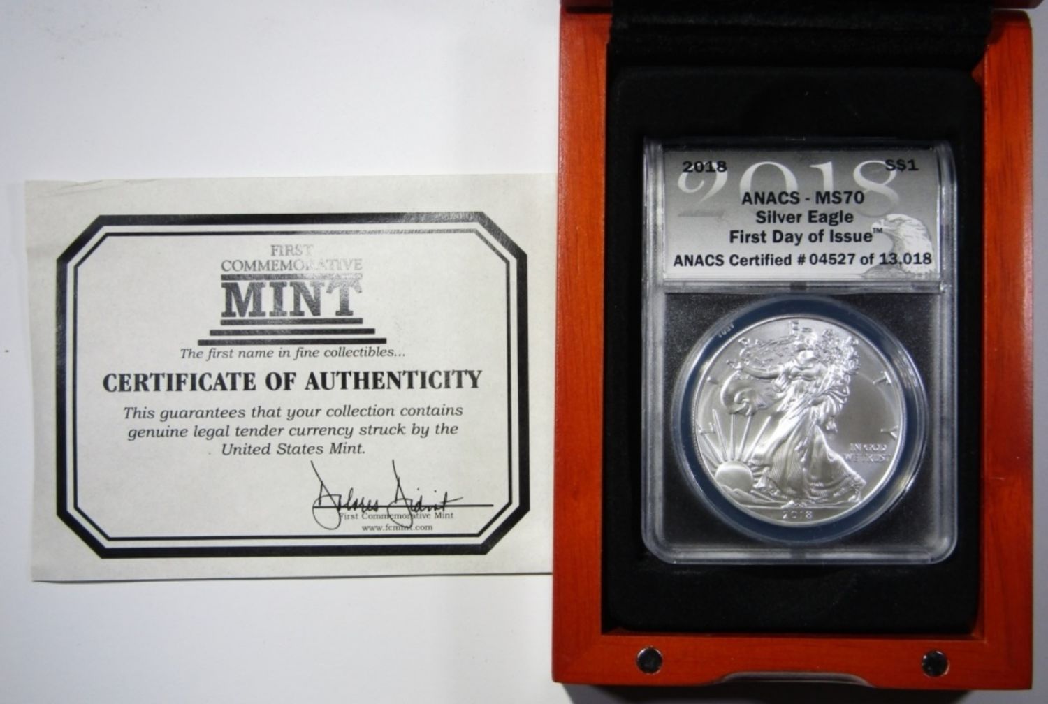 FIRST DAY OF ISSUE. IN WOODEN DISPLAY CASE WITH FIRST COMMEMORATIVE MINT COA.