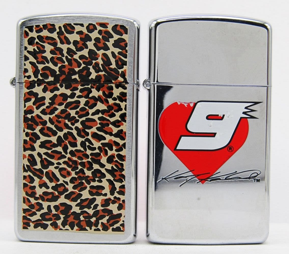 2003 Cheetah Print Sealed Slim Zippo; 2005 Nascar Kasey Kahne #9 Heart Unfired Zippo.