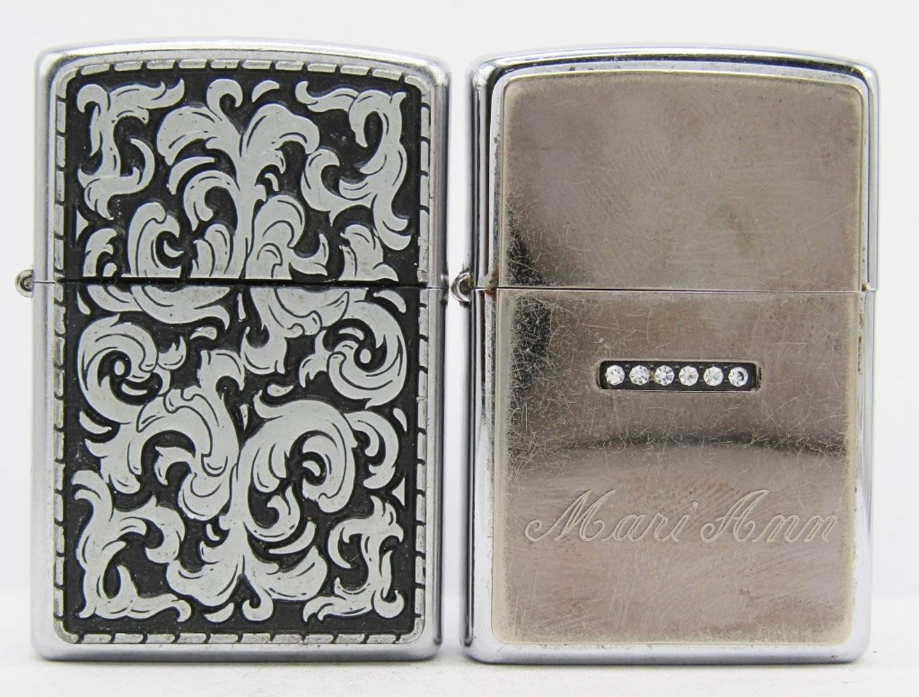 2003 Marlboro Black Silver Storm Scroll & 2002 “Mari Ann” with 6 Rhinestones; Both Used Conditions.