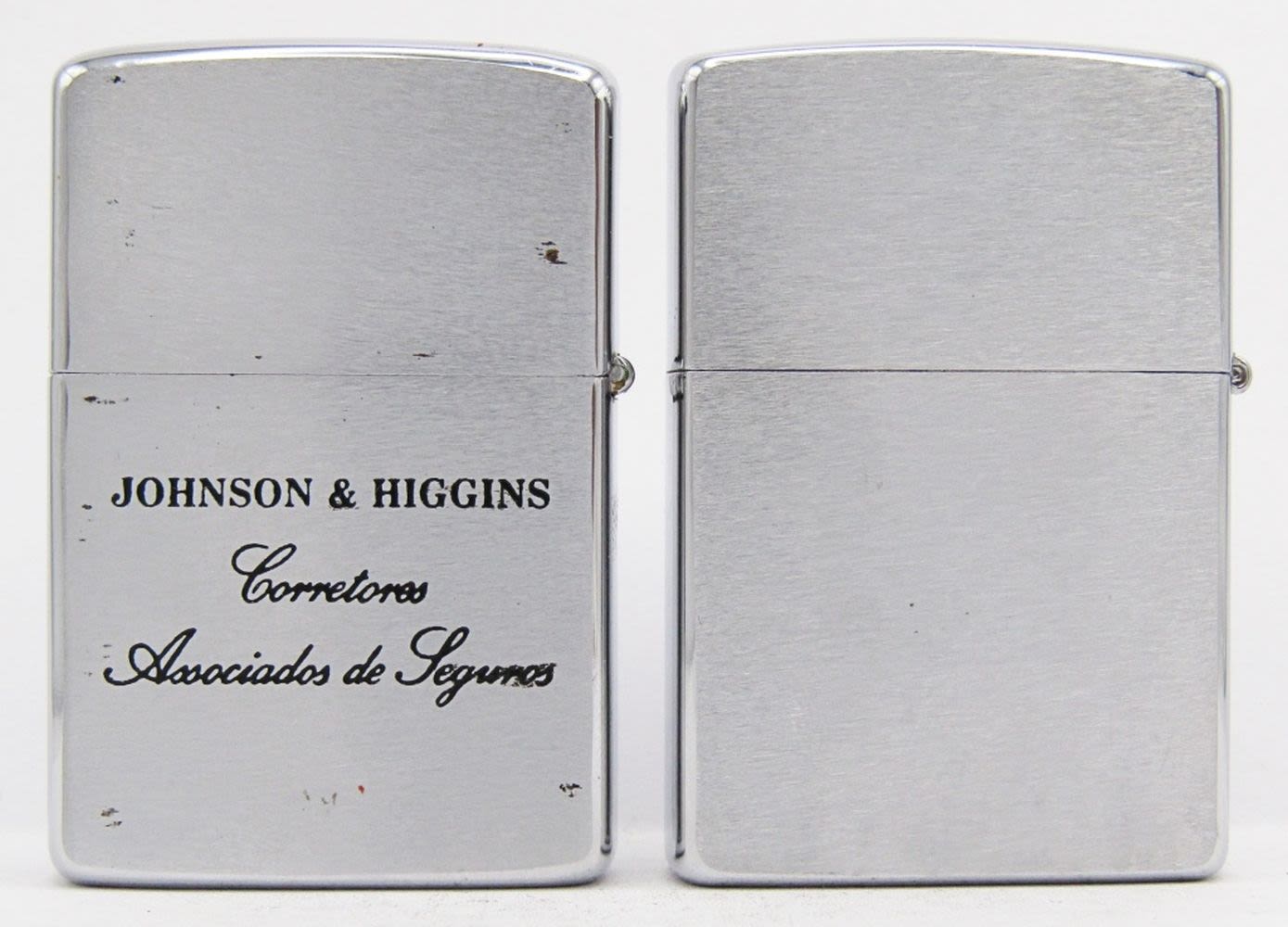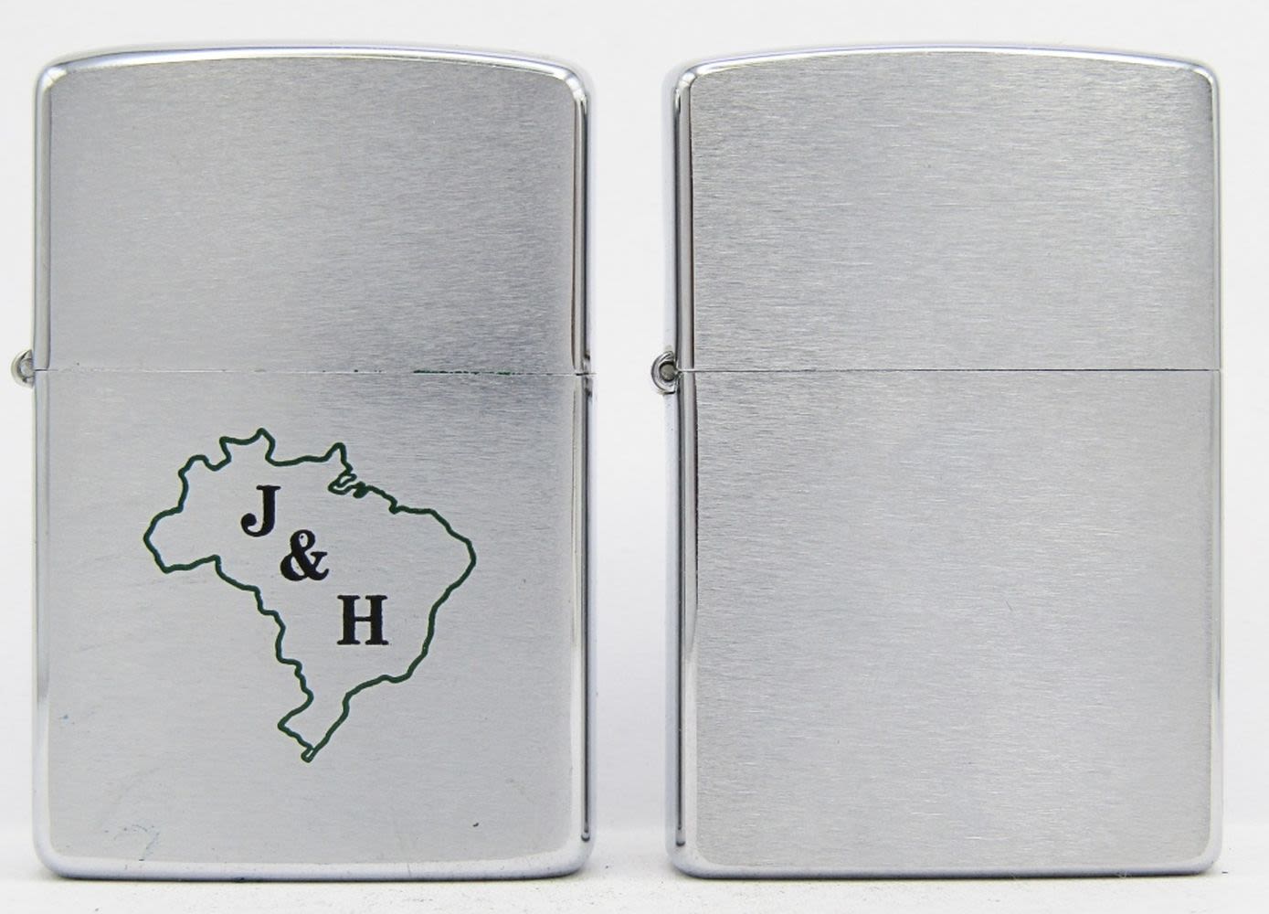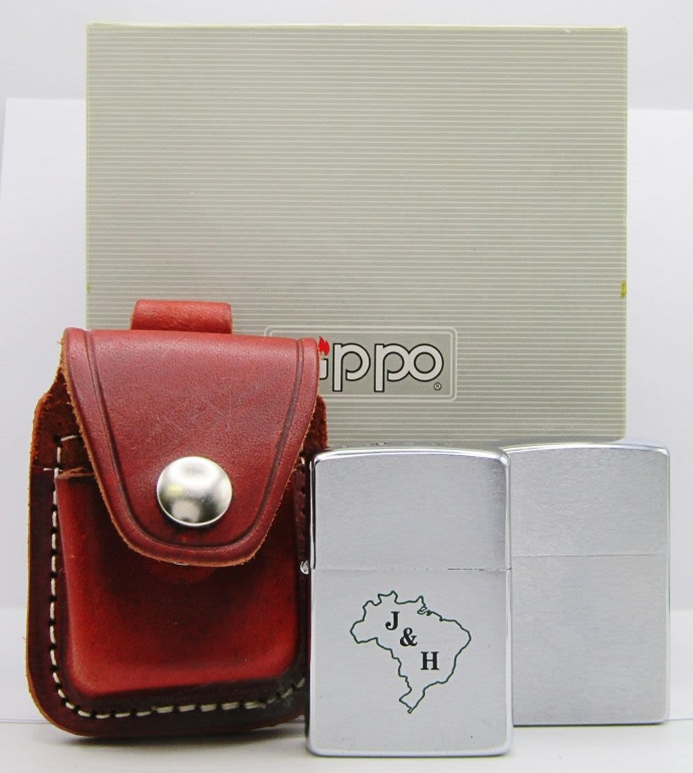 Both Unfired! 1967 & 1999; 1967 Advertising Lighter “J& H” on Front, “Johnson & Higgins Corretores Associados de Seguros” on Back. Brown Leather Zippo Lighter Holder.