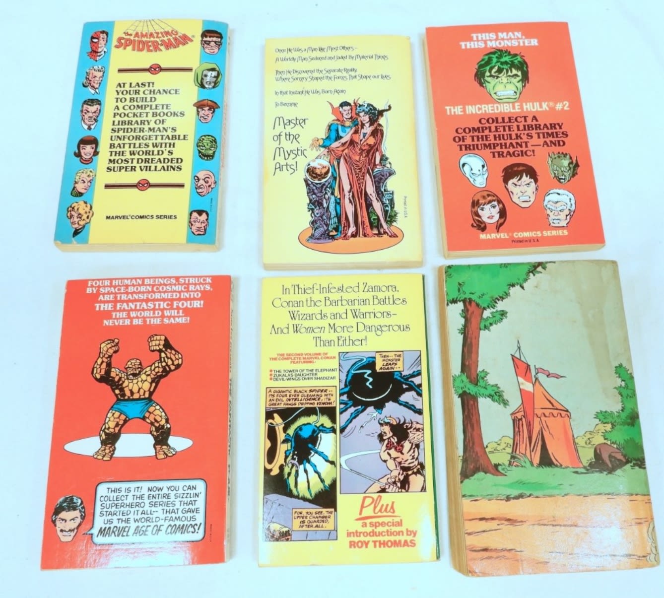 (5) MARVEL PAPER BACKS 1971 CONAN, 1977 FANTASTIC FOUR, 1977 AMAZING SPIDER-MAN, 1978 DOCTOR STRANGE, 1978 HULK & 1966 WHITMAN SUPERMAN