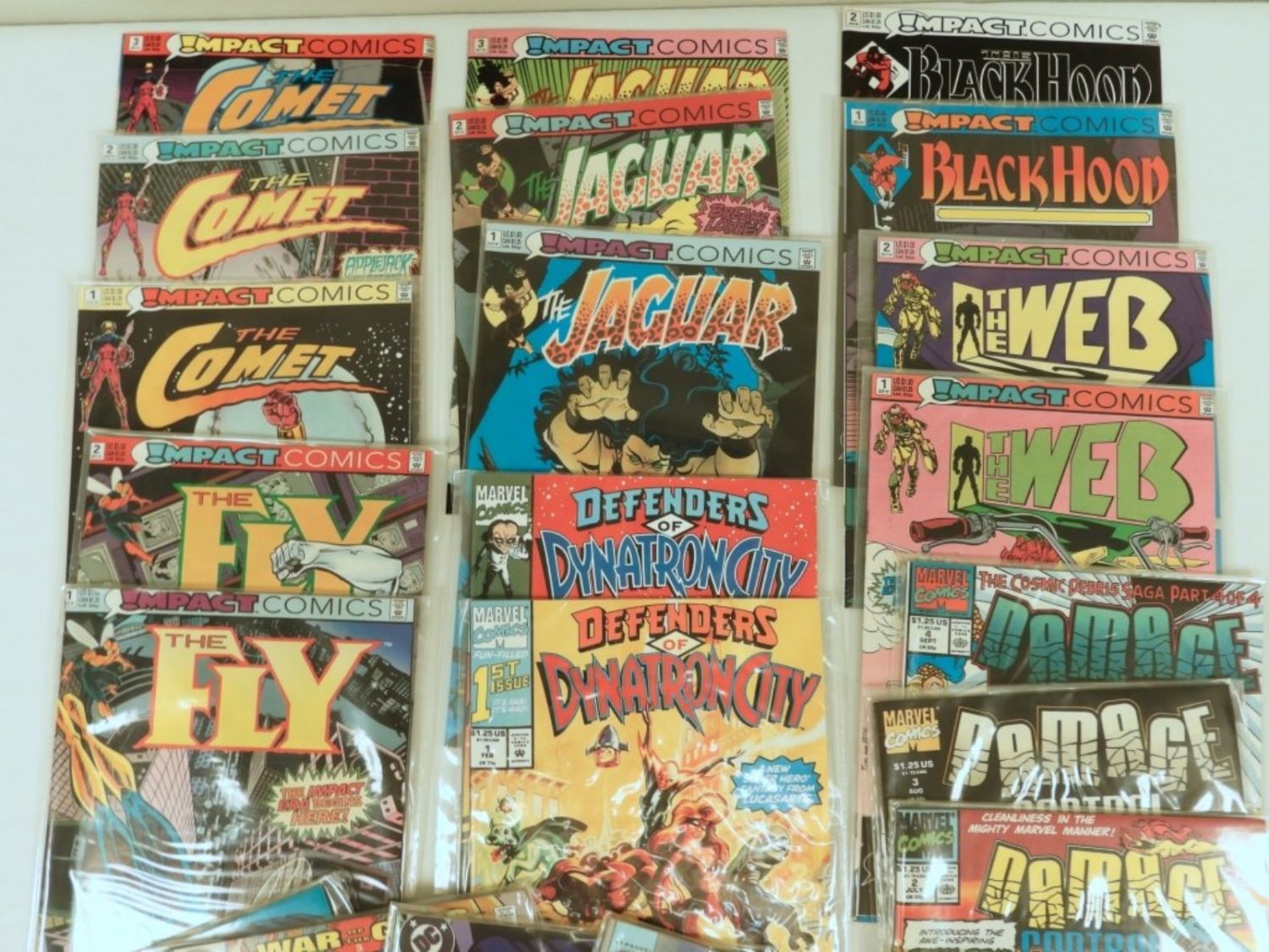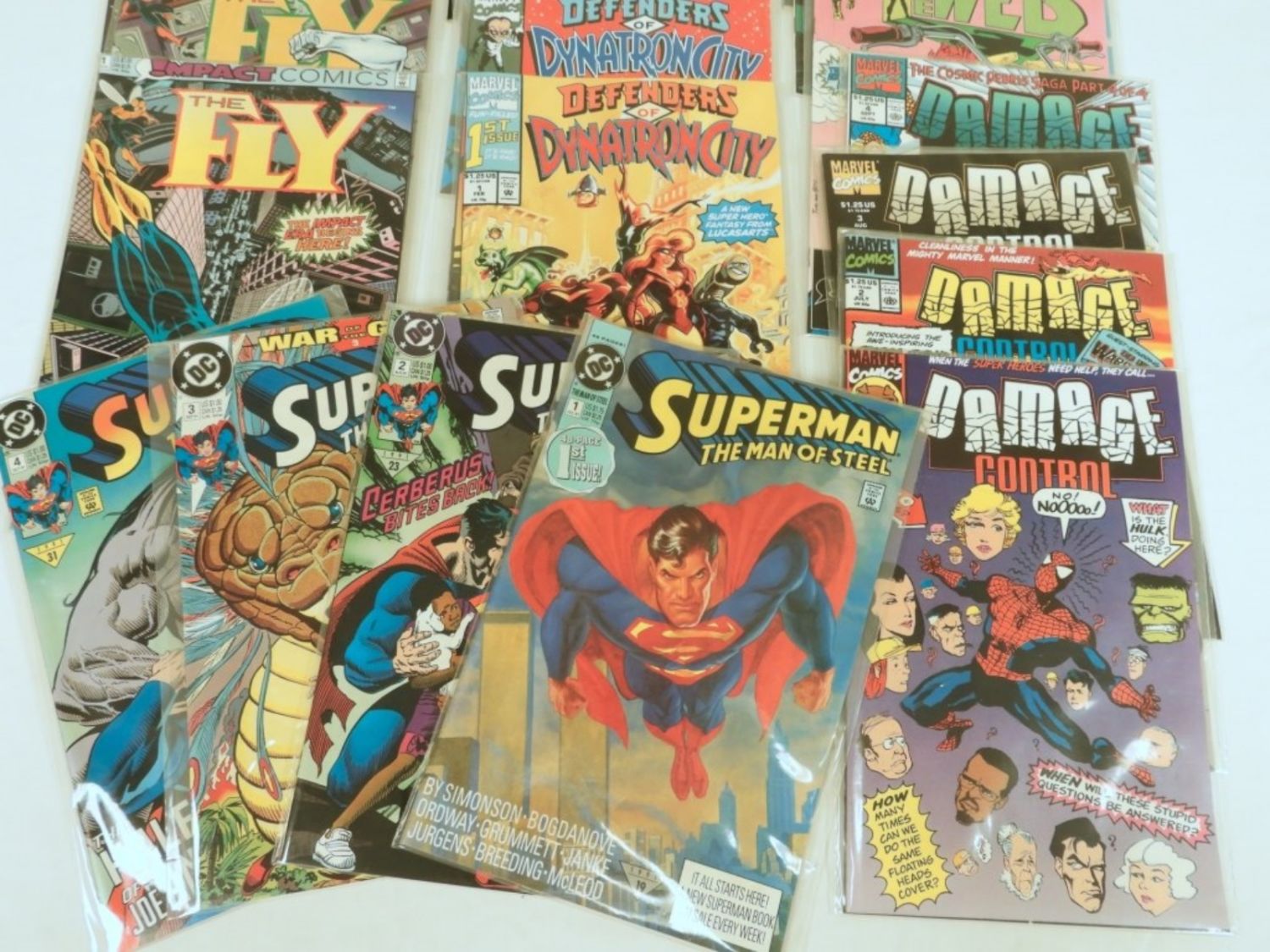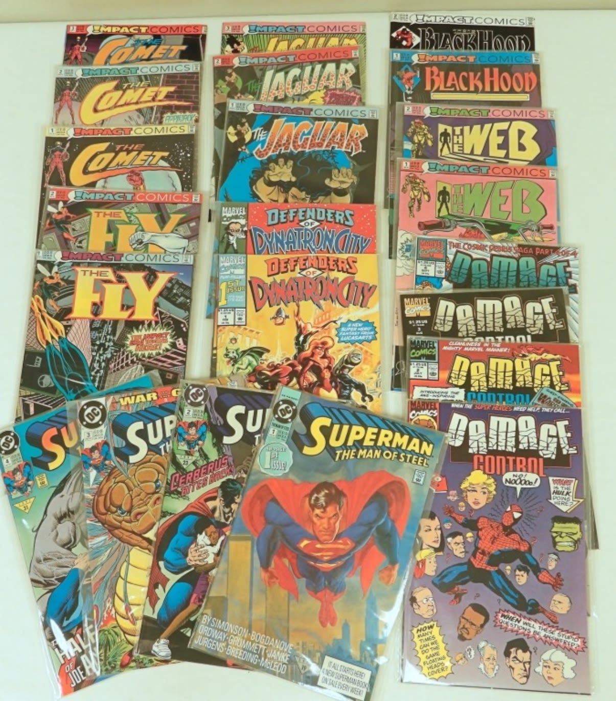 THIS LOT CONTAINS #1 & #2 ISSUES of THE COMET, THE FLY, THE JAGUAR #1-3, DYMNATRON CITY, BLACK HOOD, THE WEB, DAMAGE CONTROL #1-4, SUPERMAN THE MAN OF STEEL #-4 (22 TOTAL) MOSTLE SLEEVED