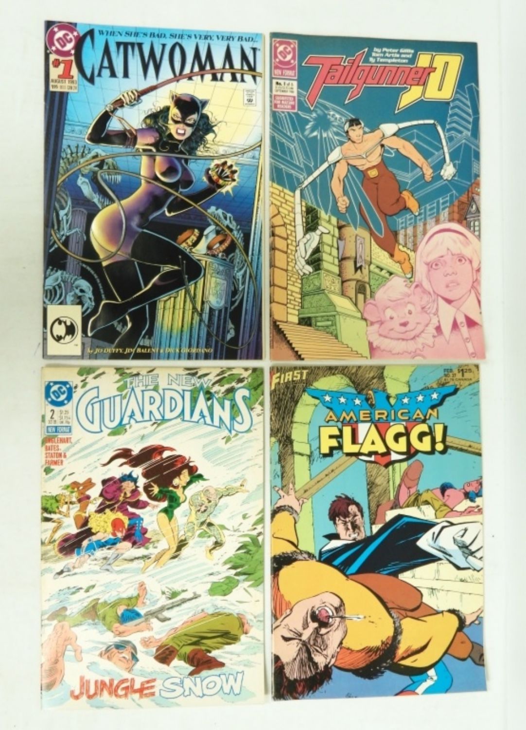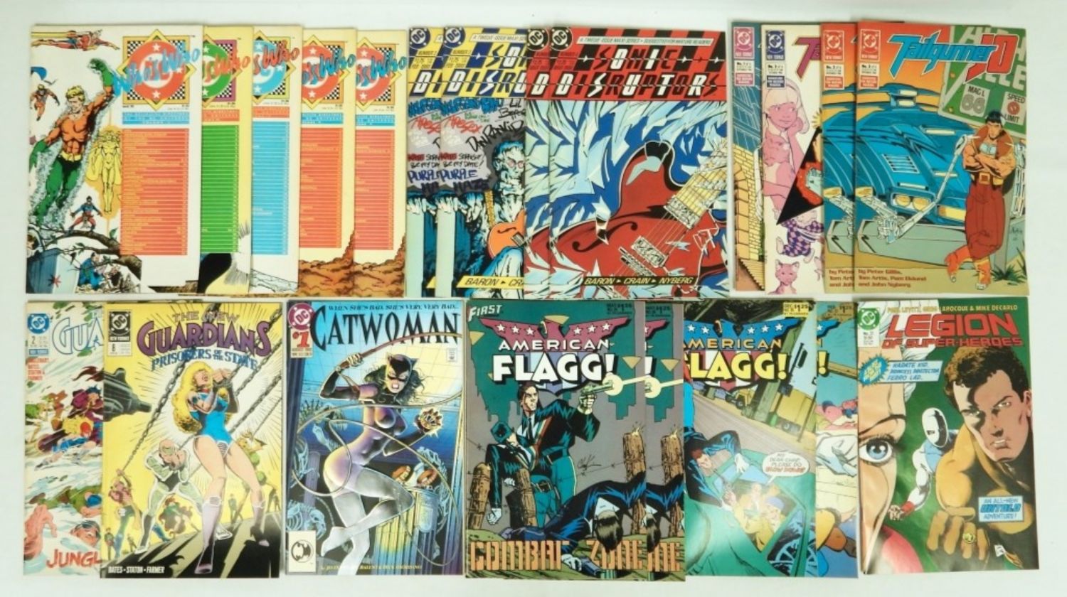 (5) WHO’S WHO DC COMIC 1985; SONIC DISRUPTORS (2) #3, (2) #4; TAILGUNNER JO #1-3 (DUP #3); GUARDIANS #2, #8; CATWOMAN #1; LEGION OF SUPER-HEROES #31; AMERICAN FLAGG (2) #29, #35, #37