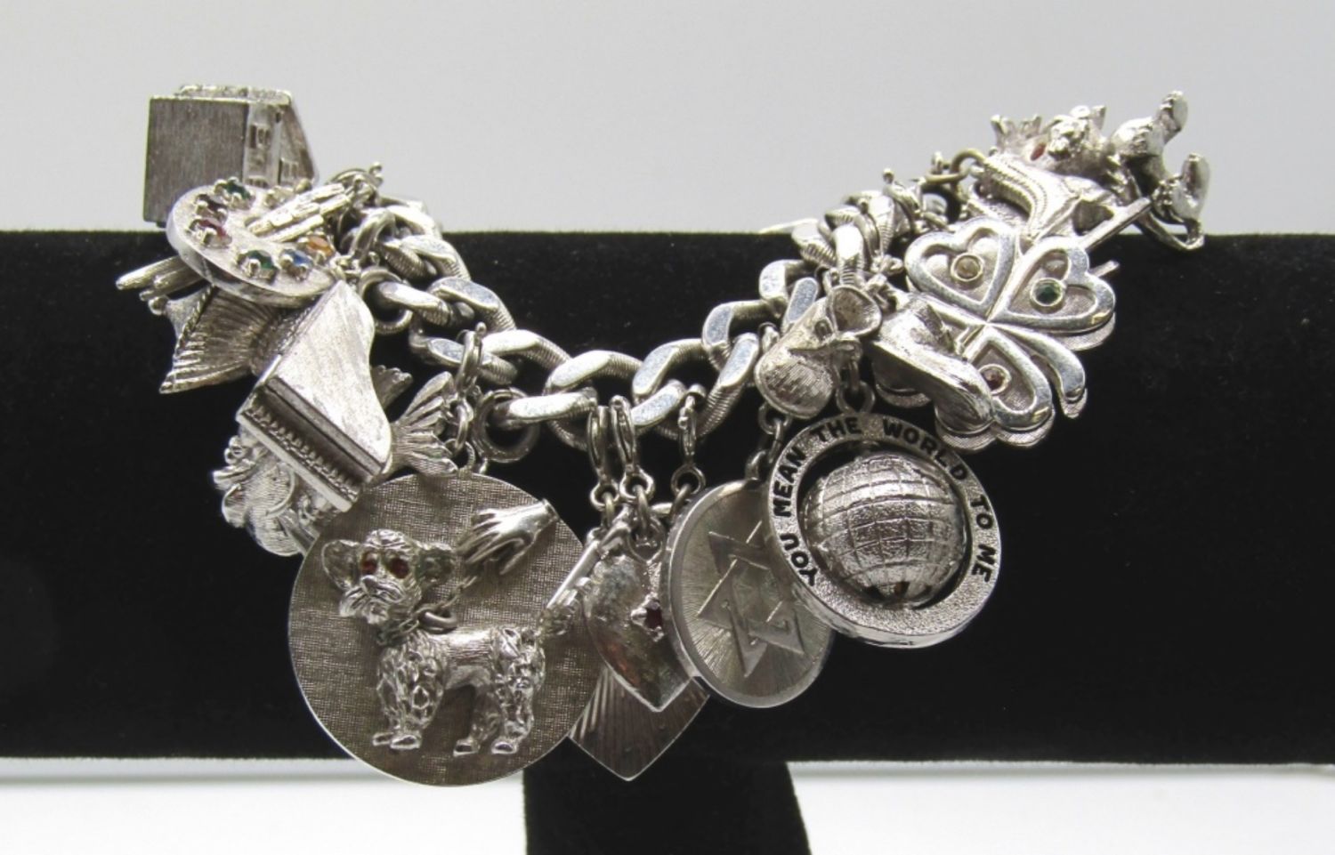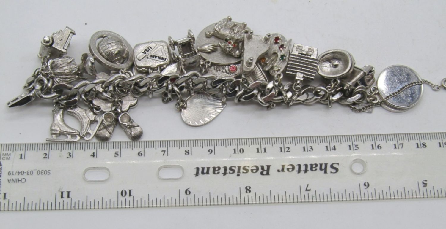 7 1/2IN LONG, OPEN BOX CLASP W/ CATCH CHAIN, BOTH STAMPED MONET, 22 CHARMS ALL HAVE SPRING CLASP SO THEY CAN BE TAKEN OFF