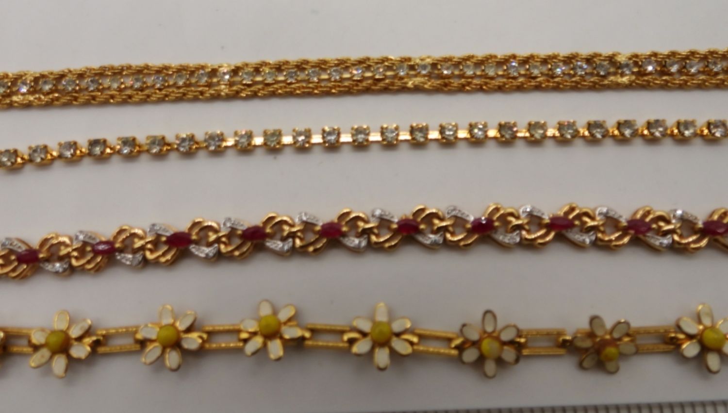 ALL 7IN LONG, 2- CLEAR STONE WITH OPEN BOX CLASP, 1 DAISY STYLE WITH SPRING CLASP, 1 TENNIES STYLE BRACELET WITH RED AND CLEAR STONES