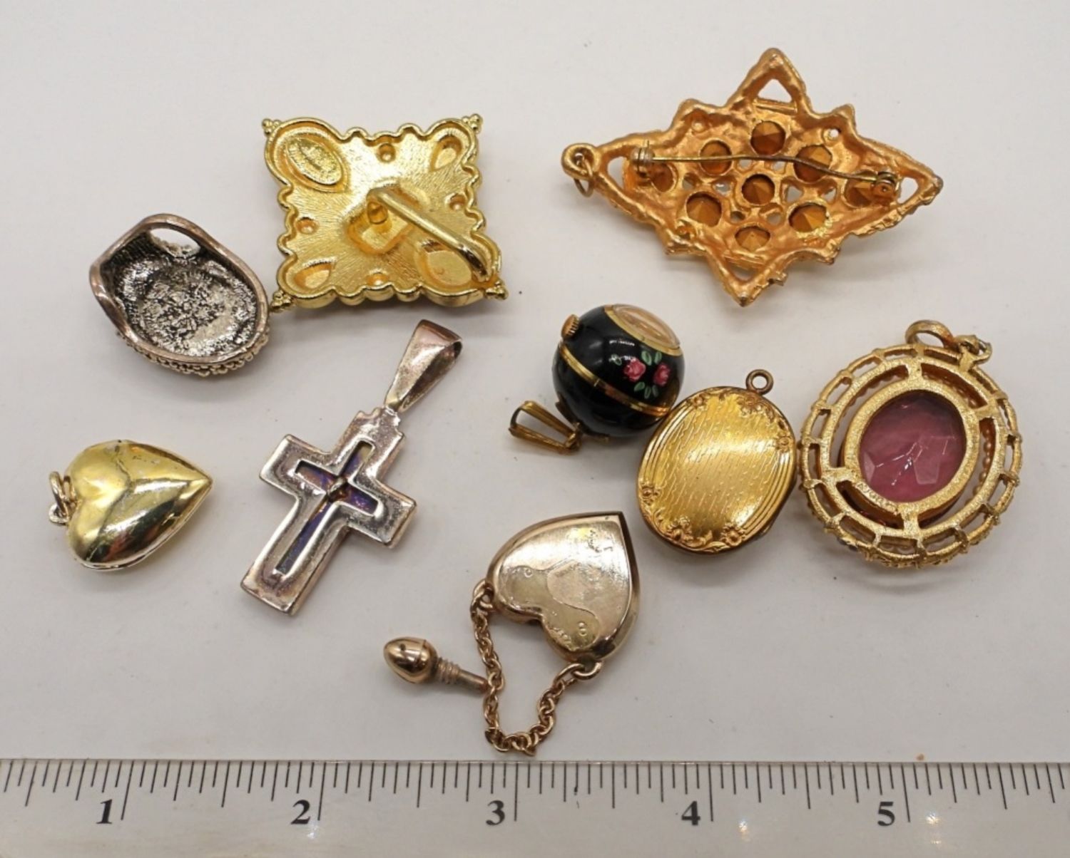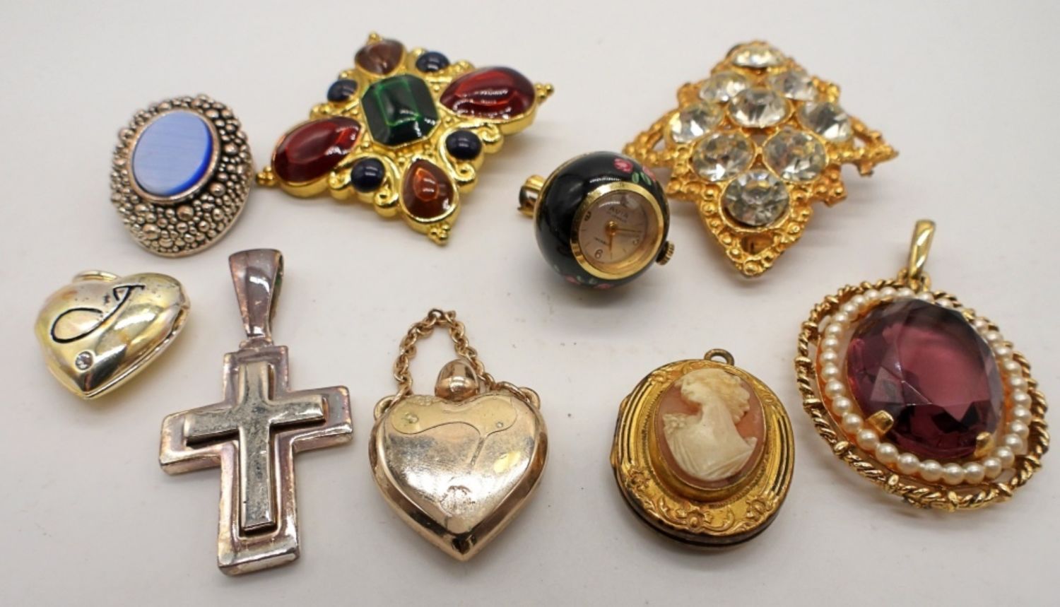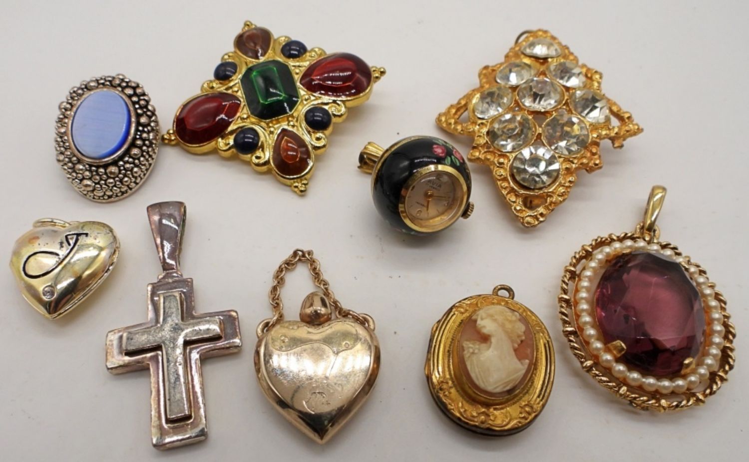 BETWEEN 1IN – 2 1/2 IN LONG, 2 LOCKETS CAMEO AND HEART, 1 SILVER TONE WITH BLUE INLAY OVAL, A CROSS, PERFUME HEART, A CIRCLE WATCH PENDANT (NOT TESTED), A PURPLE OVER PENDANT, 2 STONE PENDANTS,