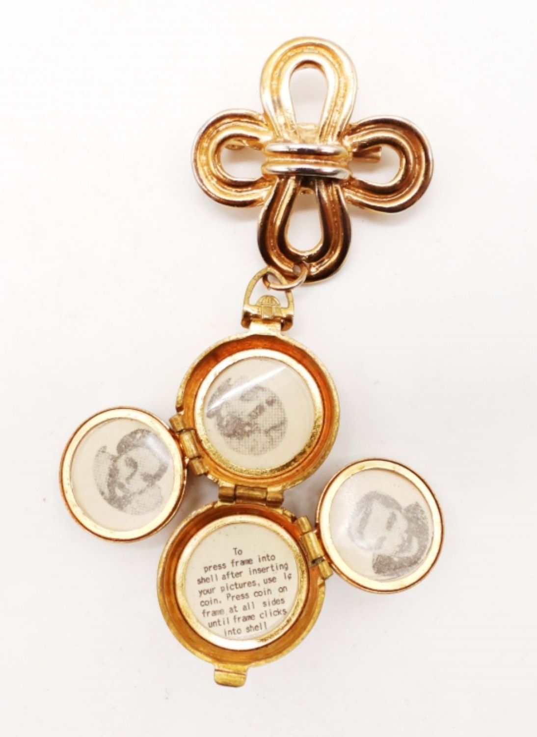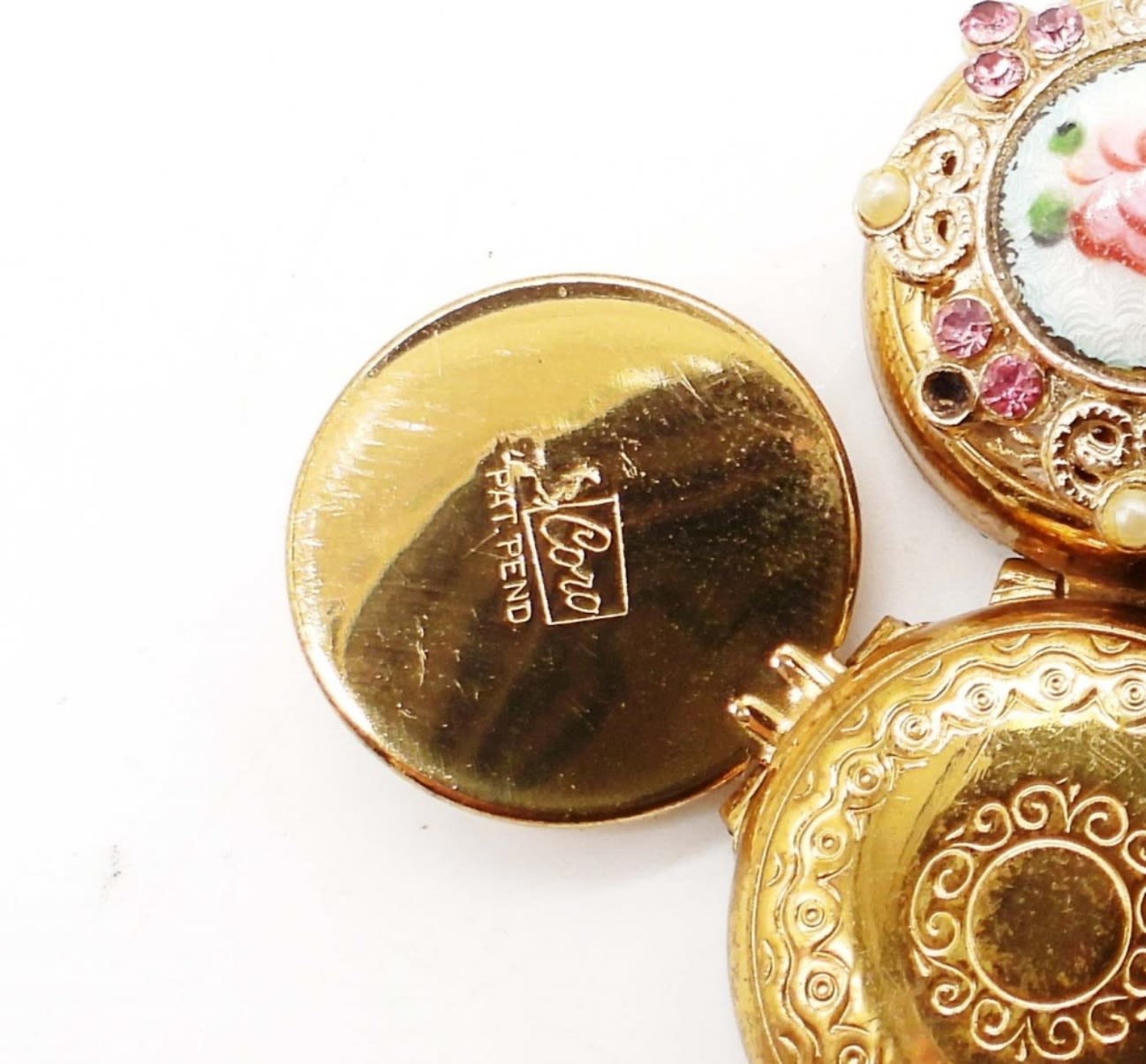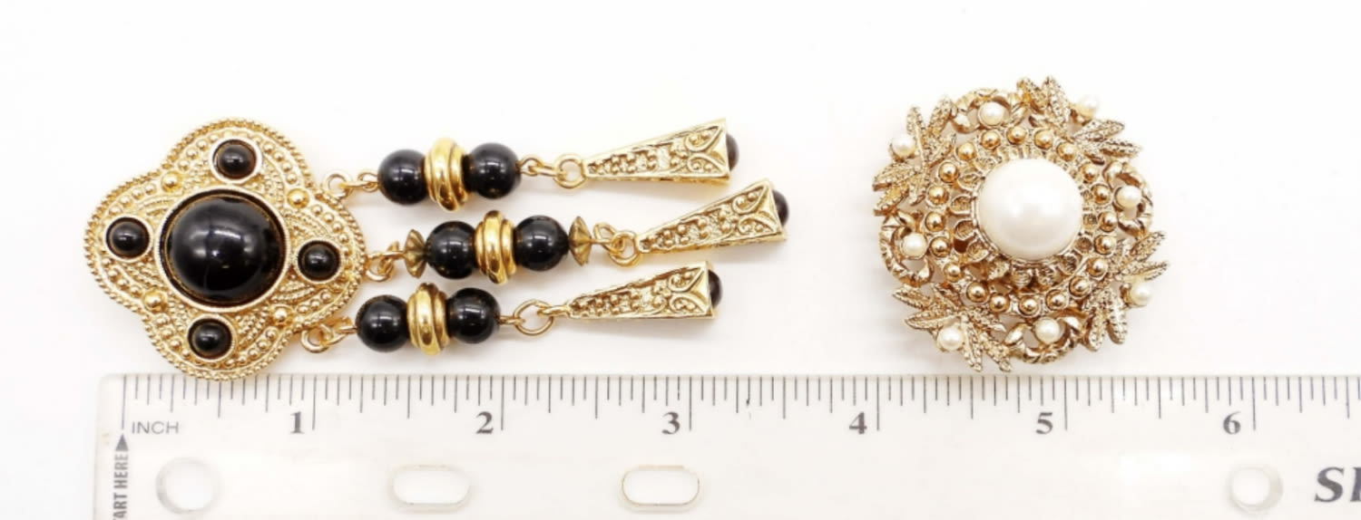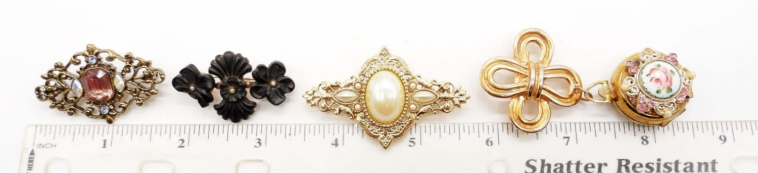 ALL BETWEEN 1 1/2IN TO 3IN LONG, 1 FAUX PEARL WITH PINK STONES PAINTED FLOWER, OPENS INTO A LOCKET, STAMPED WITH CORO ON THE INSIDE, 1 BLACK FLOWER, 1 GOLD TONE AND BLACK ONYX DANGLE, 2 FAUX PEARL AND GOLD TONE BROOCHES, 1 BLUSH AND BLUE STONE