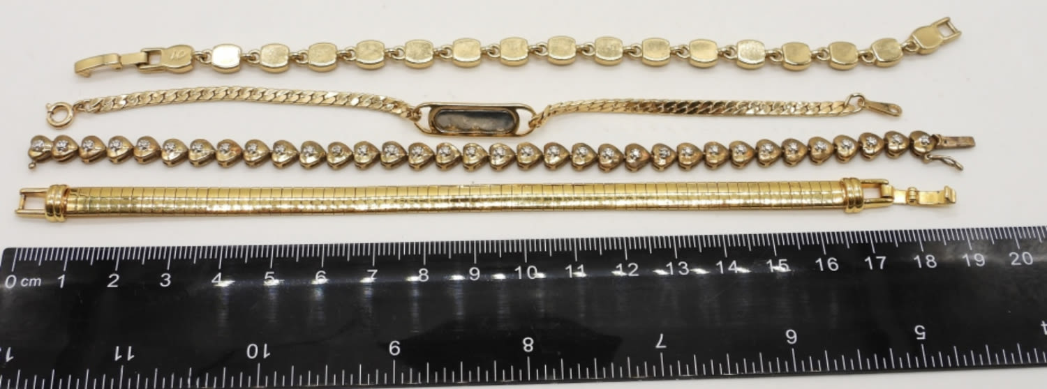 3- 7 1/2IN LONG, OMEGA, SERPENTINE, GREEN AND YELLOW INLAY STONES, 1- HEART TENNIS BRACELET STYLE 8IN LONG