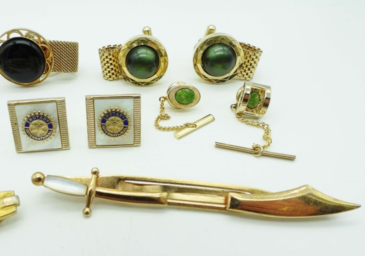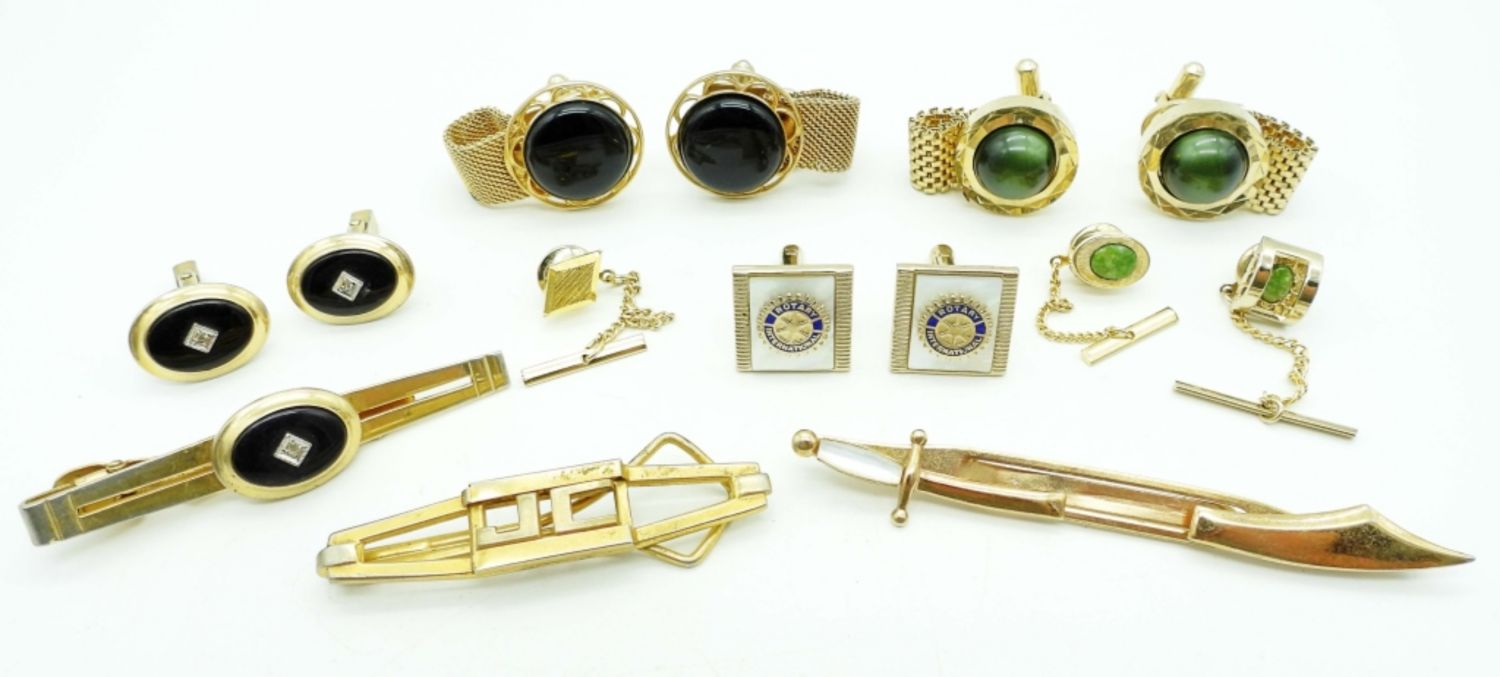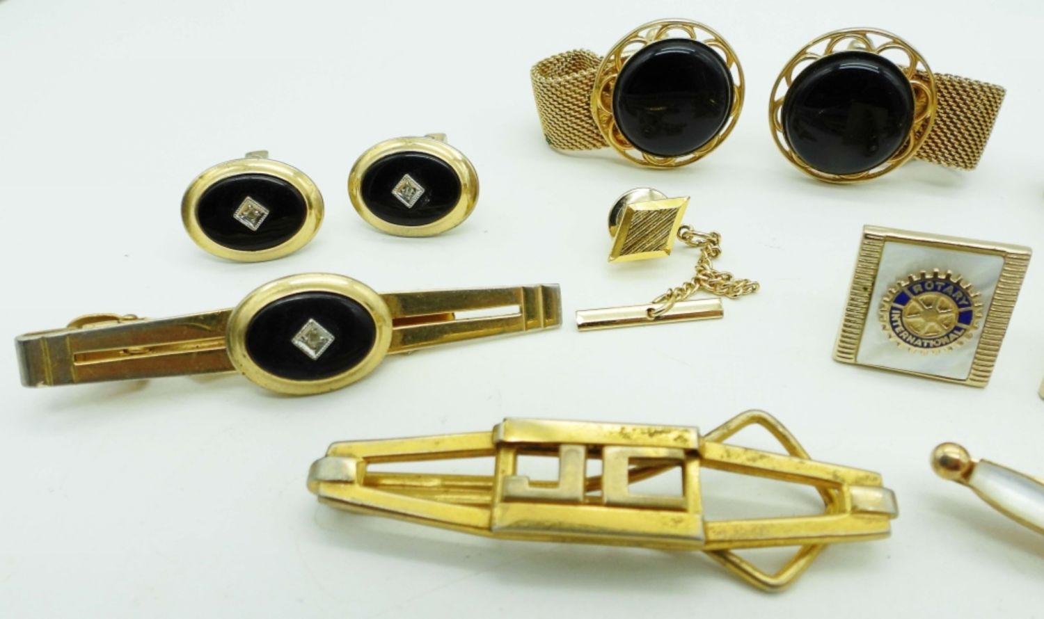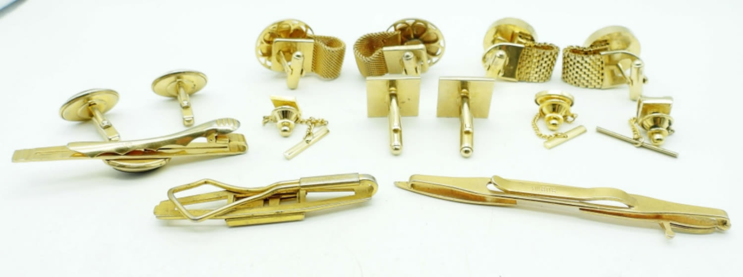 4- GOLD TONE CUFFLINKS, 3- TIE PINS,3- TIE CLIPS