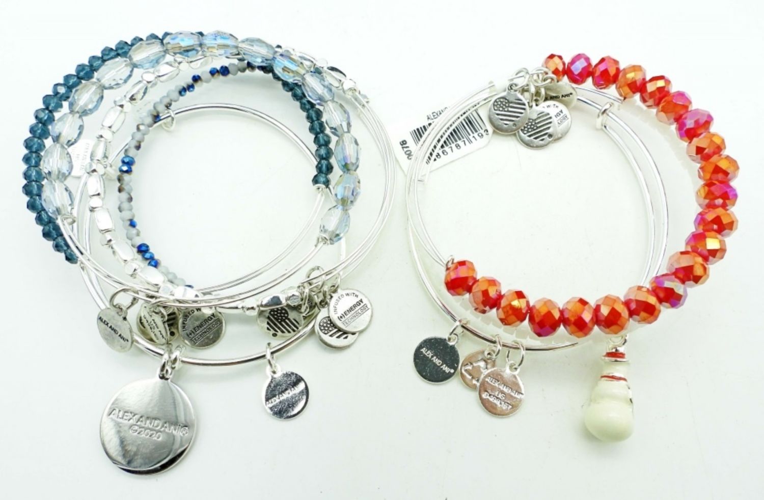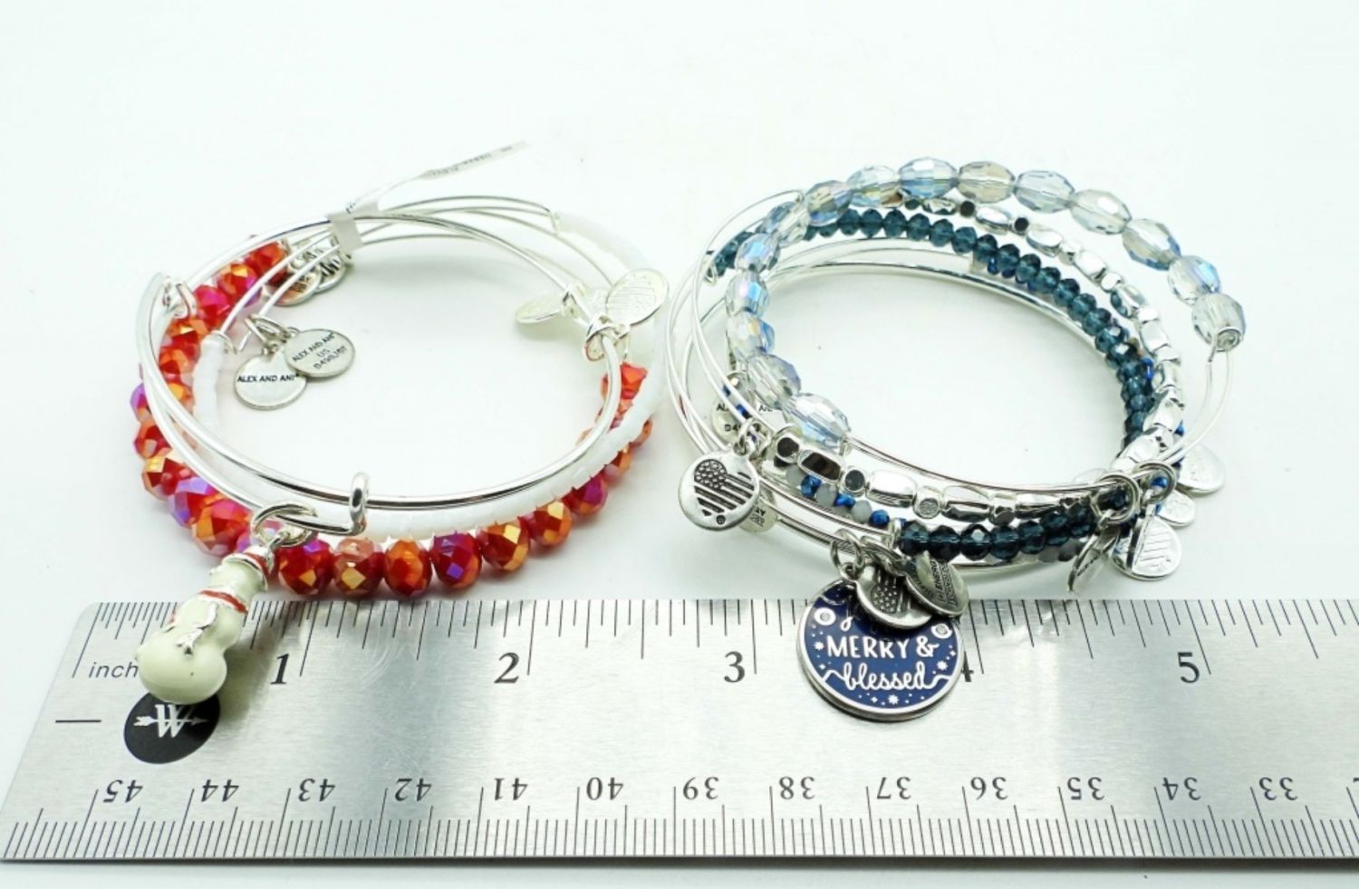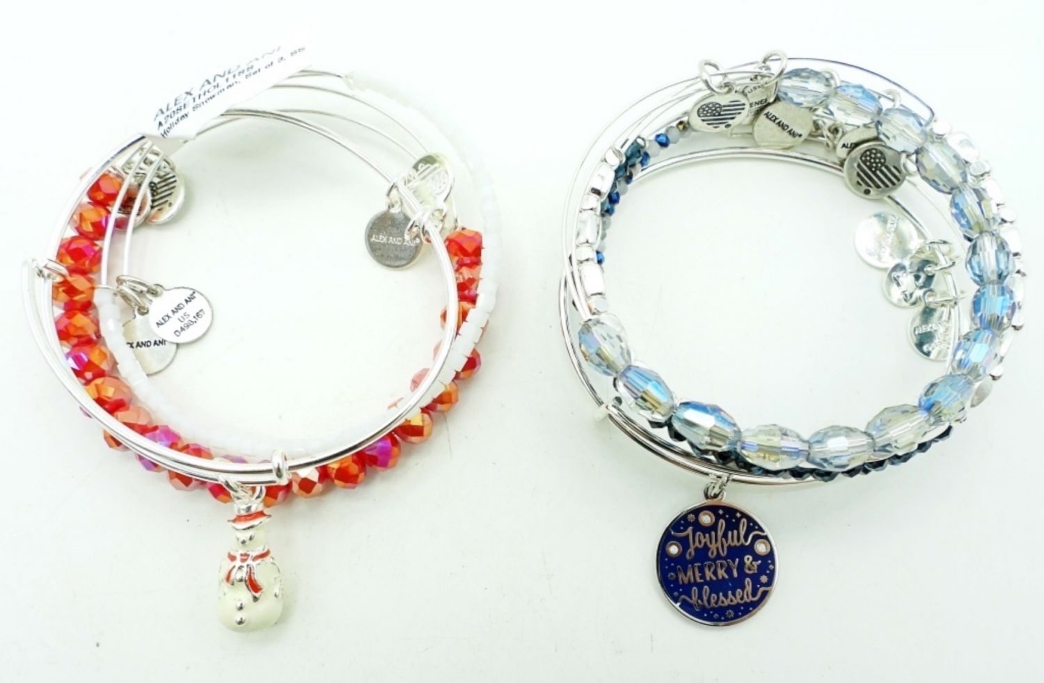 ALL SILVER TONE, 3IN WIDE, STAMPED WITH MAKER, RED, WHITE, BLUE BEADS ON BRACELETS,” A JOYFUL MERRY AND BLESSED” CHARM, AND A SNOWMAN CHARM