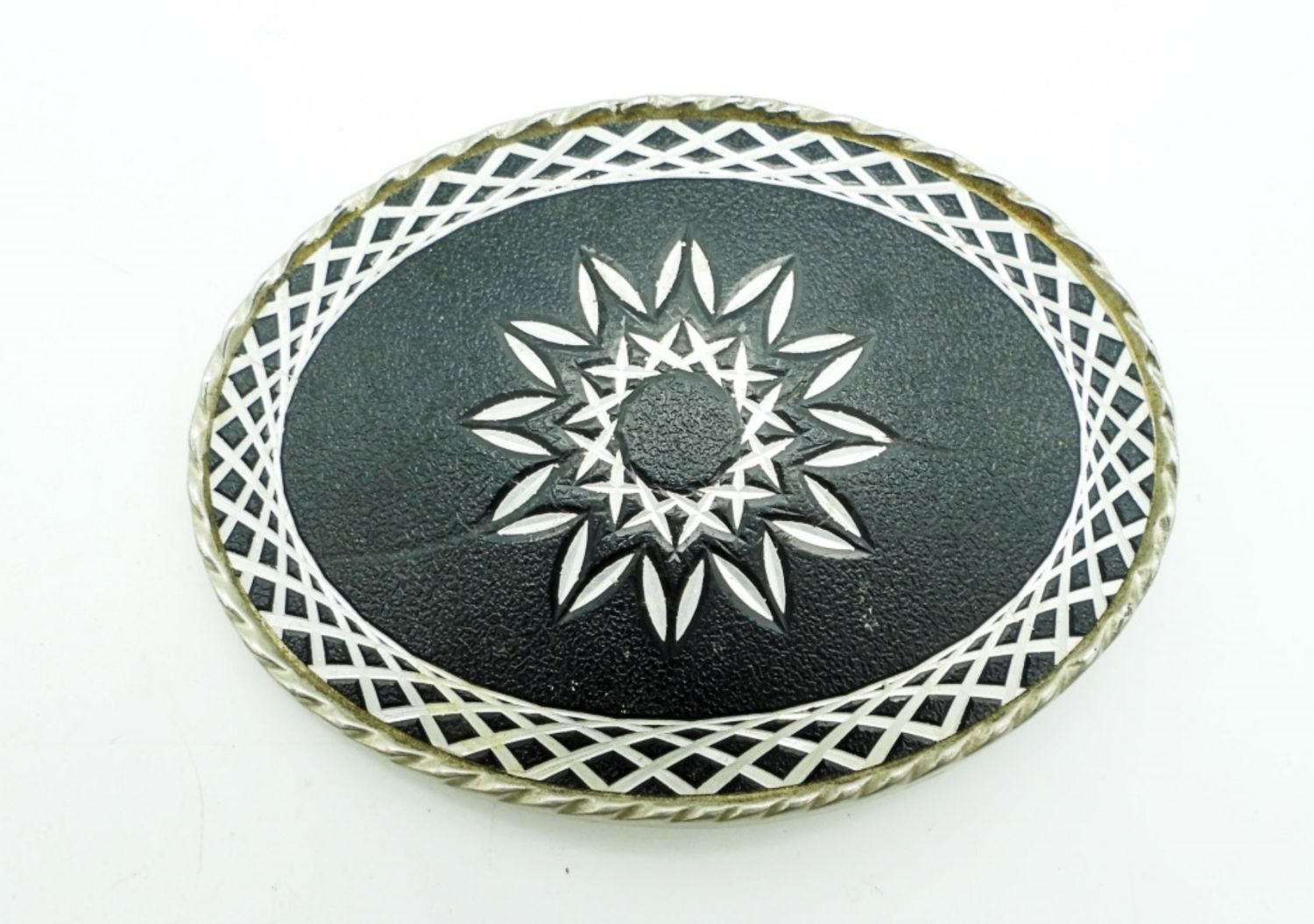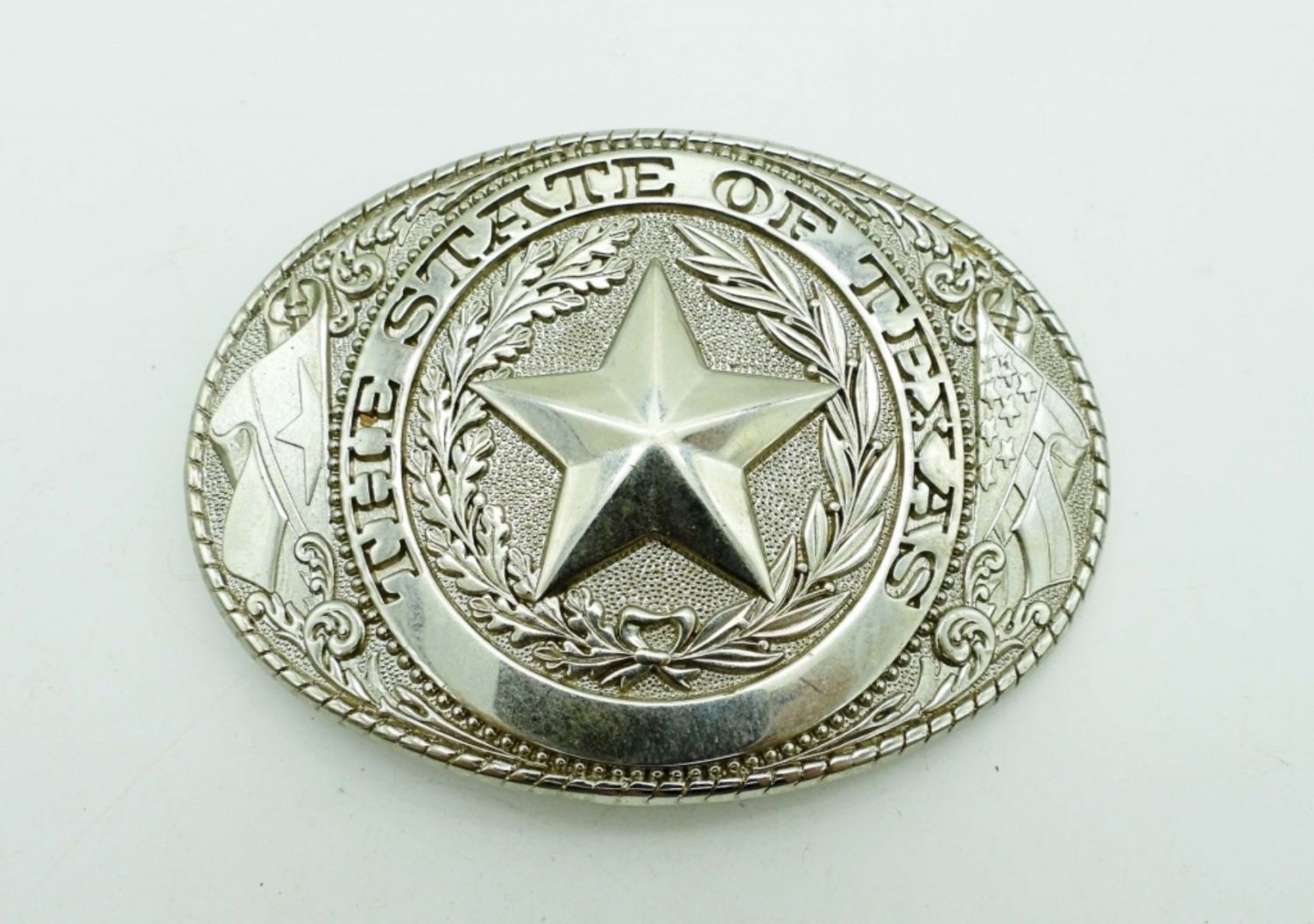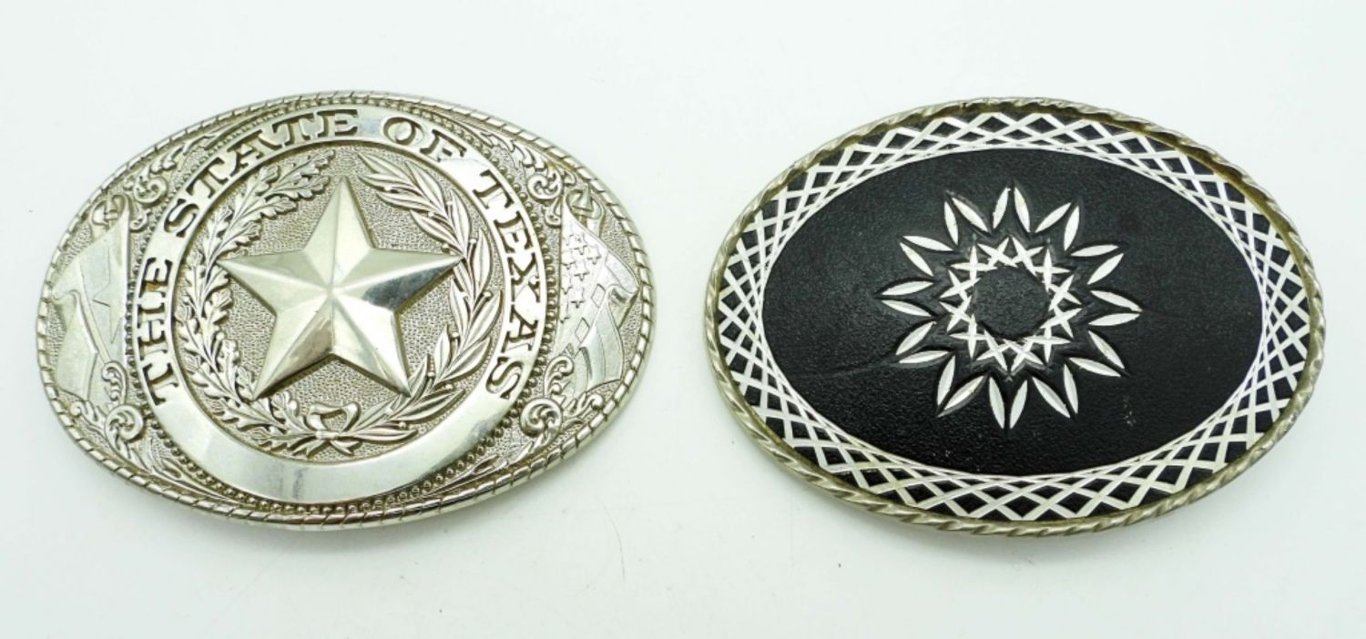 SILVER TONE NEAR 4IN WIDE, 1 STATE OF TEXAS WITH STAR IN THE MIDDLE, 1 BLACK INLAY WITH ETCHED SILVER TONE DESIGN