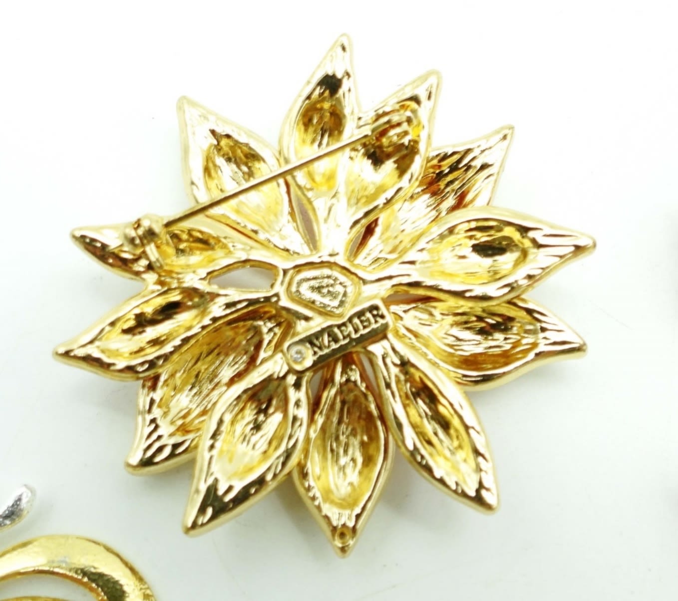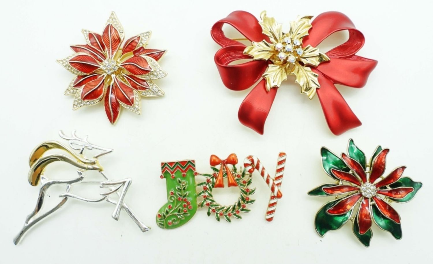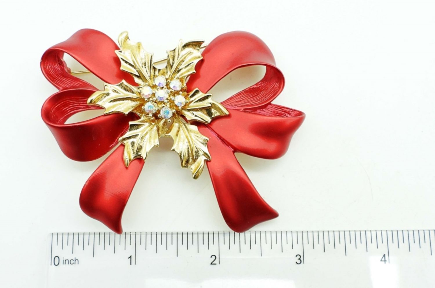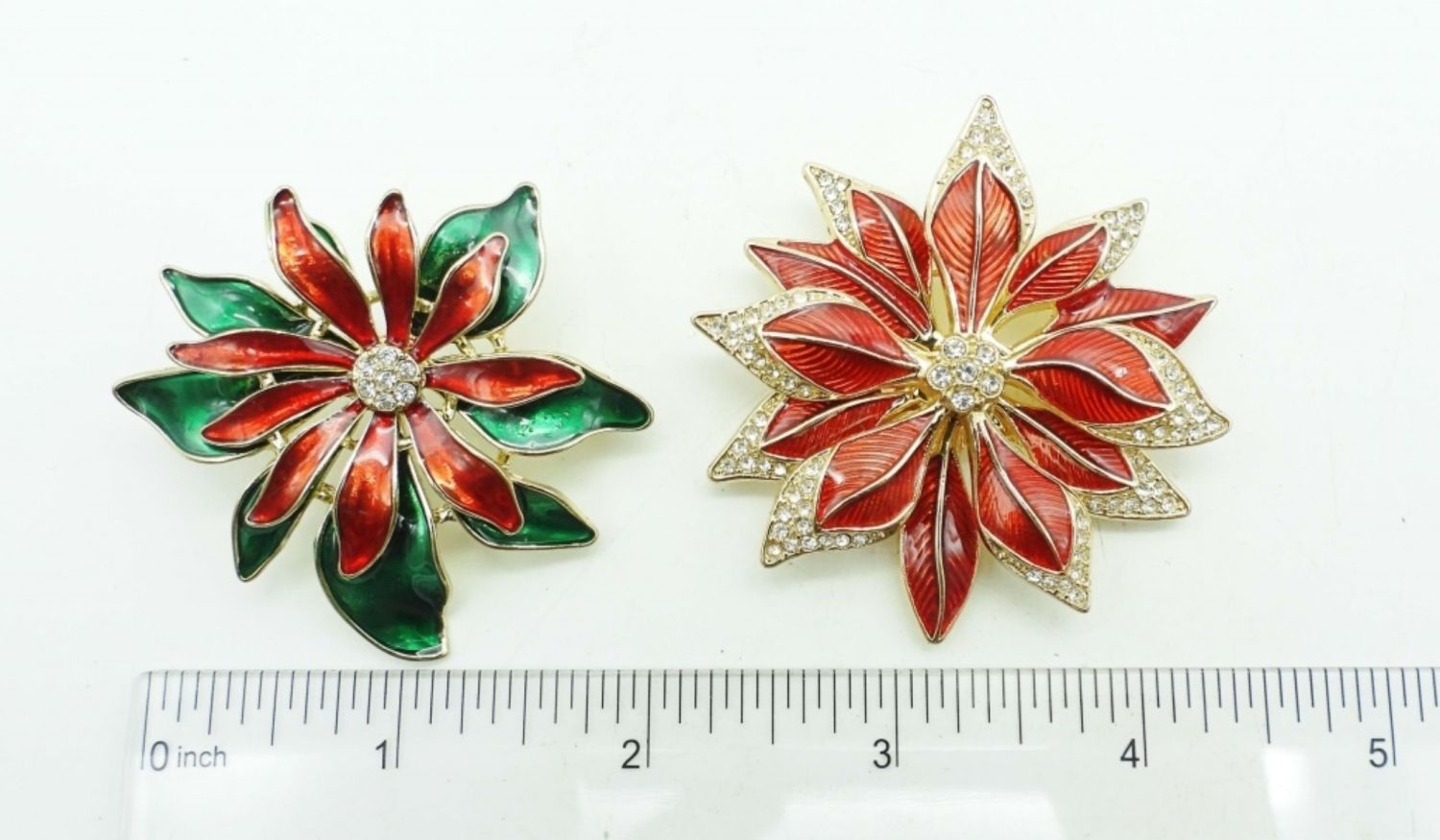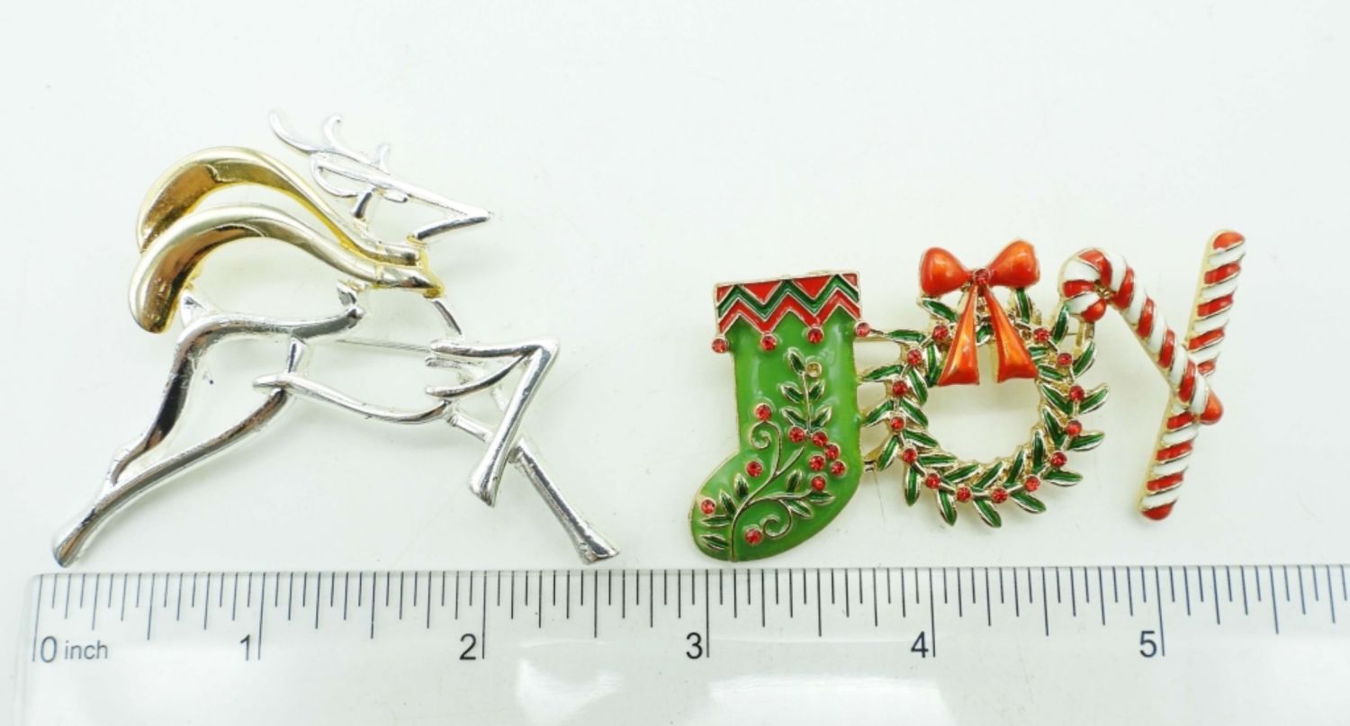 BETWEEN 2-3IN LONG, THE RED WITH CLEAR STONES IS A NAPIER BRAND STAMPED ON BACK,