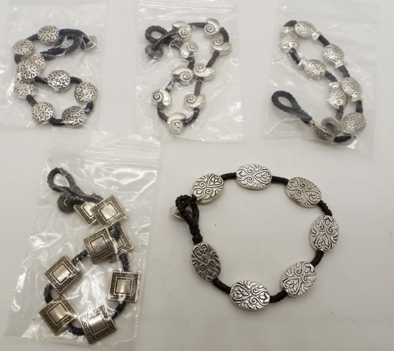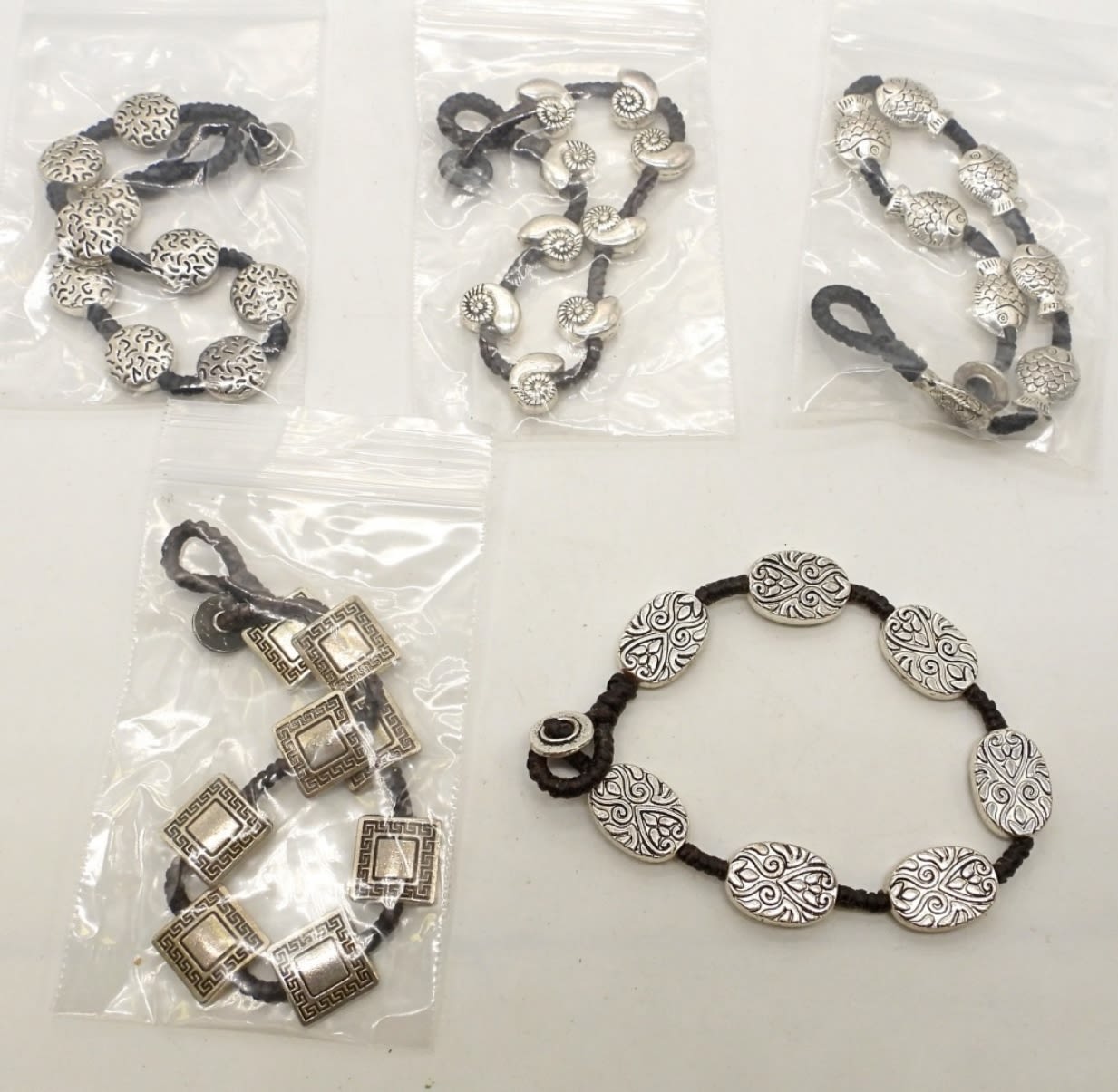 1- SEASHELL, 1- FISH, 1 SQUARE WITH DESIGN, 1 OVAL, 1 CIRCLE, W A TOGGLE CLASP