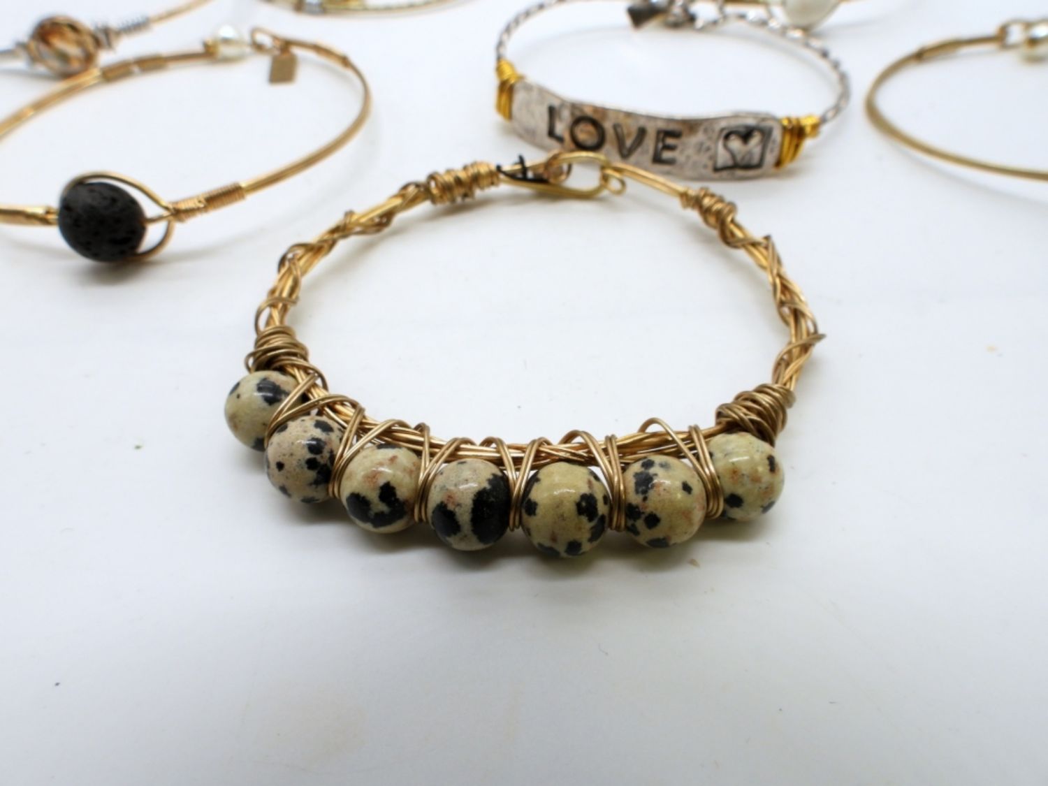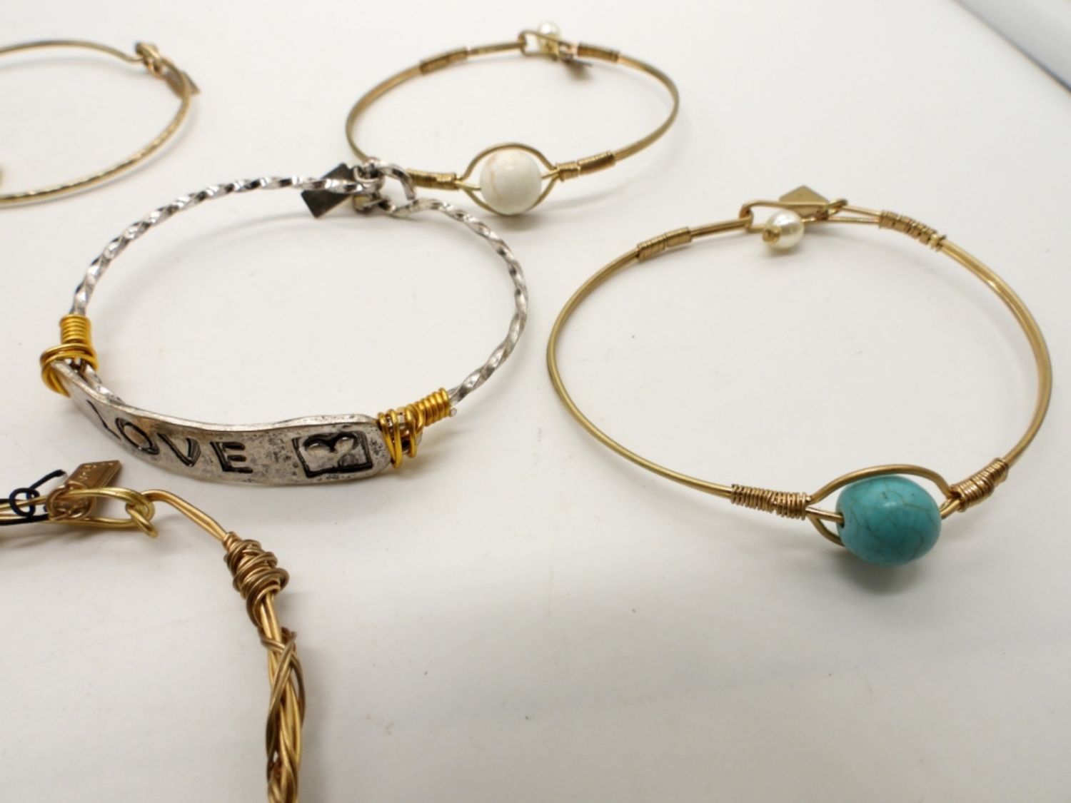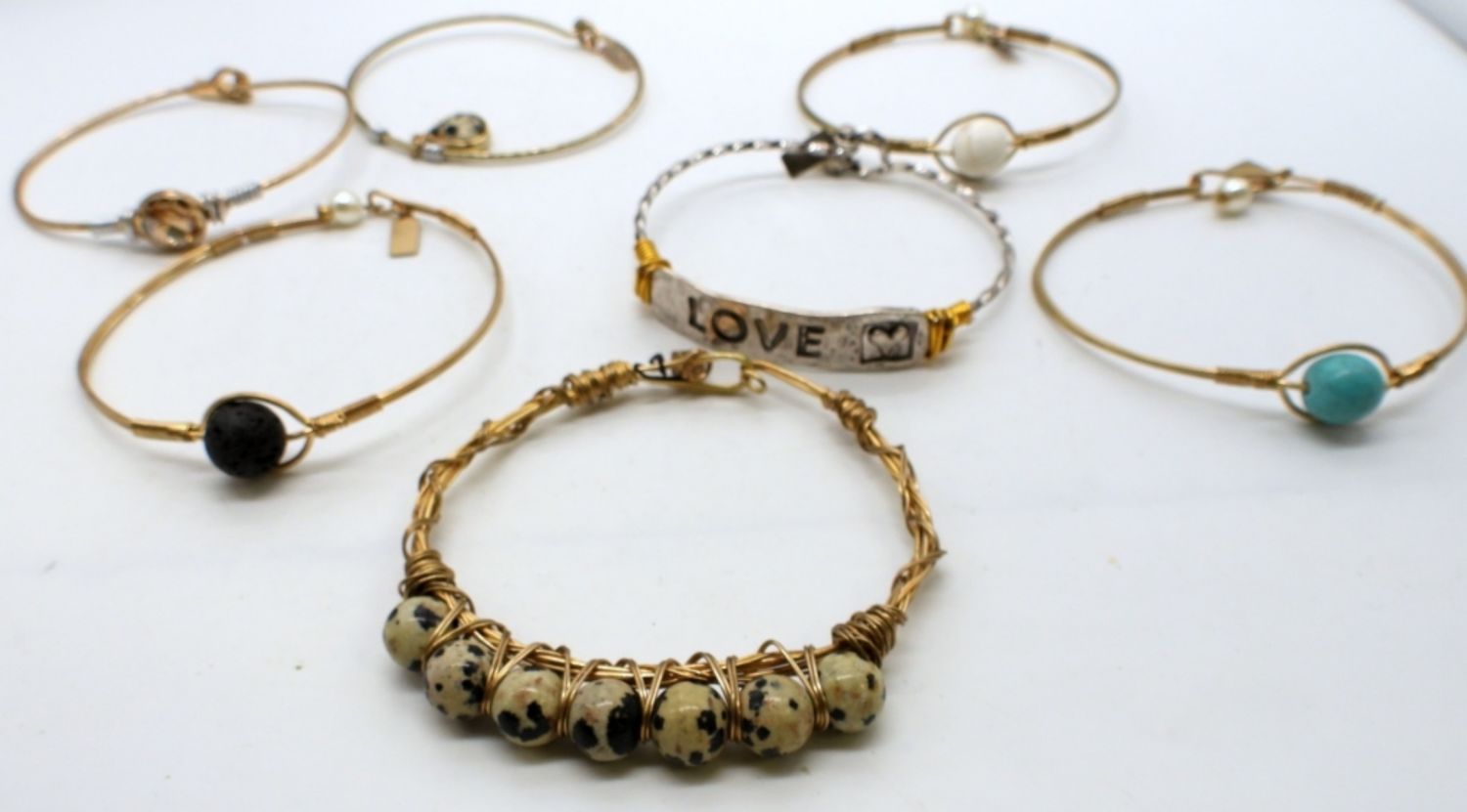 ALL STAMPED WITH BRAND NAME,6 ALL GOLD TONE SOME WITH TURQUIOSE, LAVA ROCK, WHITE STONE, YELLOW CLEAR STONE, AND DALMATION STONES, 1 SLIVER NAME PLATE WITH THE WORD LOVE, HOOK CLASP