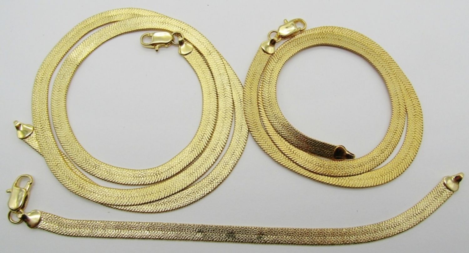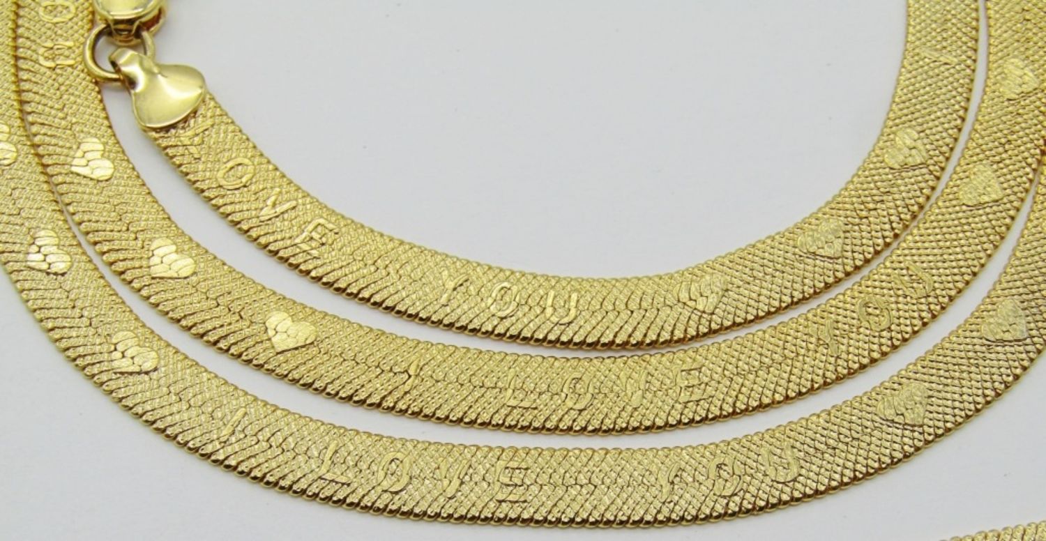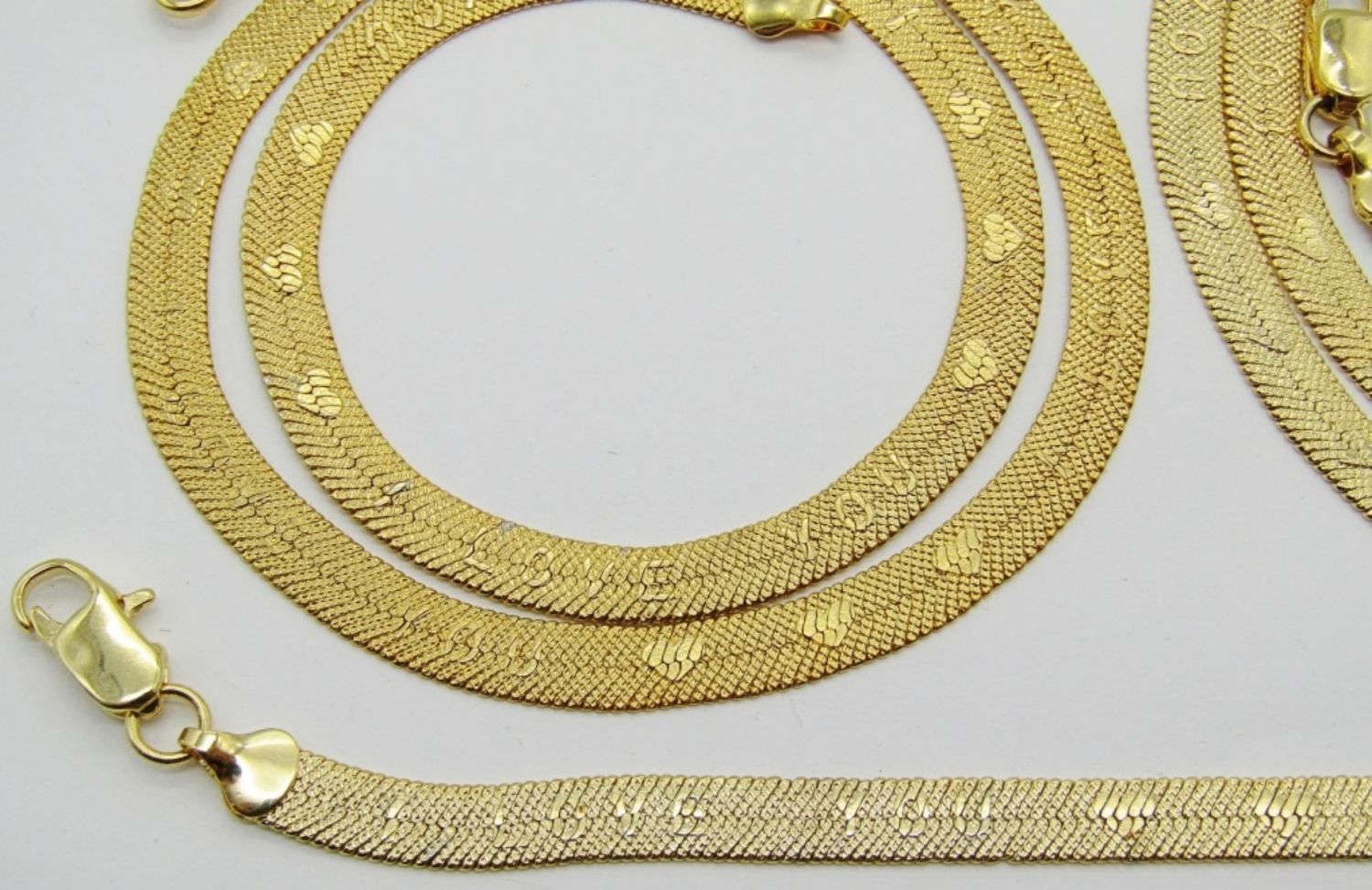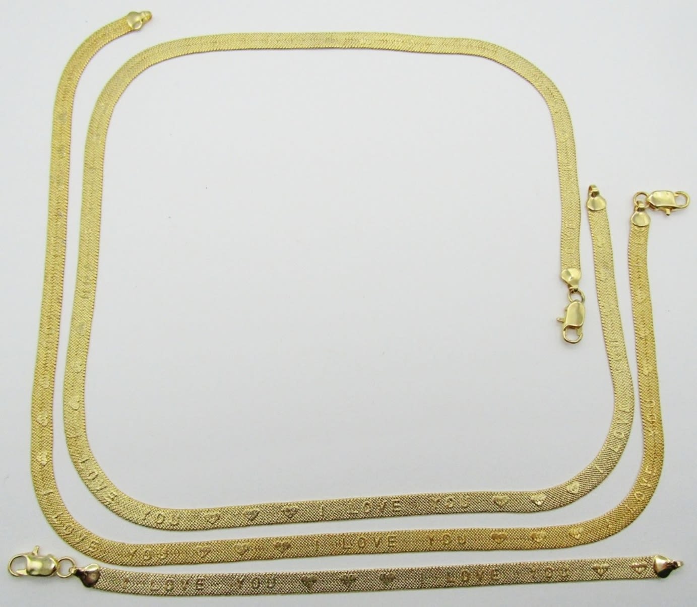 18IN AND 24 IN LONG FOR THE NECKLACES, LOBSTER CLASP, HAS I LOVE YOU WITH HEARTS ETCHED IN THE CHAIN, BRACELET IS THE SAME AT 7 1/2 LONG