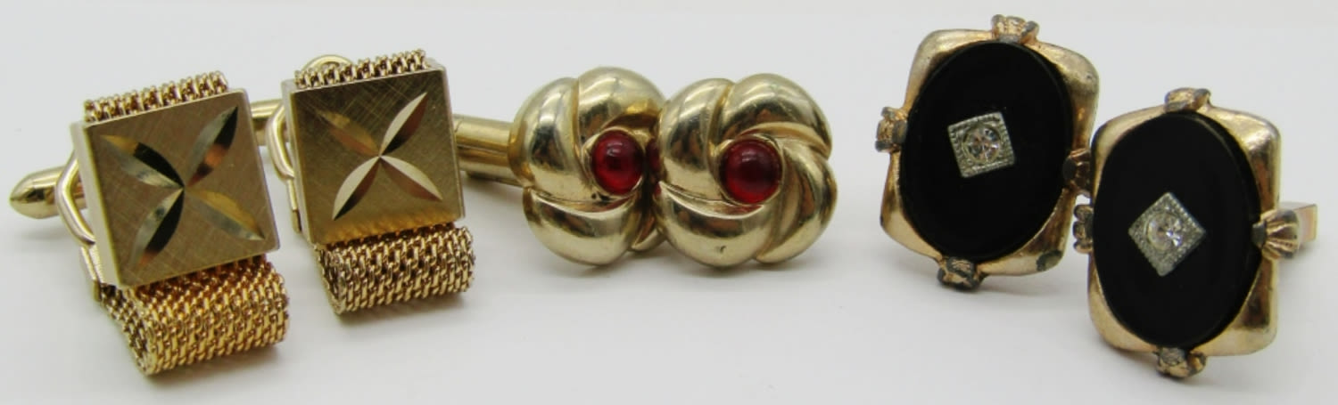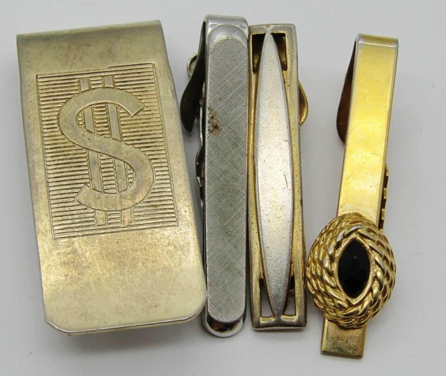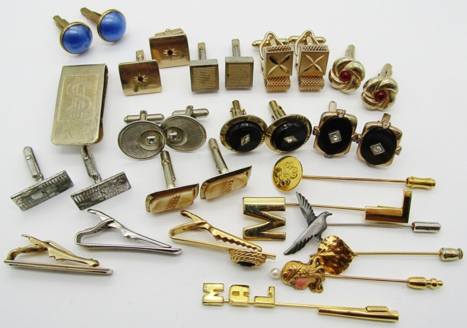 GOLD AND SILVER TONES, 1 MONEY CLIP, 6 TIE PINS, 3 TIE CLIPS, 10 CUFFLINKS