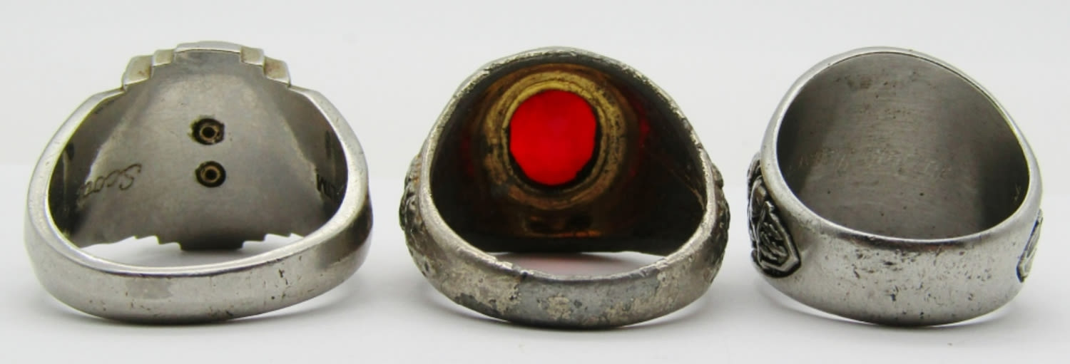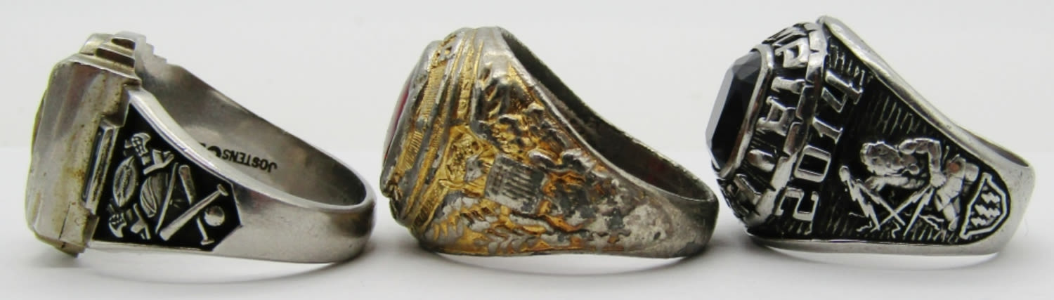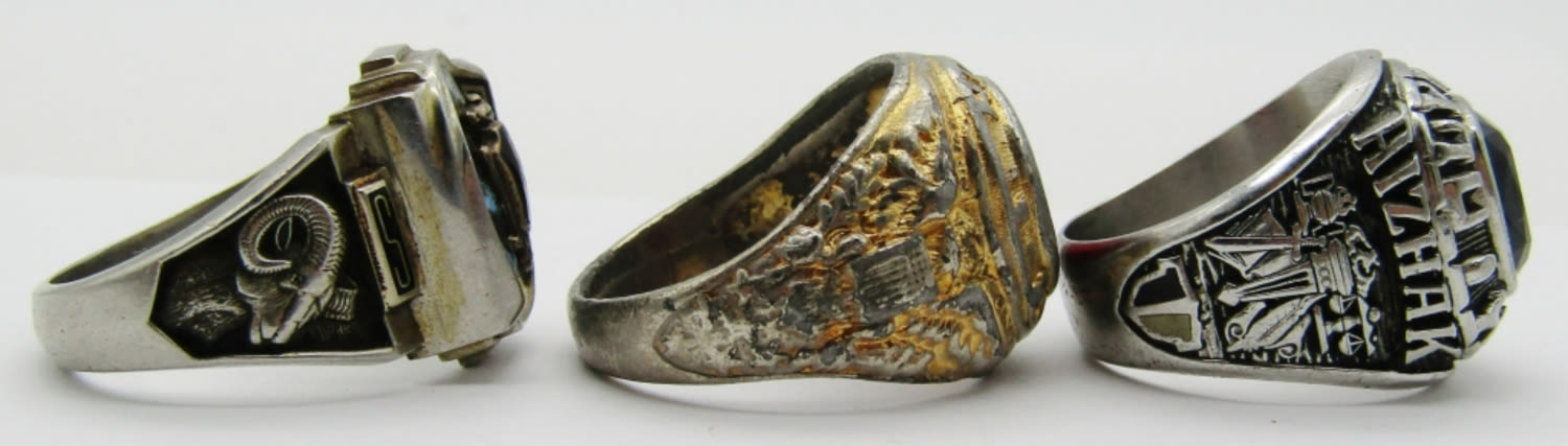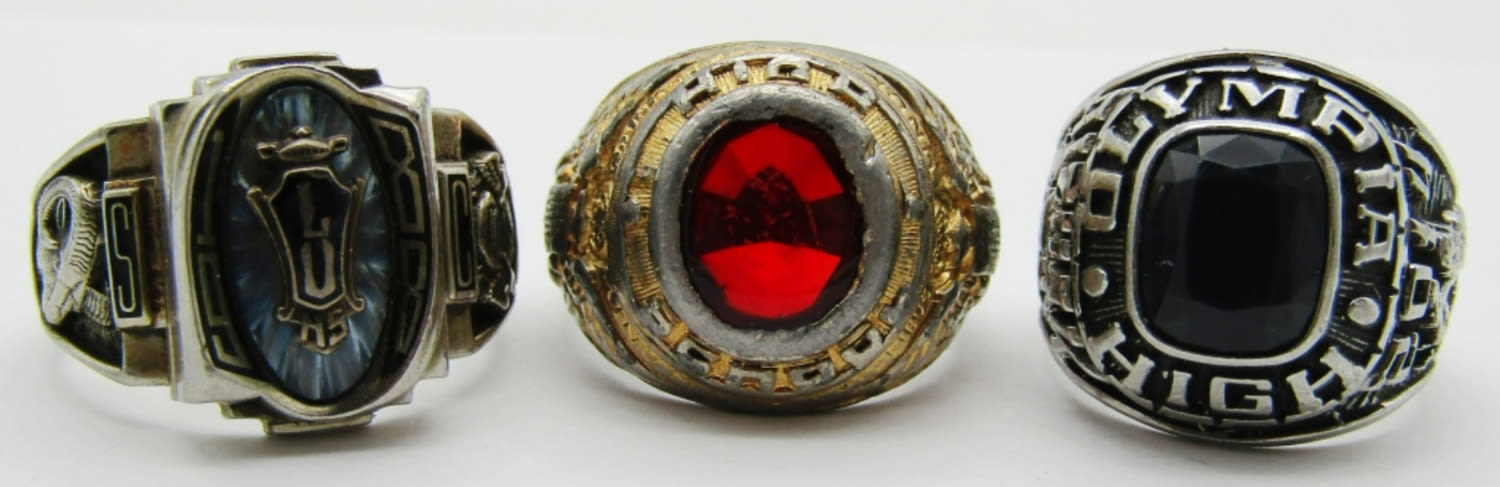 SIZE 9, 10 1/2, 11, 1- CLASS OF 1988 W/BLUE INLAY STONE SILVER TONE, 2014 OLYMPIA HIGH BLACK ONYX STONE SLIVER TONE, 1 GOLD TONE WITH GARNET STONE