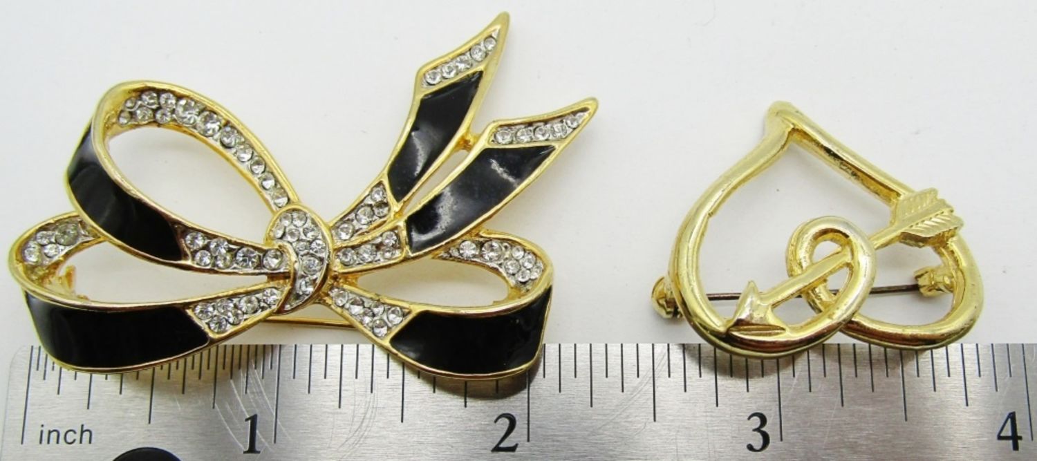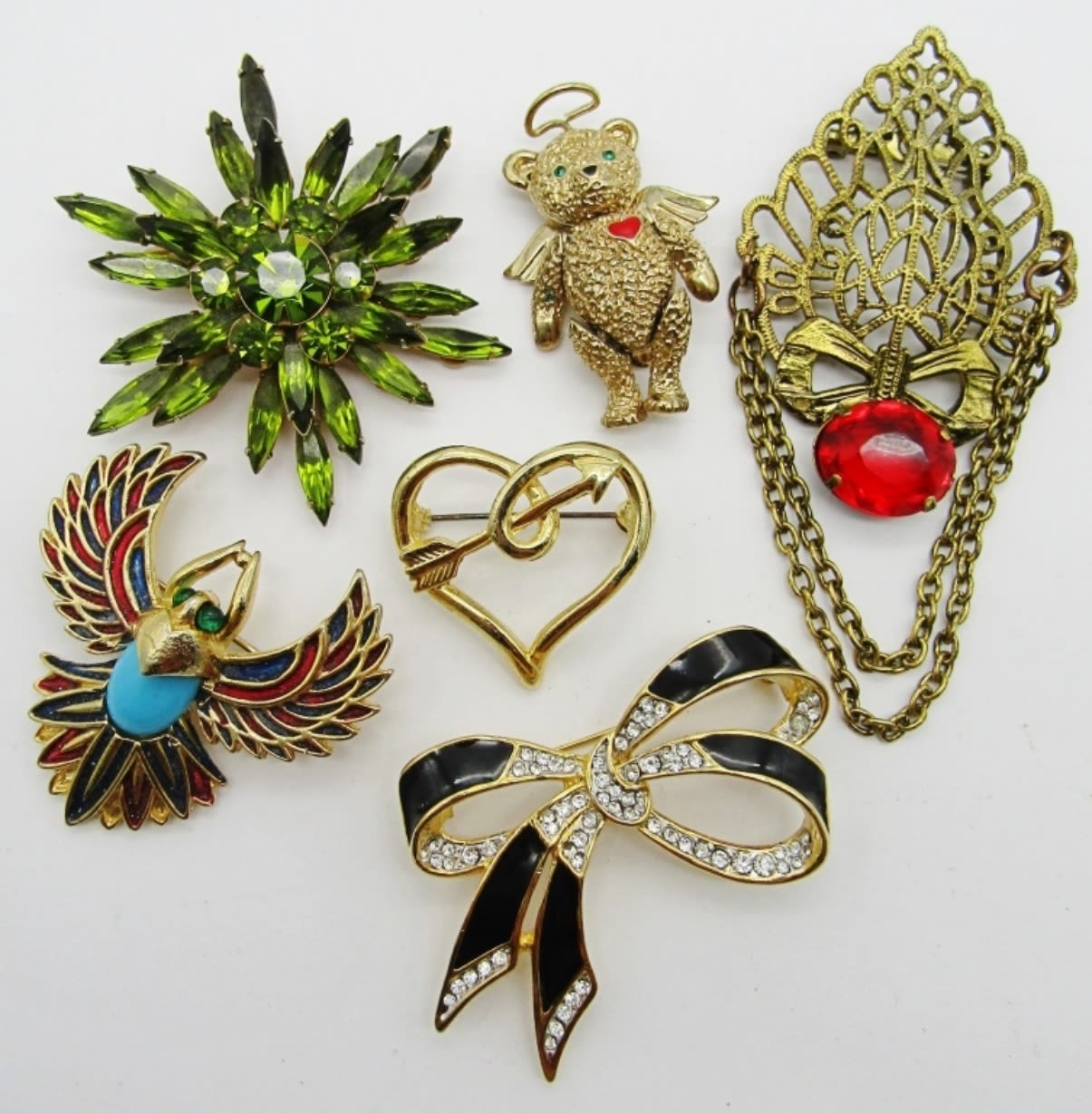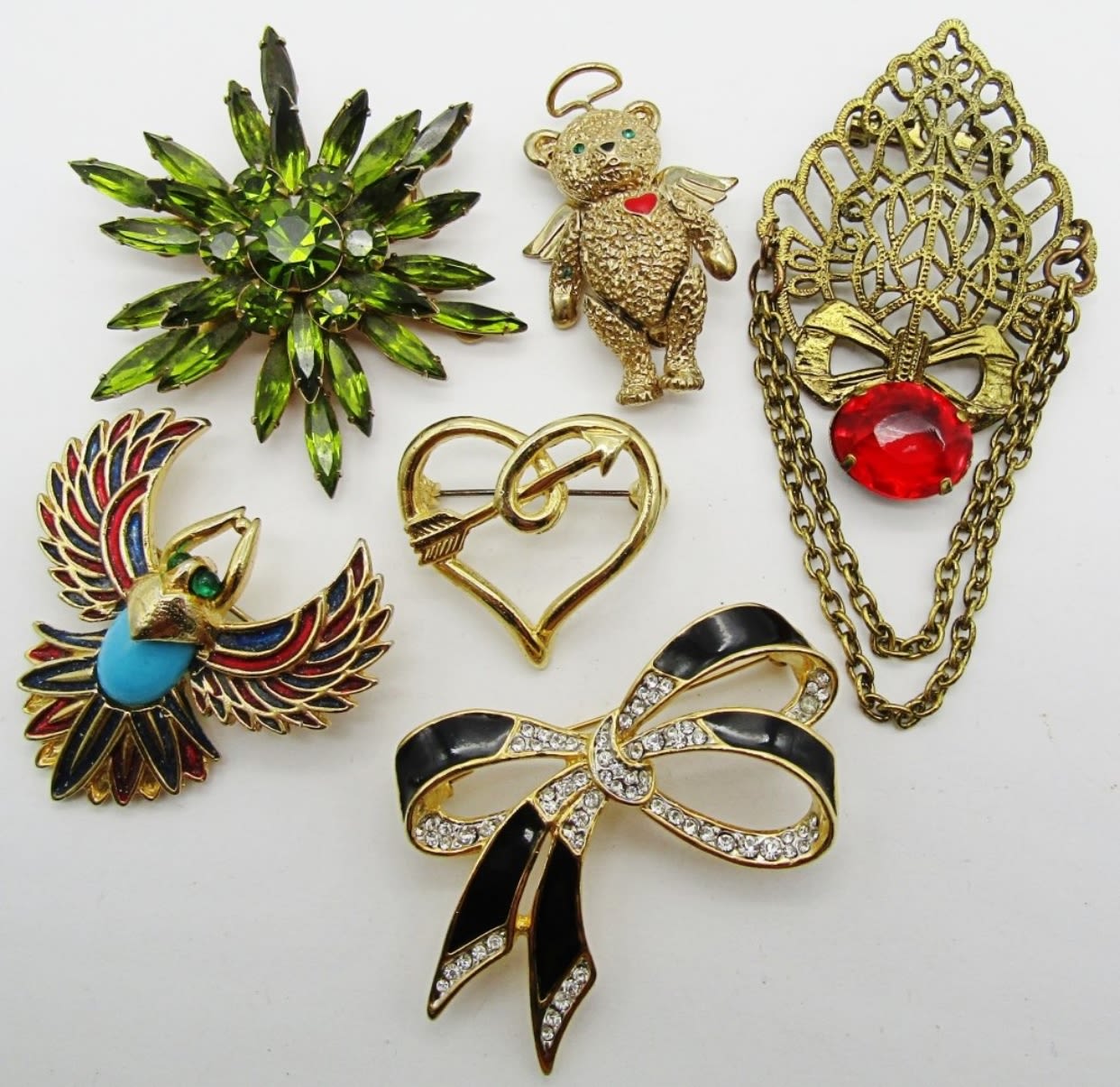 ALL ARE 2IN OR UNDER, 1- BATYA 1996 BEAR (MOVABLE PARTS), 1 EGYPTIAN STYLE BROOCH, 1 HEART, A BOW WITH BLACK INLAY AND CLEAR STONES, 1 GREEN STONE FLOWER, 1 BROOCH W A RED STONE