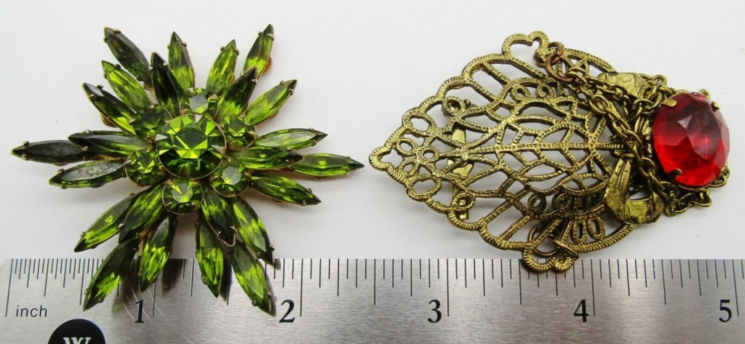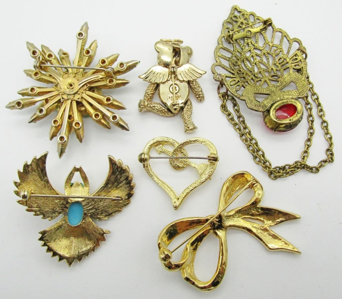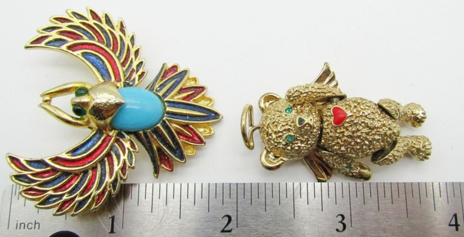 ALL ARE 2IN OR UNDER, 1- BATYA 1996 BEAR (MOVABLE PARTS), 1 EGYPTIAN STYLE BROOCH, 1 HEART, A BOW WITH BLACK INLAY AND CLEAR STONES, 1 GREEN STONE FLOWER, 1 BROOCH W A RED STONE