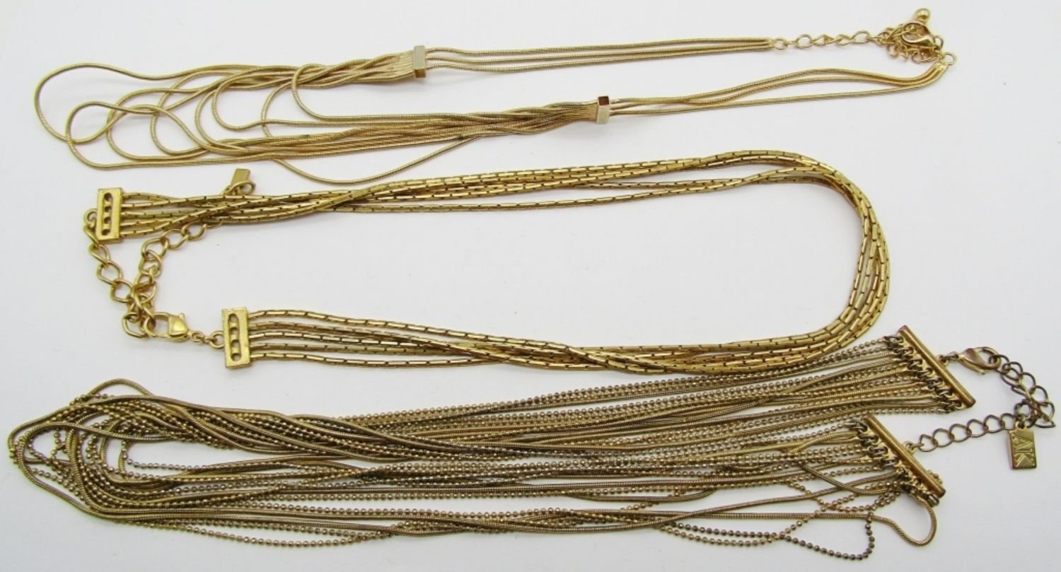 LENGTHS 17, 18, AND 19IN LONG, LOBSTER CLASP AND ALL ADJUSTABLE, 1 SNAKE STYLE CHAIN, 1 SNAKE AND BALL CHAIN, AND 1 BOX CHAIN