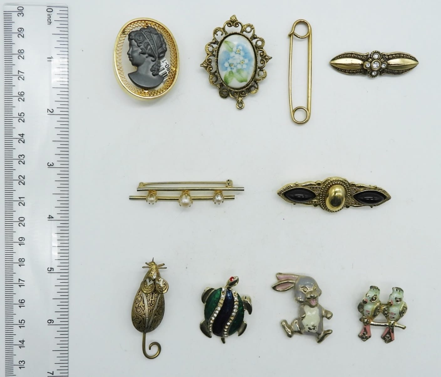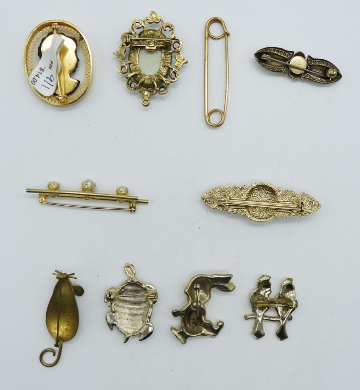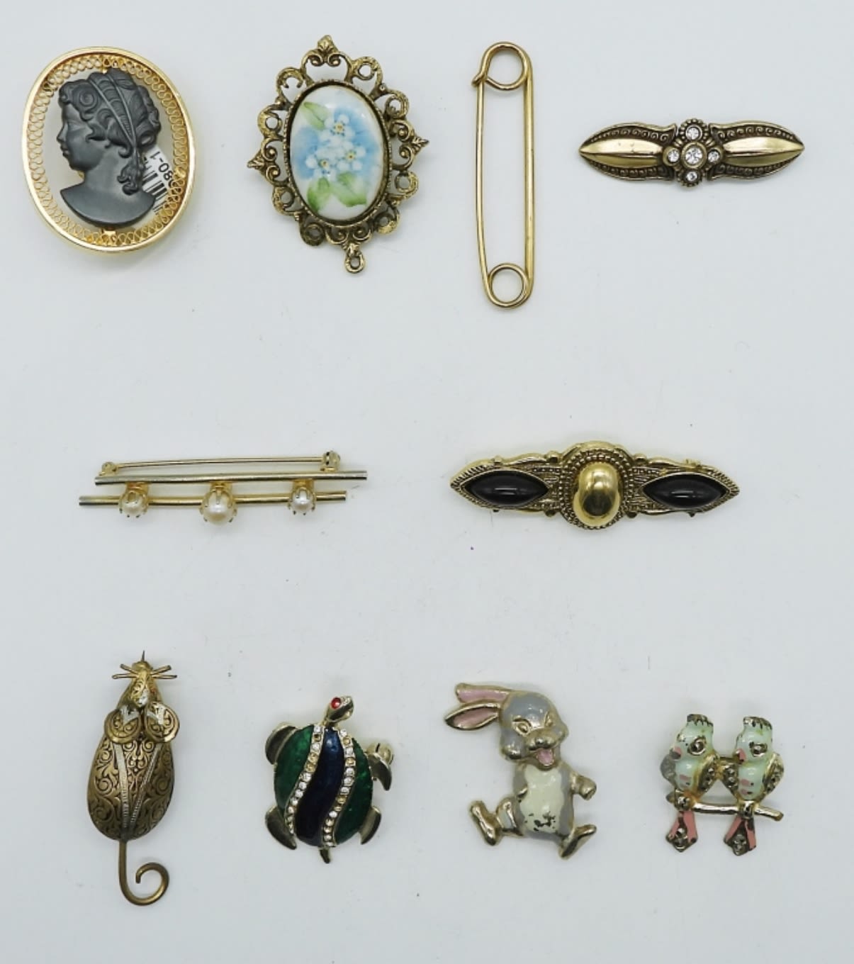 ALL 2IN OR UNDER IN SIZE, a cameo, flower, love birds, bunny, pin, a turtle, mouse, black onyx stone, faux pearl, and a clear stone brooch